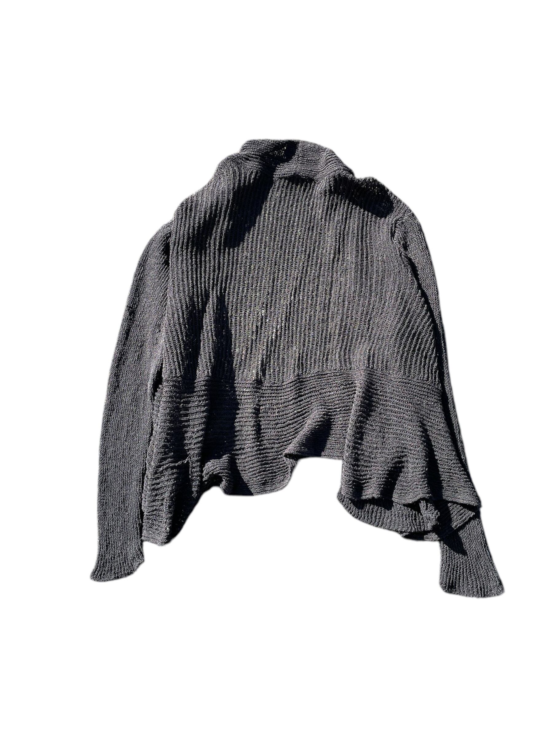 This cardigan is similarly made of wool yarns, mainly linen, for the knit material.