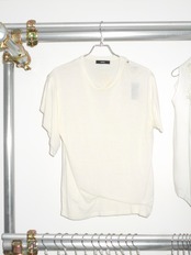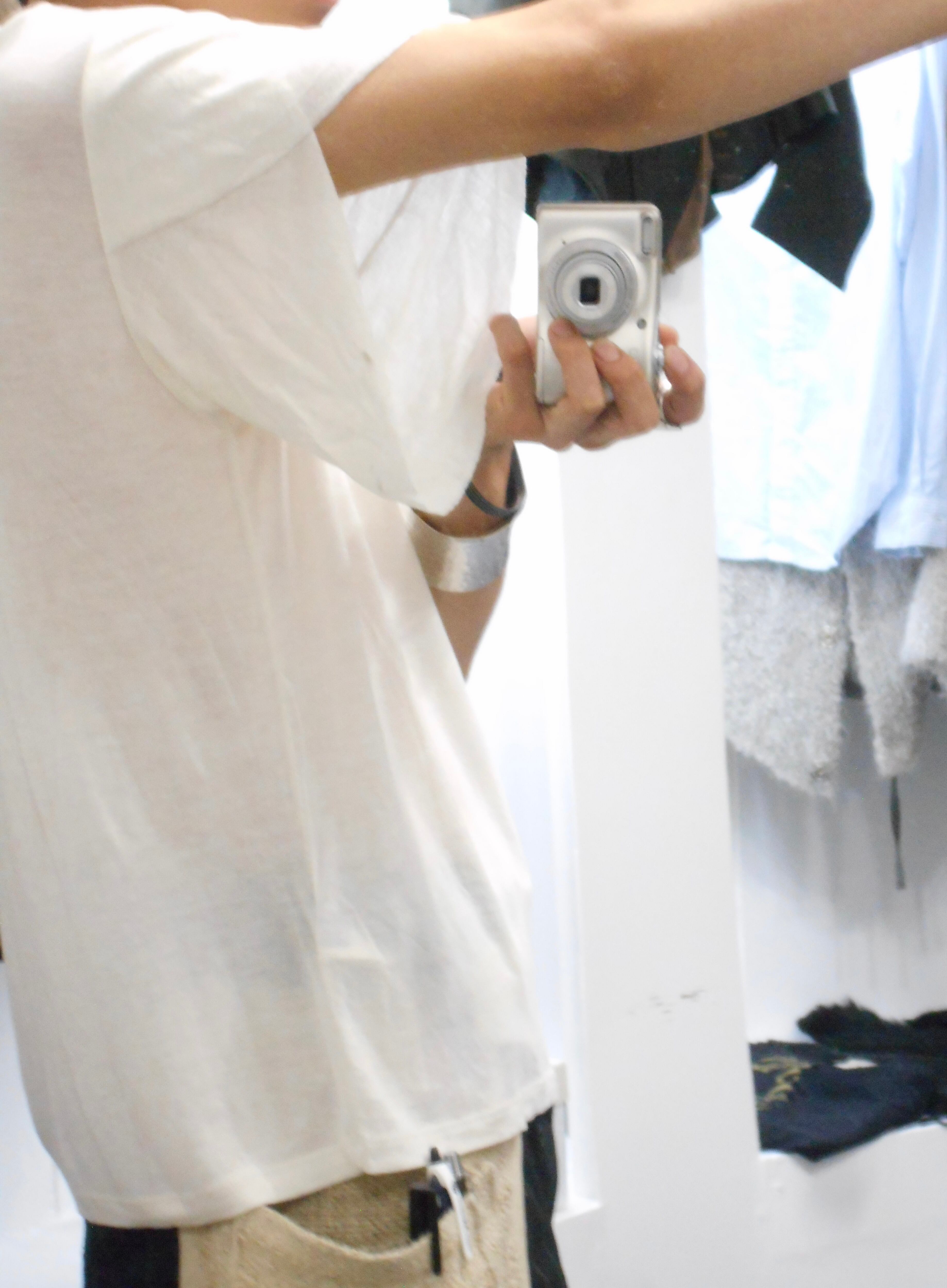 ただの白のTシャツというわけでは全くなく、袖のパターンがサークル状にカットされていることで綺麗な落ち方のするシルエットを作り出しています。