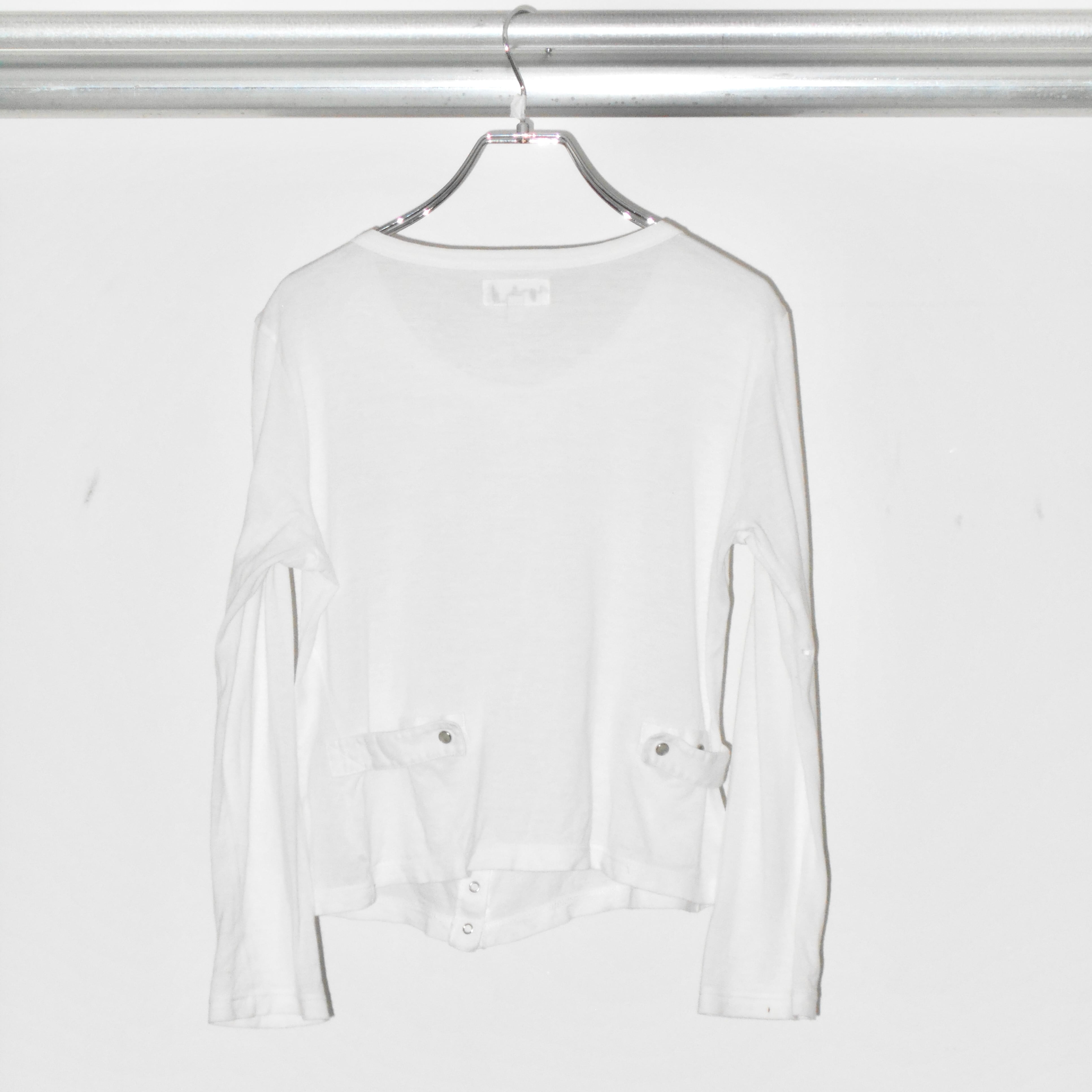 こちらのアイテムはその代表的なアイテムの一つで、比較的薄手な生地とやや斜めに配置されたスナップボタンが特徴的な一着となっています。生地感はどちらかと言うとTシャツに近いような生地感となっており、夏の終わりから秋にかけて特に着ていただきやすい一着になっているかと思います。