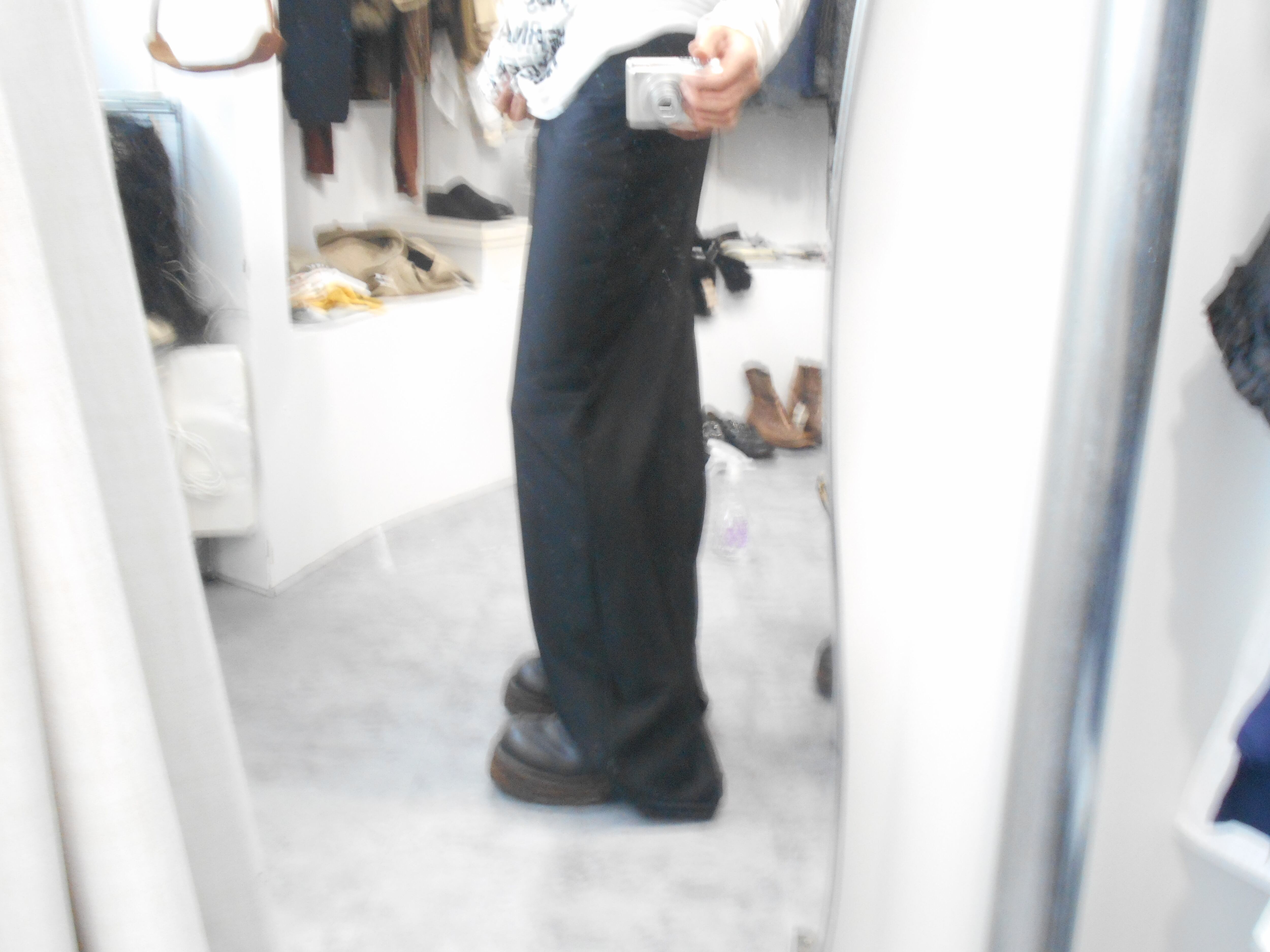 掲載している着画では比較的大きいブーツに裾の前面を差し込むことで裾野ワイド感がわかりやすくなっています。もしブーツなどをお持ちでしたらそのような合わせが最適ではないかと思います。