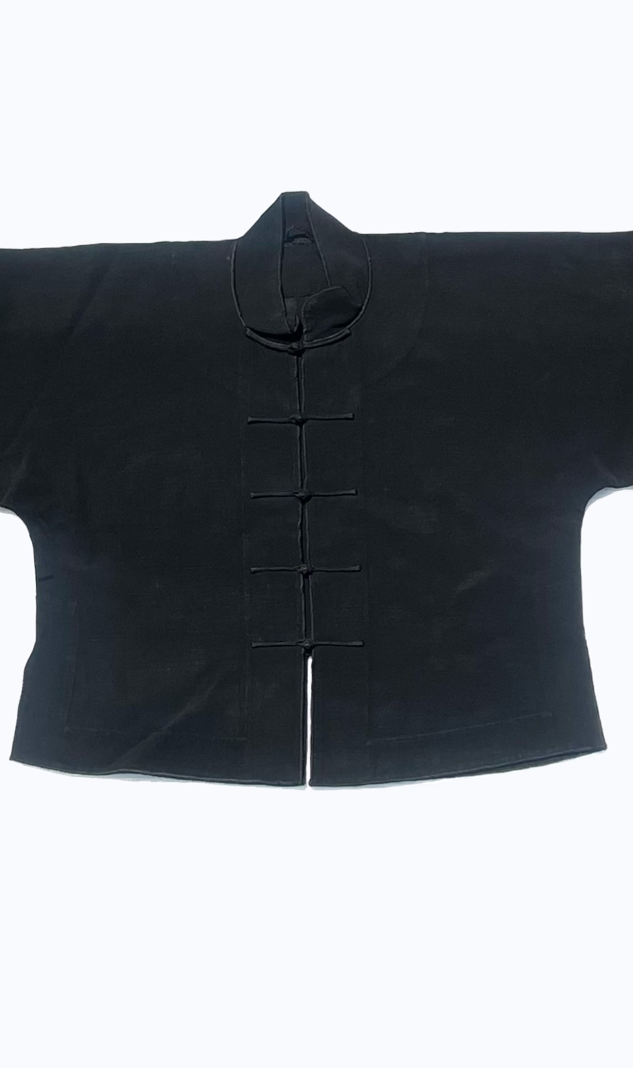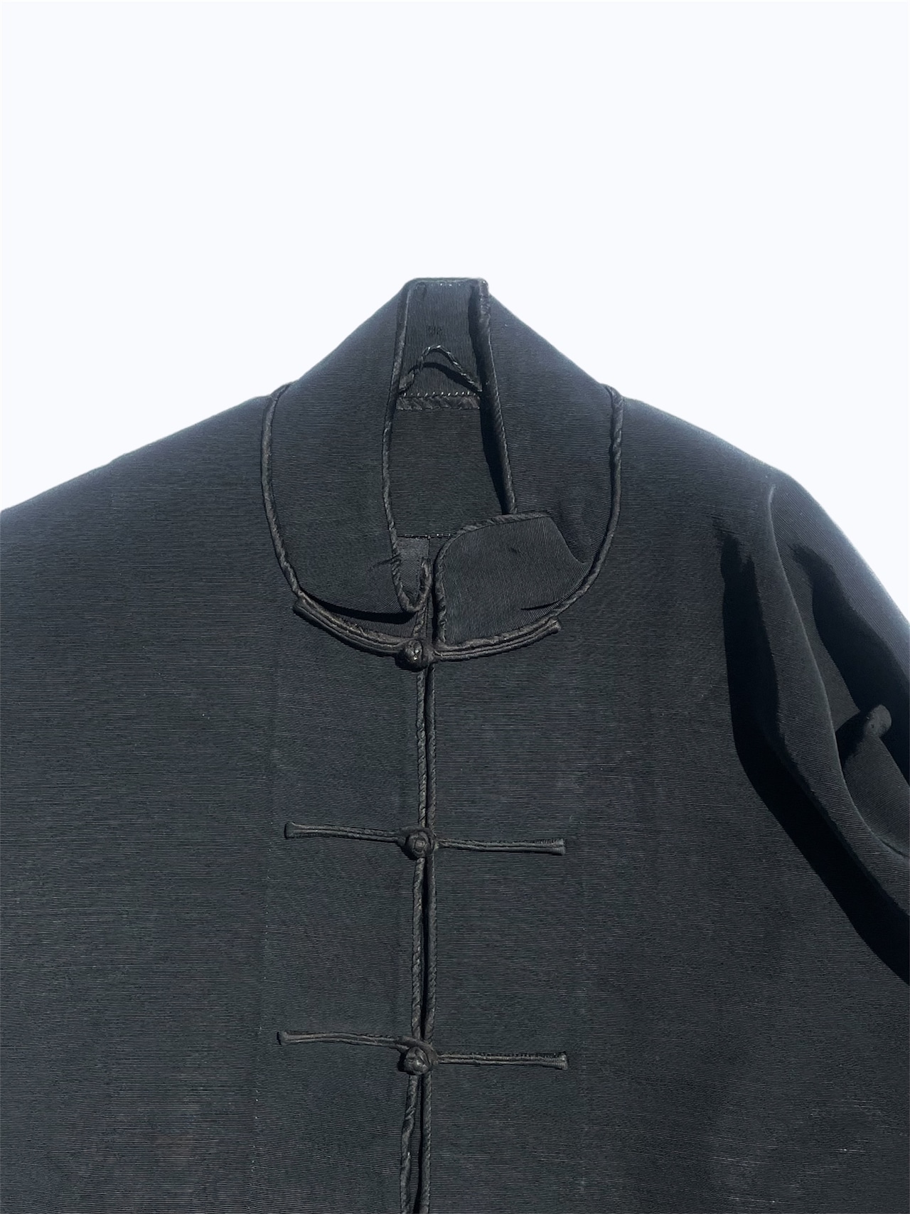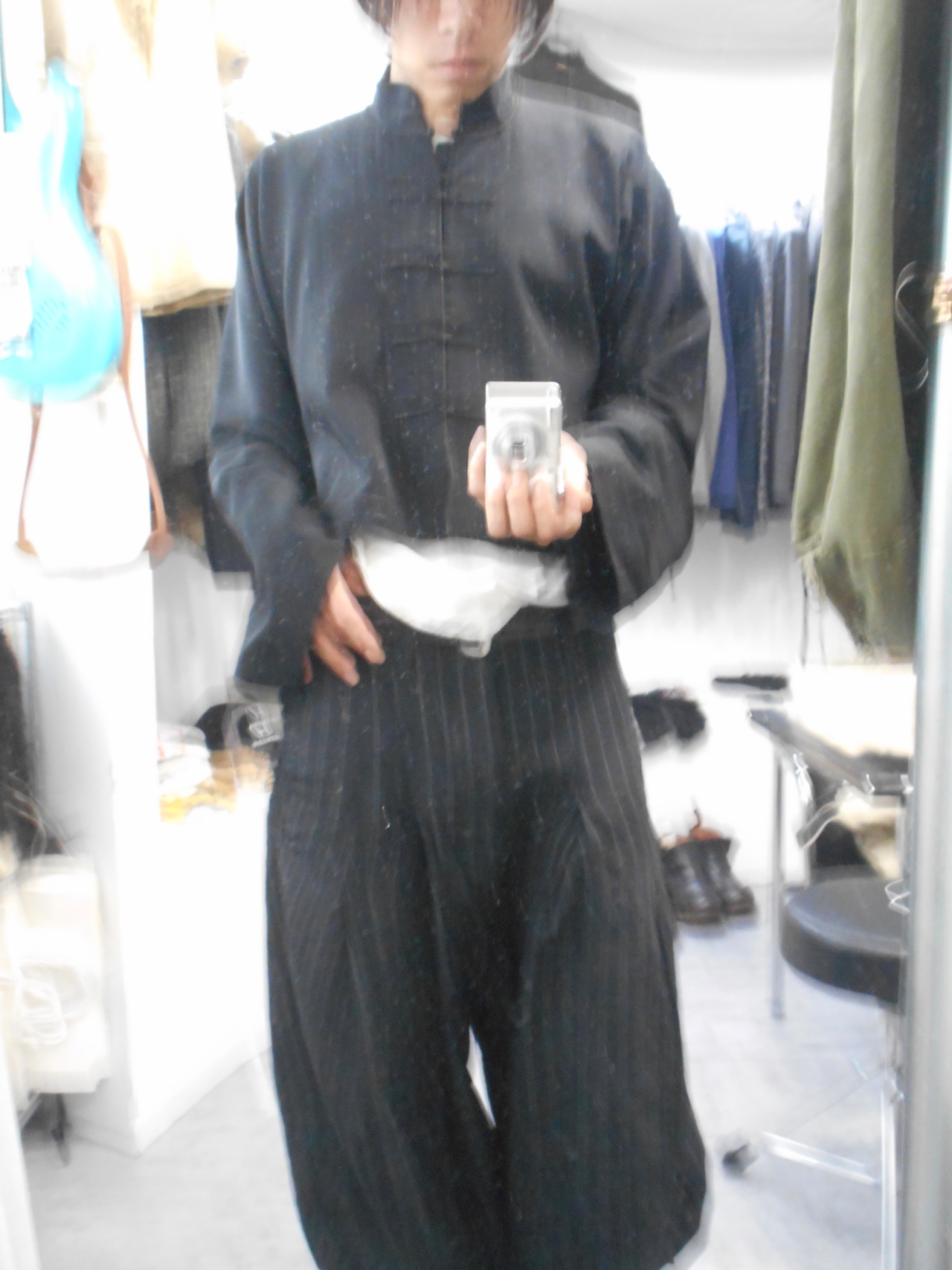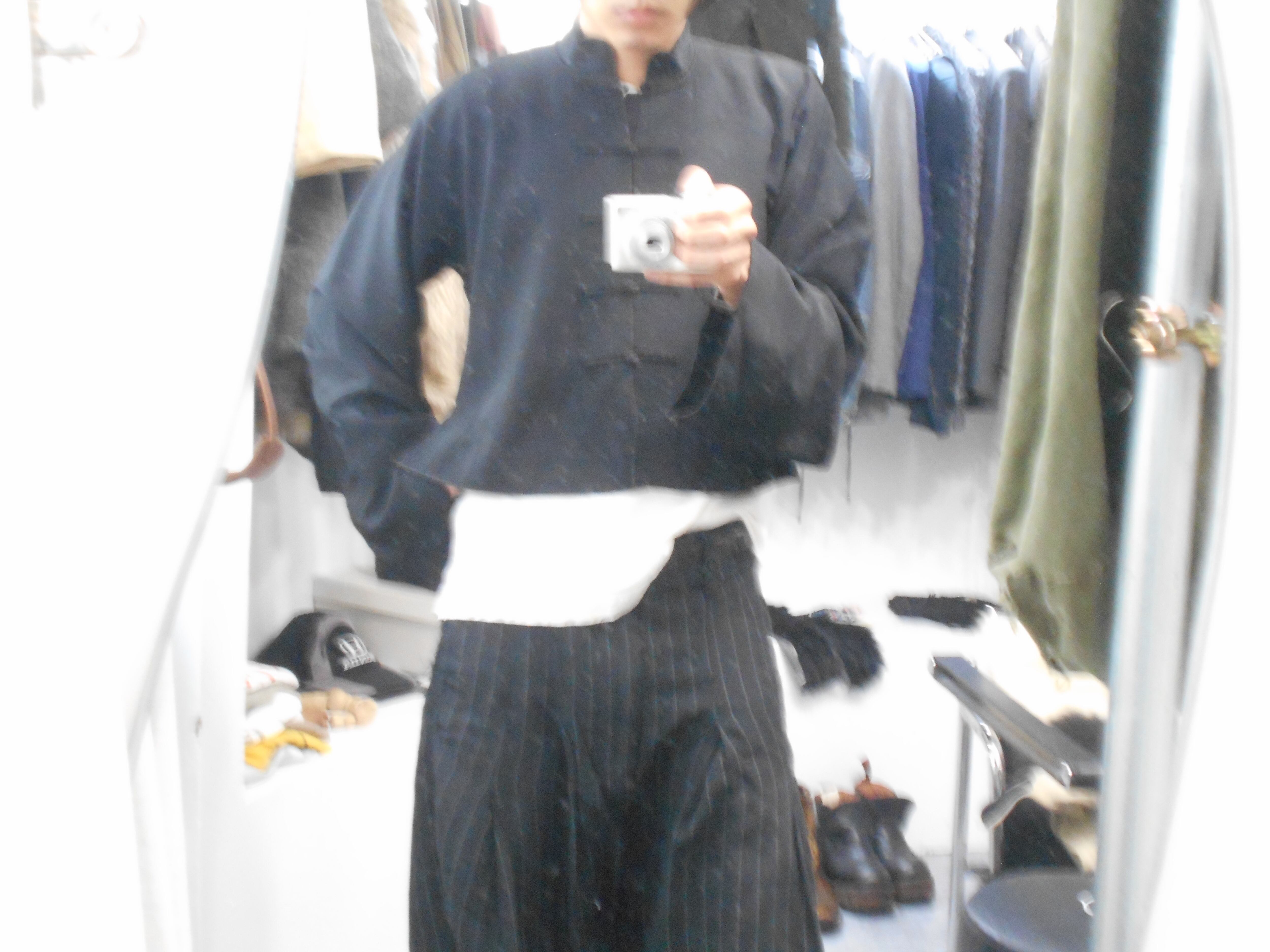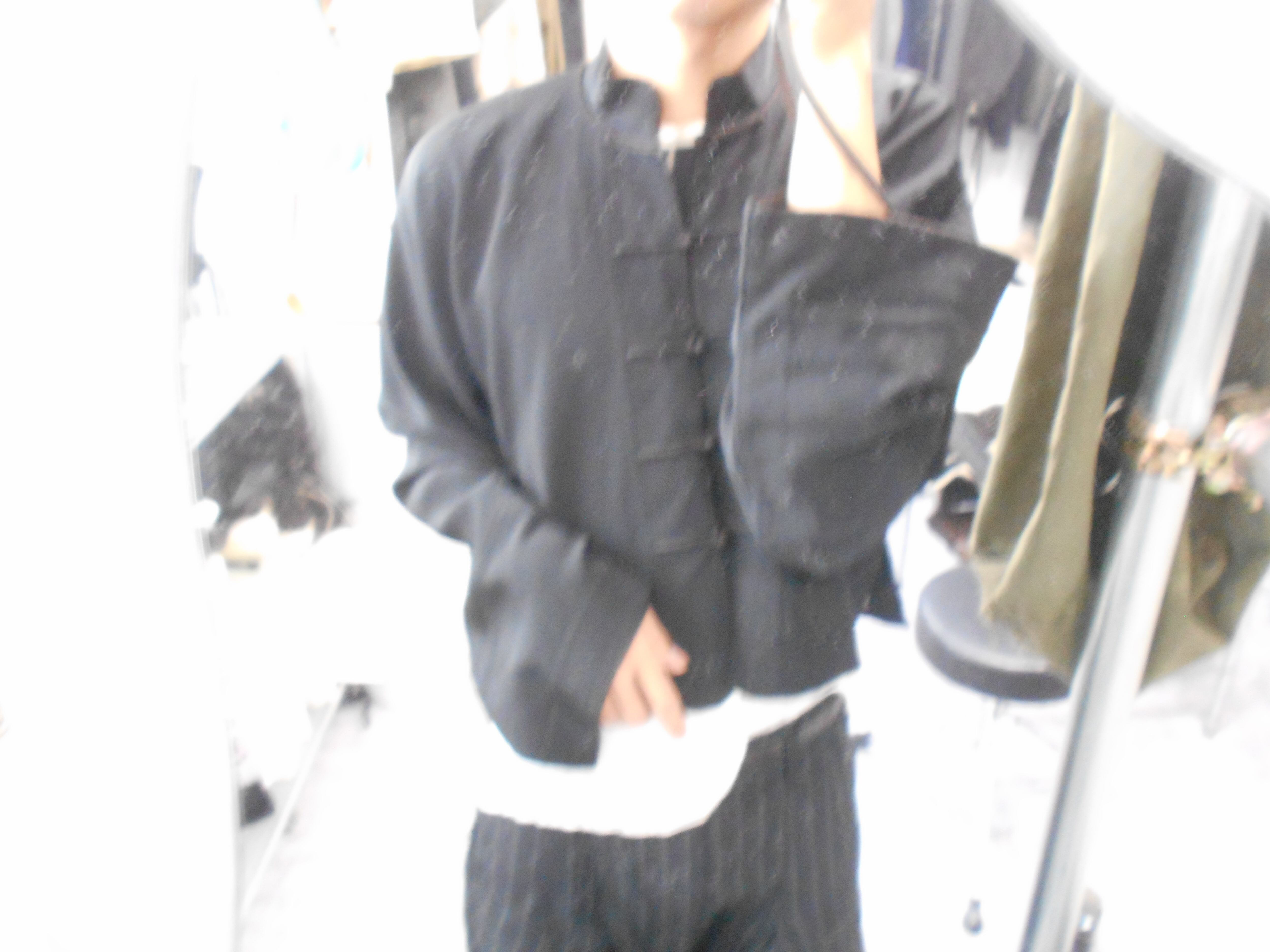 ジャケットとして作られていながら、そのパターンは特殊に作られており、本来であれば袖と胴は分けて作られるところを、それは敢えてなのか平面的に胴から袖にかけて地続きで作られています。このアイテムの本来の出自が不明すぎるため、西洋のものか東洋のものかは判断しかねますが、チャイナシャツの型を利用しているためか、この平面さは一般的に言われる東洋的(日本的)なパターンのようにも感じられます。