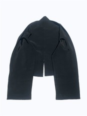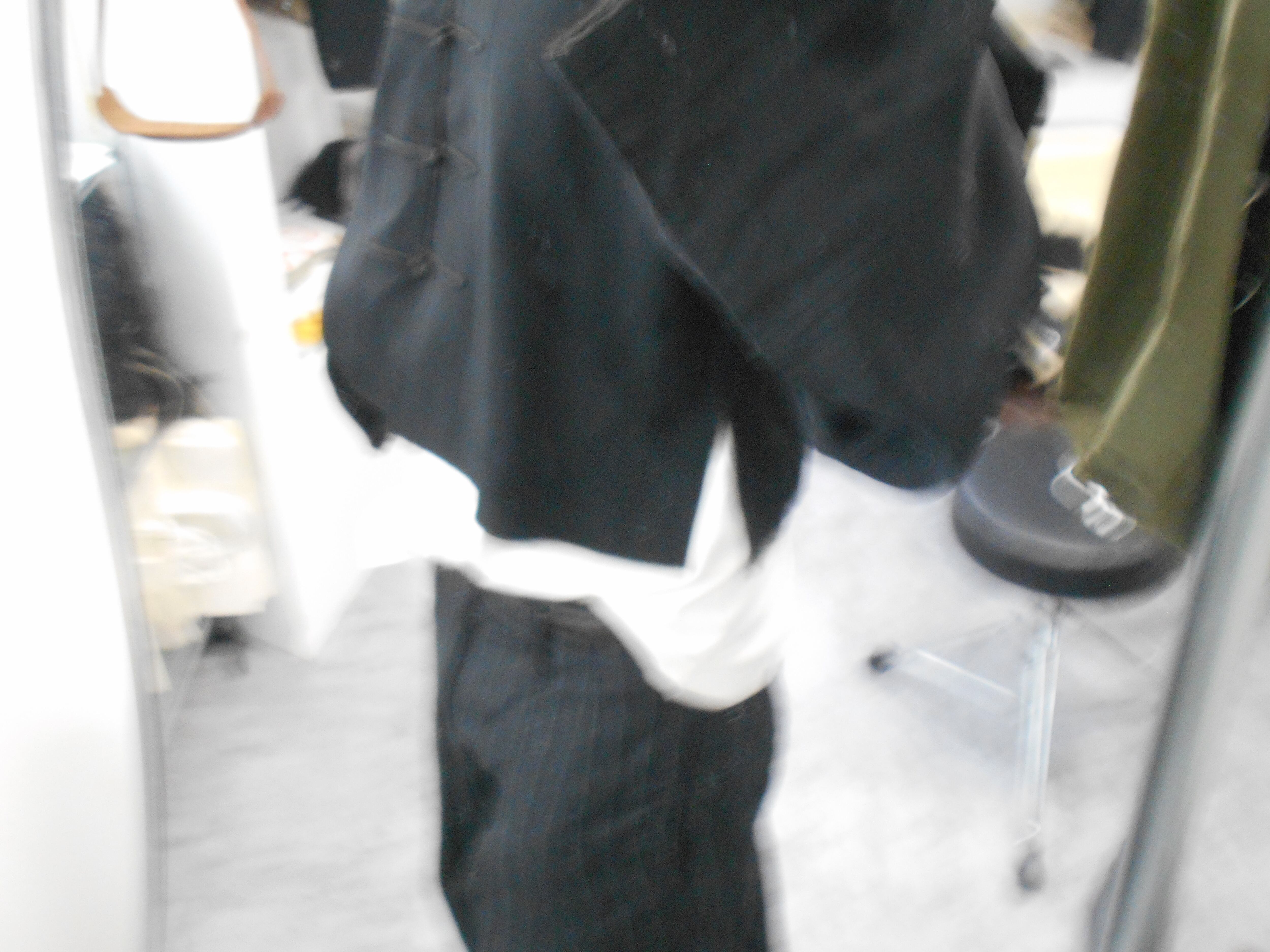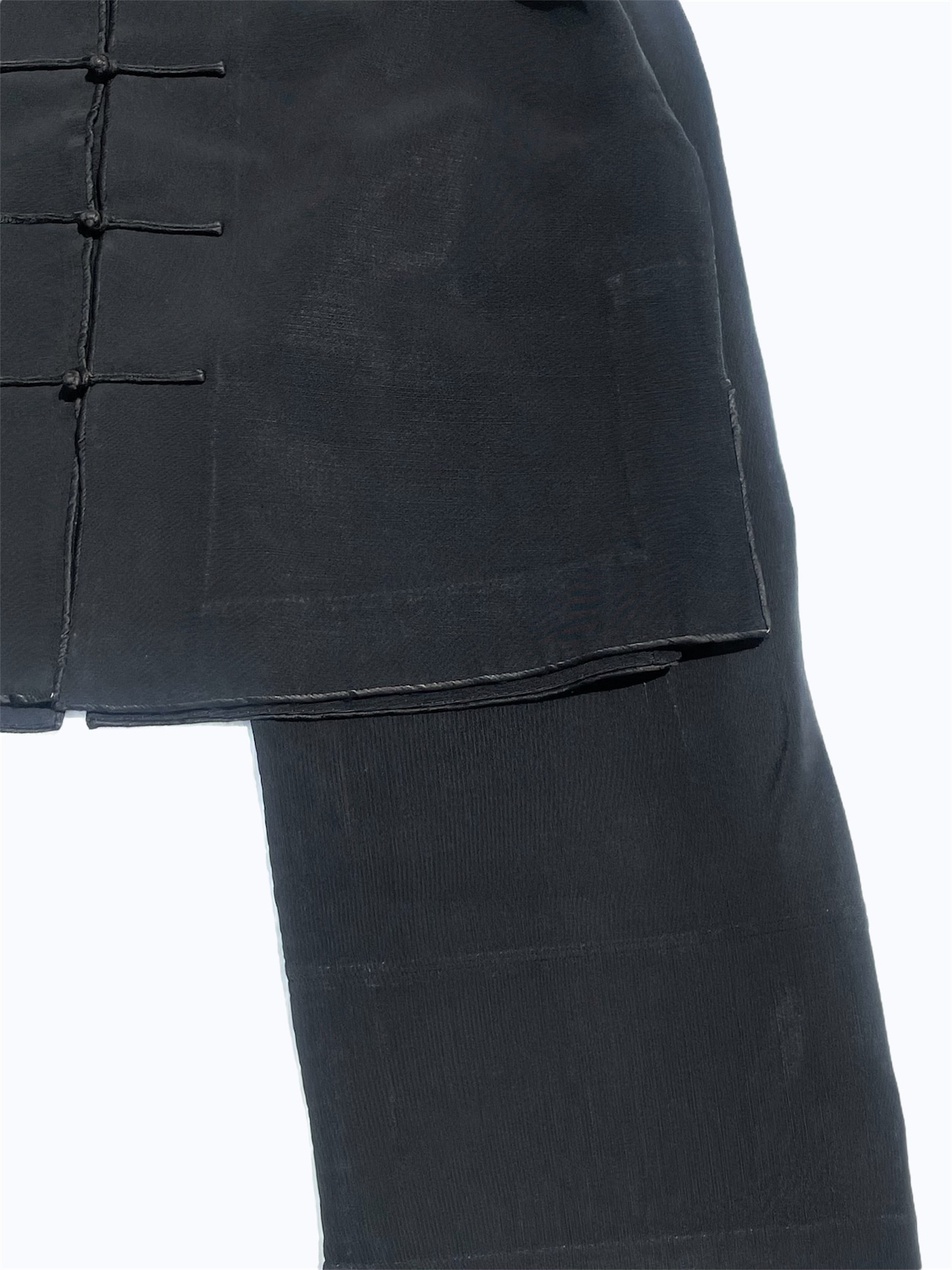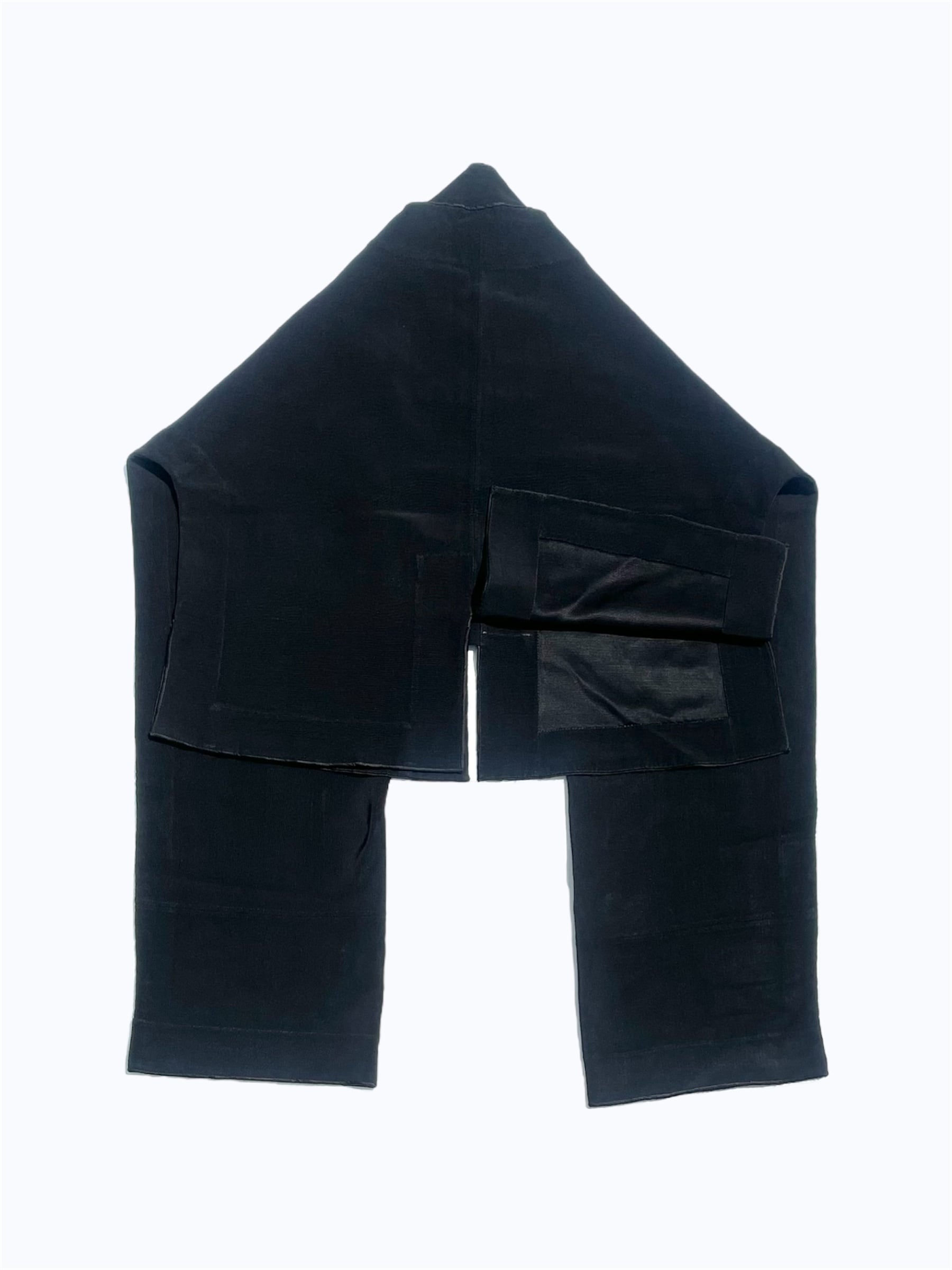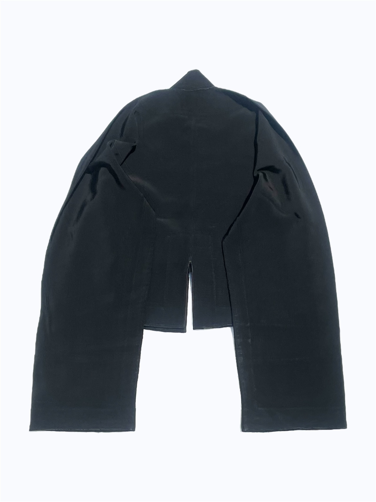 ジャケットとして作られていながら、そのパターンは特殊に作られており、本来であれば袖と胴は分けて作られるところを、それは敢えてなのか平面的に胴から袖にかけて地続きで作られています。このアイテムの本来の出自が不明すぎるため、西洋のものか東洋のものかは判断しかねますが、チャイナシャツの型を利用しているためか、この平面さは一般的に言われる東洋的(日本的)なパターンのようにも感じられます。