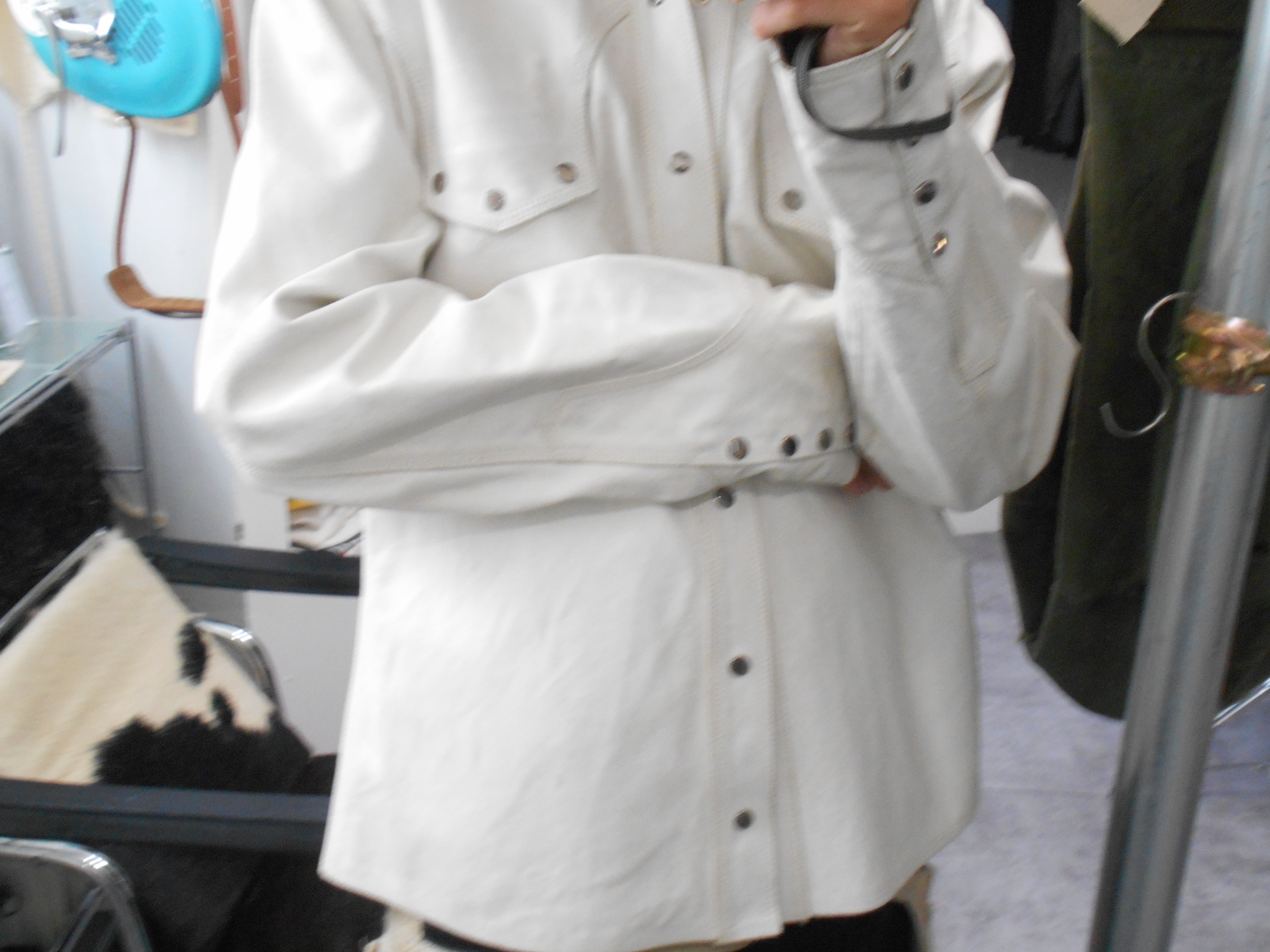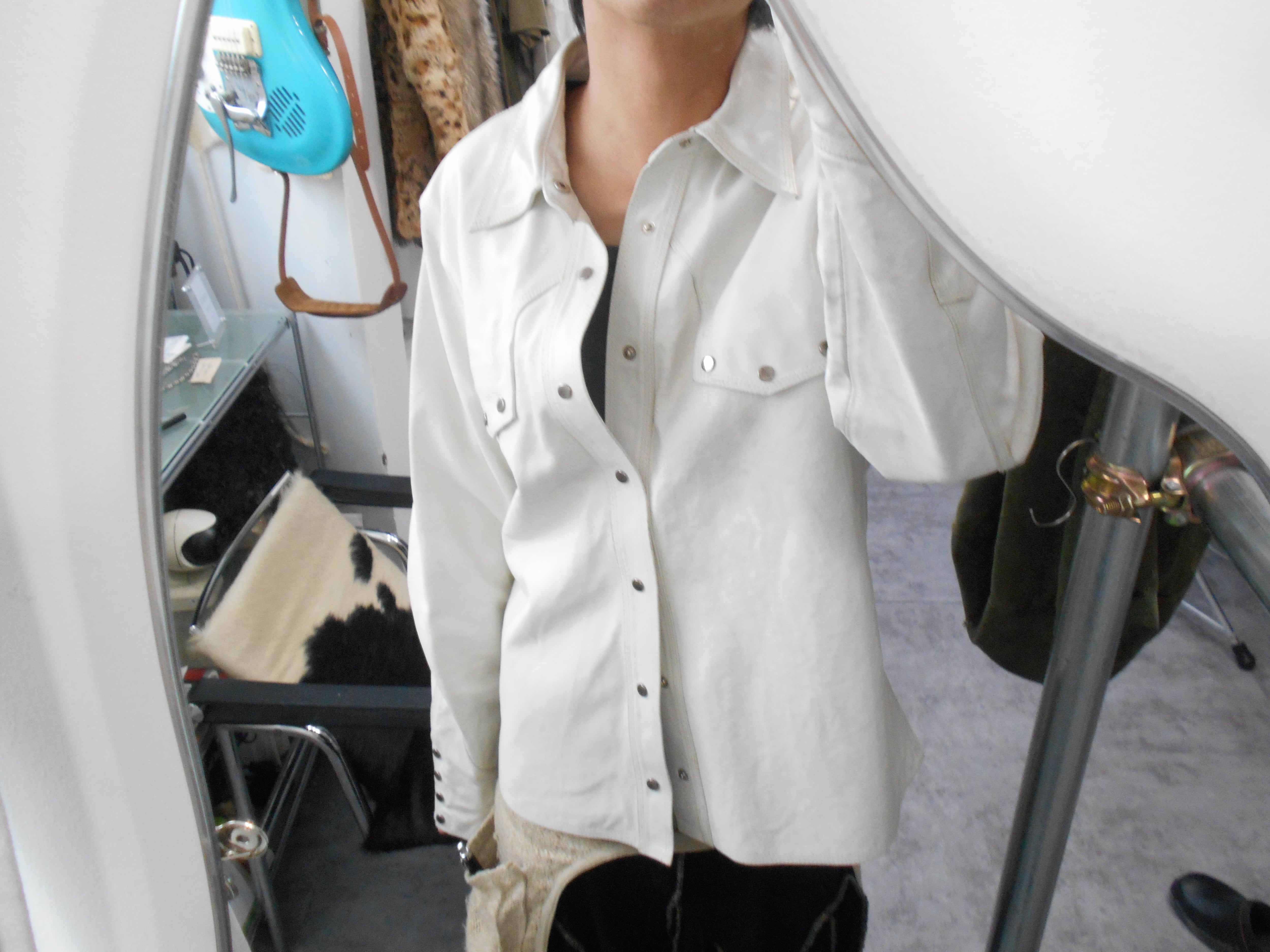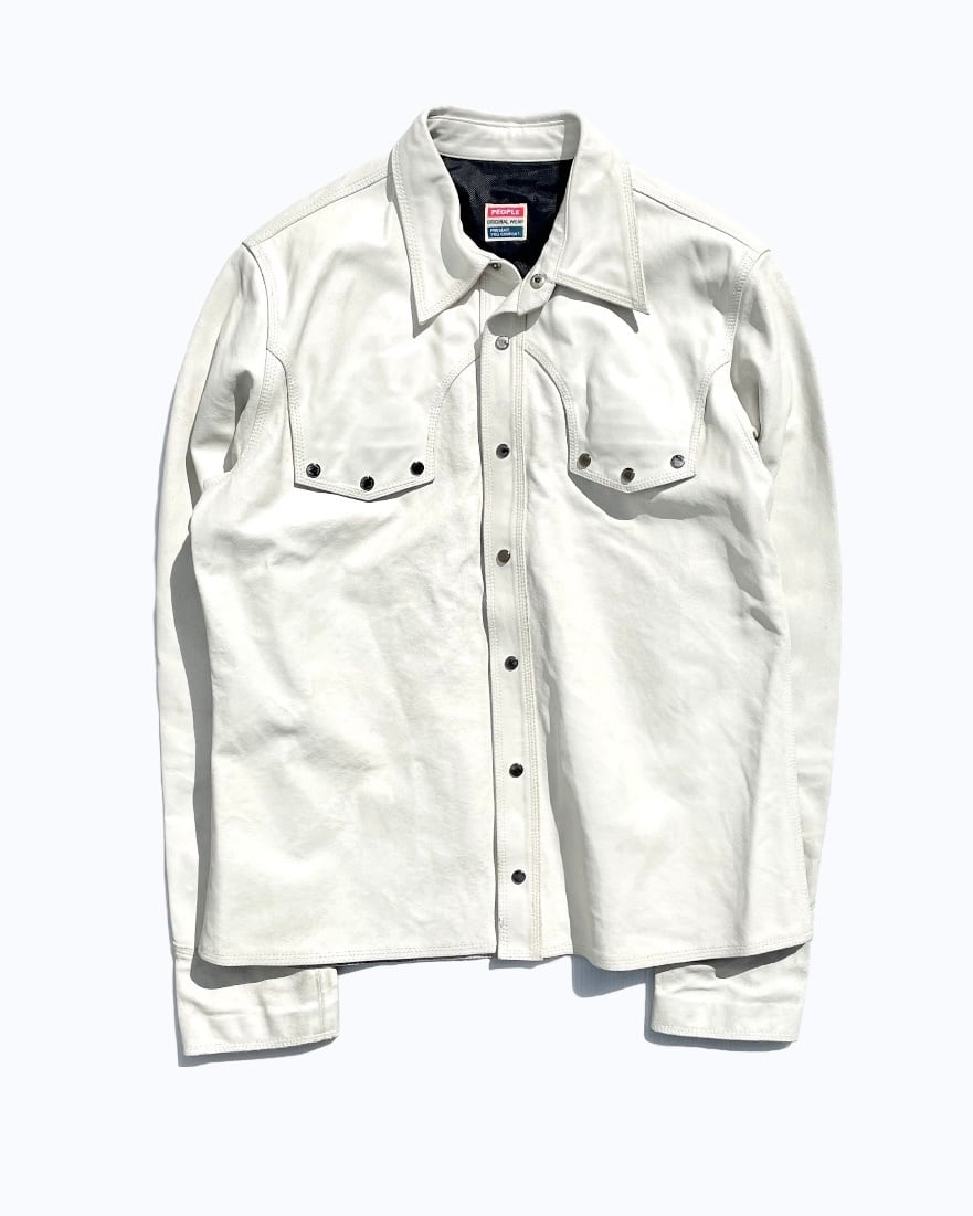 個人的にこのアイテムに特に面白さを感じた点としては、レザージャケットでありながら、ホワイトのカラーをペイントか何かは不明ですが使用している点でした。ホワイトのレザーはここ数年探している物なのですが、仮に見つけても1980年代のもったりとした物か、あまり手の届きにくいデザイナーレーベルのものかといったところでした。その点、現代的に着られる白のレザージャケットというものに希少性を感じさせられます。