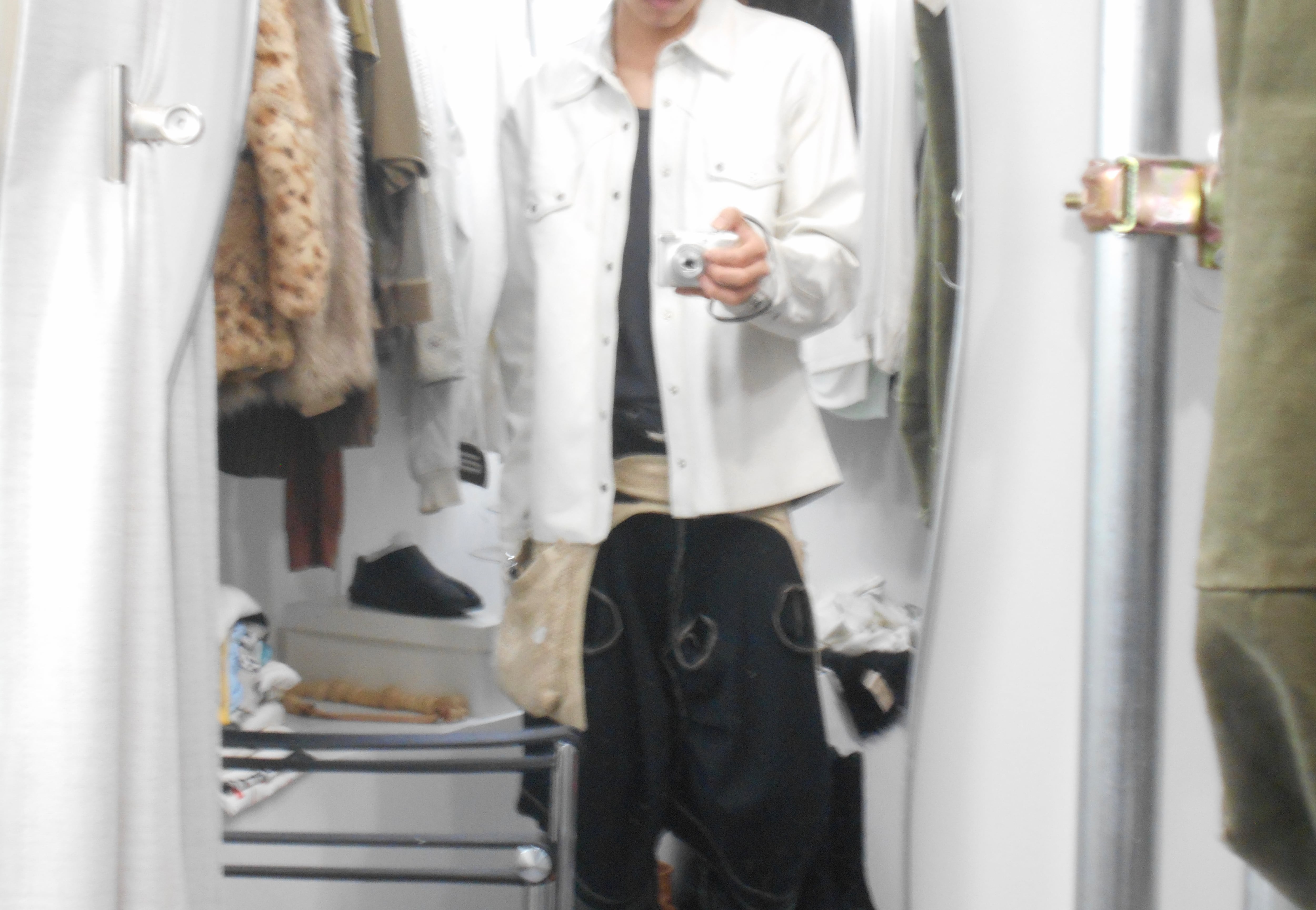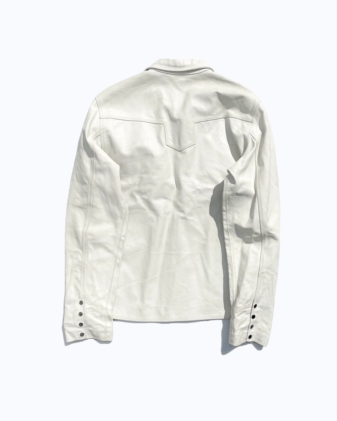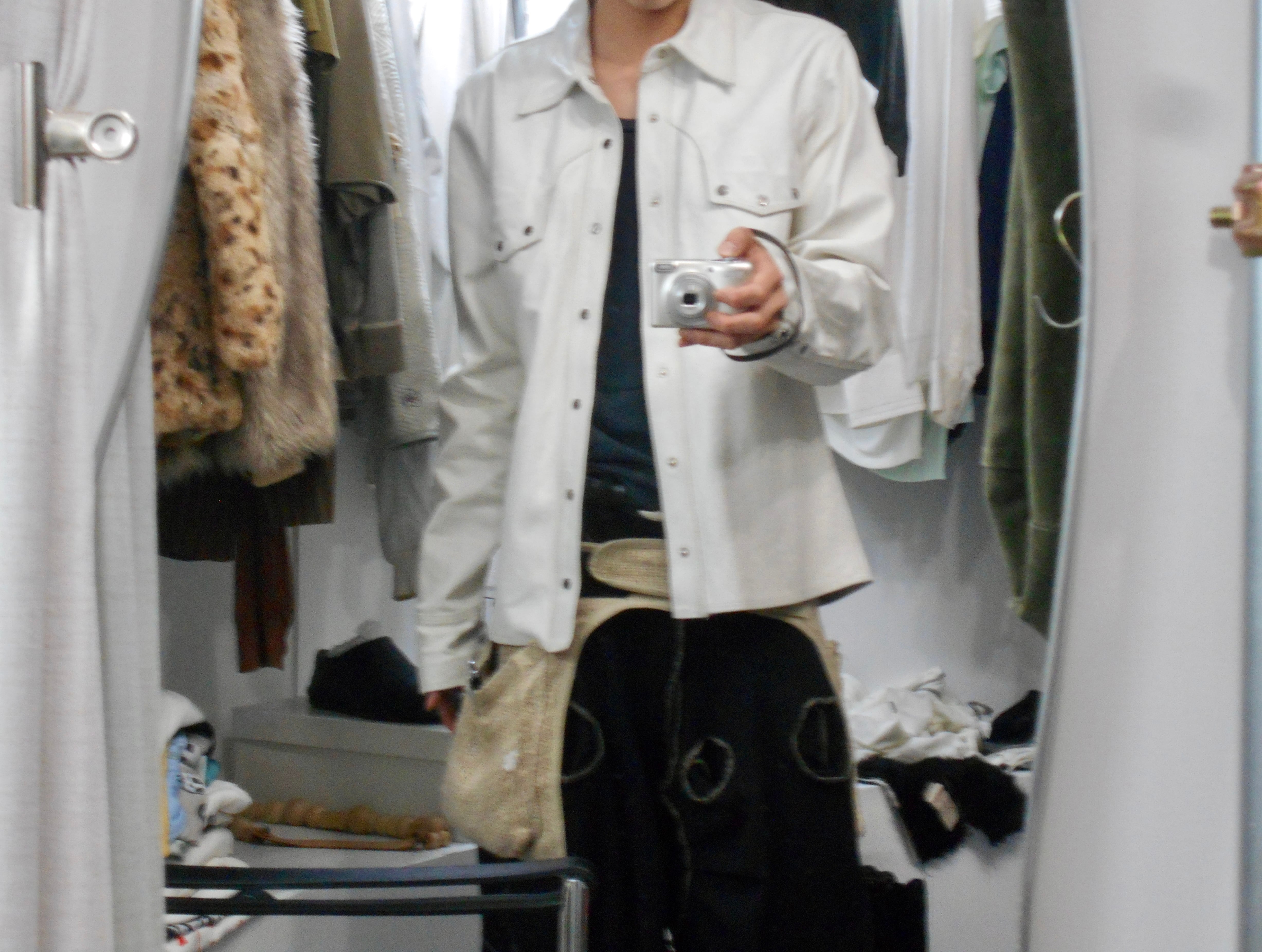 個人的にこのアイテムに特に面白さを感じた点としては、レザージャケットでありながら、ホワイトのカラーをペイントか何かは不明ですが使用している点でした。ホワイトのレザーはここ数年探している物なのですが、仮に見つけても1980年代のもったりとした物か、あまり手の届きにくいデザイナーレーベルのものかといったところでした。その点、現代的に着られる白のレザージャケットというものに希少性を感じさせられます。
