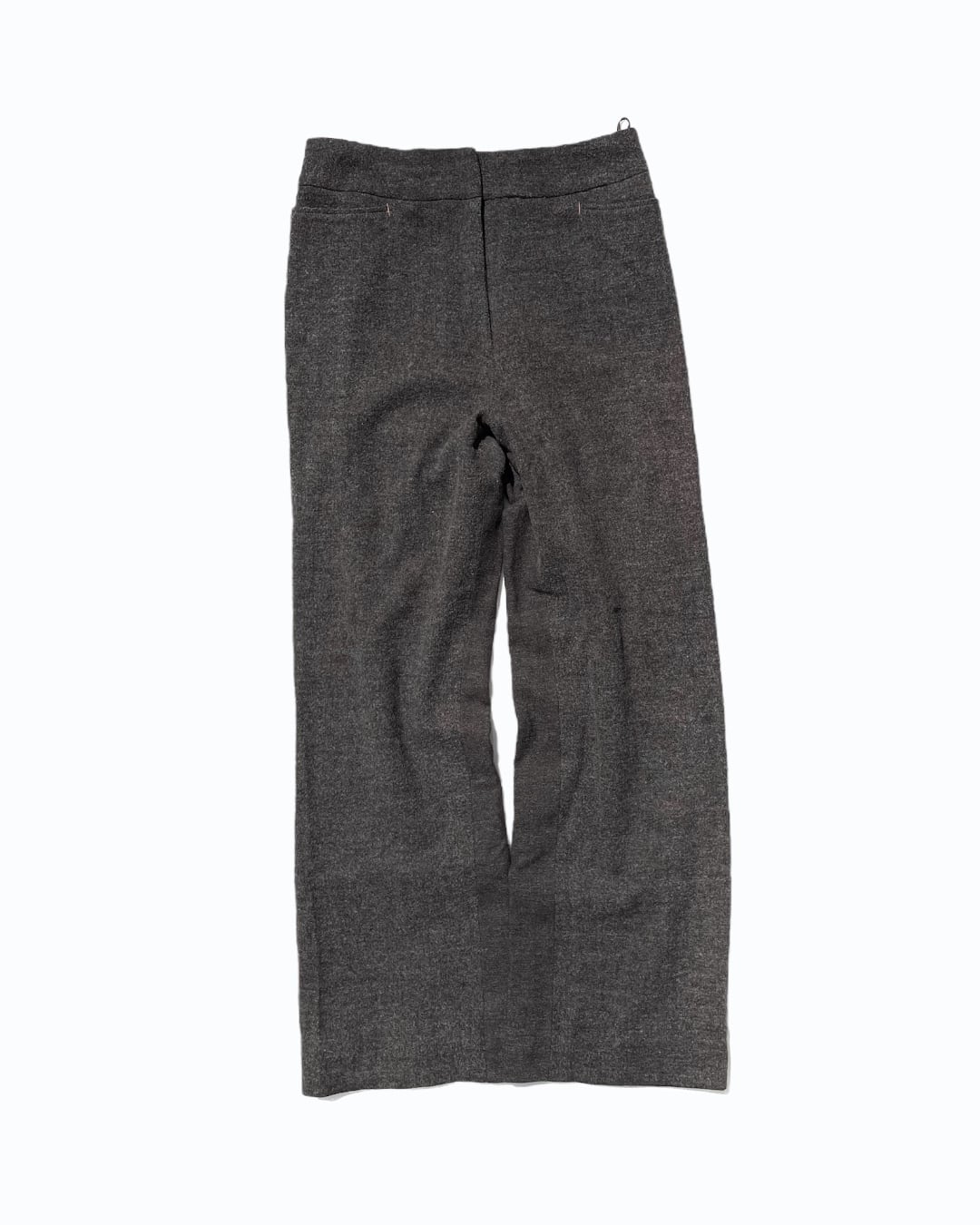 一見すると普通のスラックスのように見過ごしてしまいそうなアイテムですが、細部に着目してみると、裏地の作りや異なる色のステッチ遣い、アンゴラ混紡のウールによる独特の柔らかさなど、偏愛の詰め込まれた一着のように感じられます。
