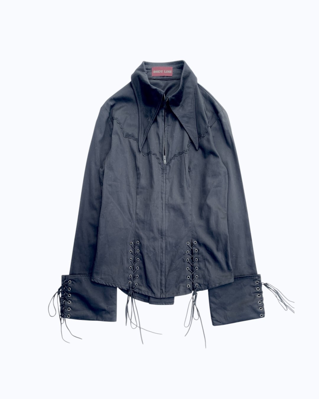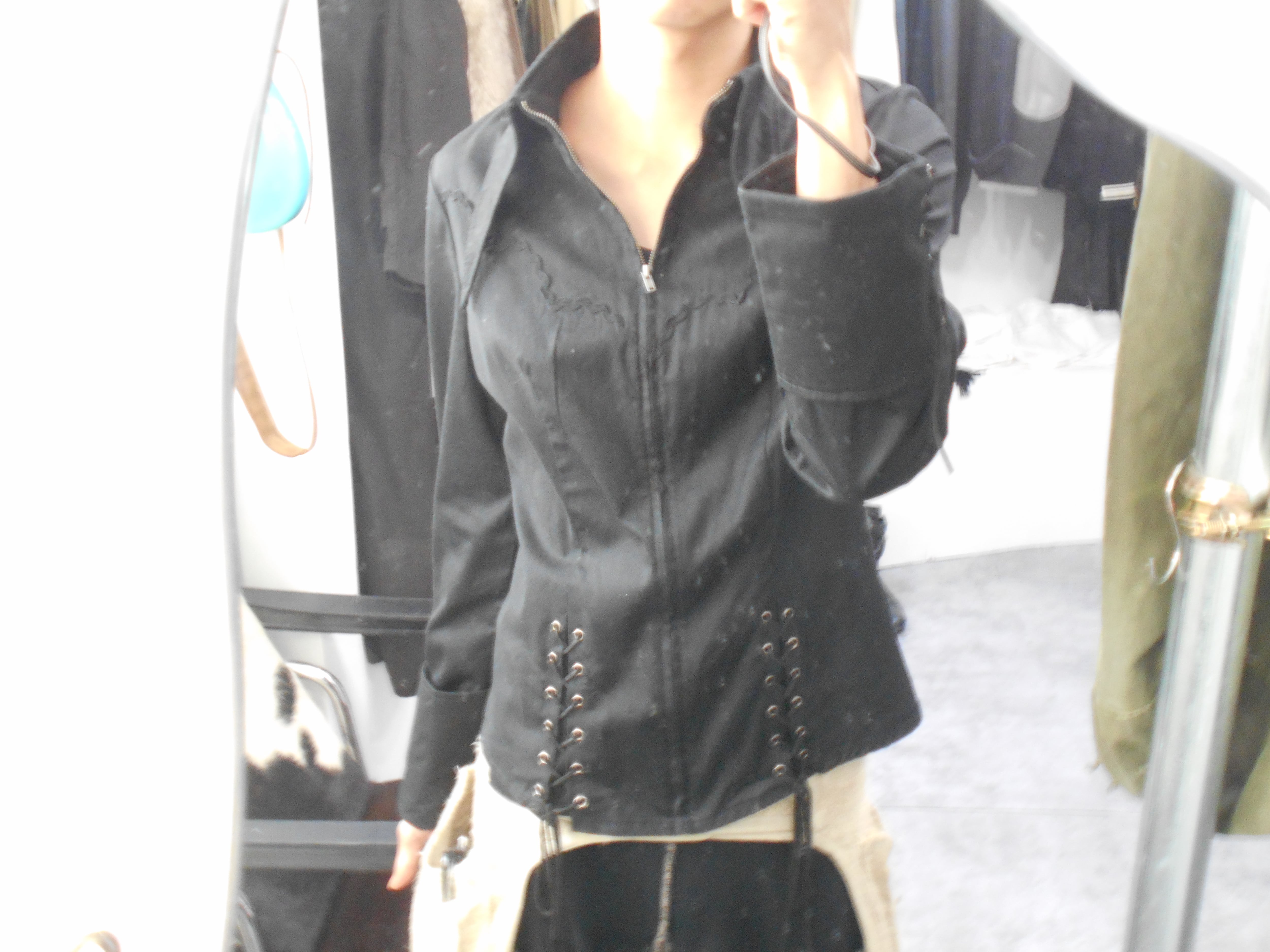百聞は一見にしかずなので、お写真を見ていただくのが一番なのですが、これでもかというほどのレースアップの詰め込まれた一着となっています。レースアップをここまで使いながらも、そのサイズ感は細身になりすぎることがなく、強くなりすぎない範囲内でゴシック的な表現のできる一着となっているかと思います。また、近年のゴシックの再評価の潮流に則って見てみても、現代的に着ることのできるゴシックなアイテムのように感じられます。