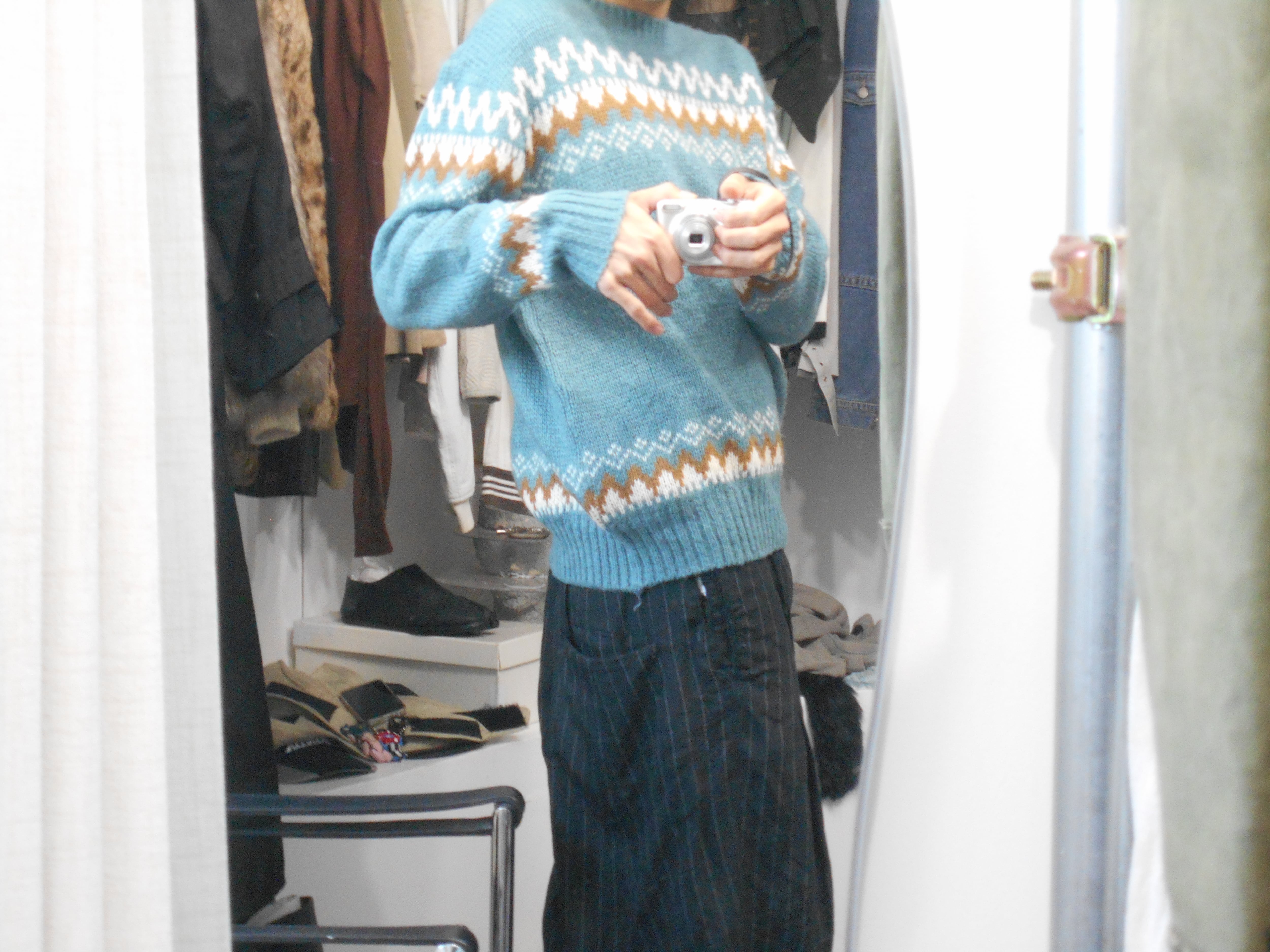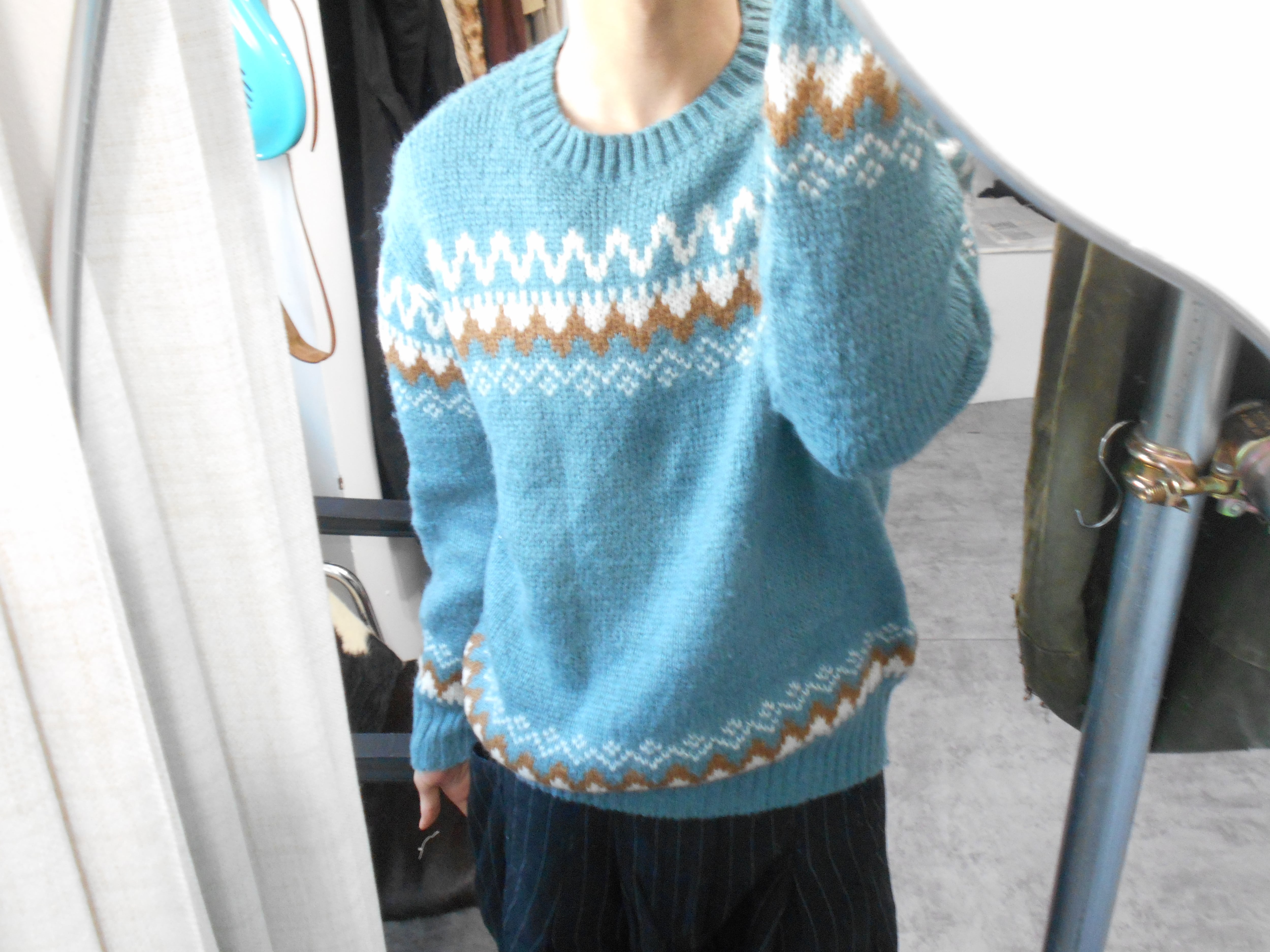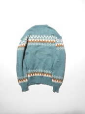 ユーロものらしくノルディックな柄を用いていながら、そのボディにはミントブルーのようなカラーを使用している変わり種になっています。個人的にこれまで見たことのあるノルディックセーターはボディにオフホワイトやクリーム色が使われたものが中心で、このカラーというのは初めてお目にかかりました。