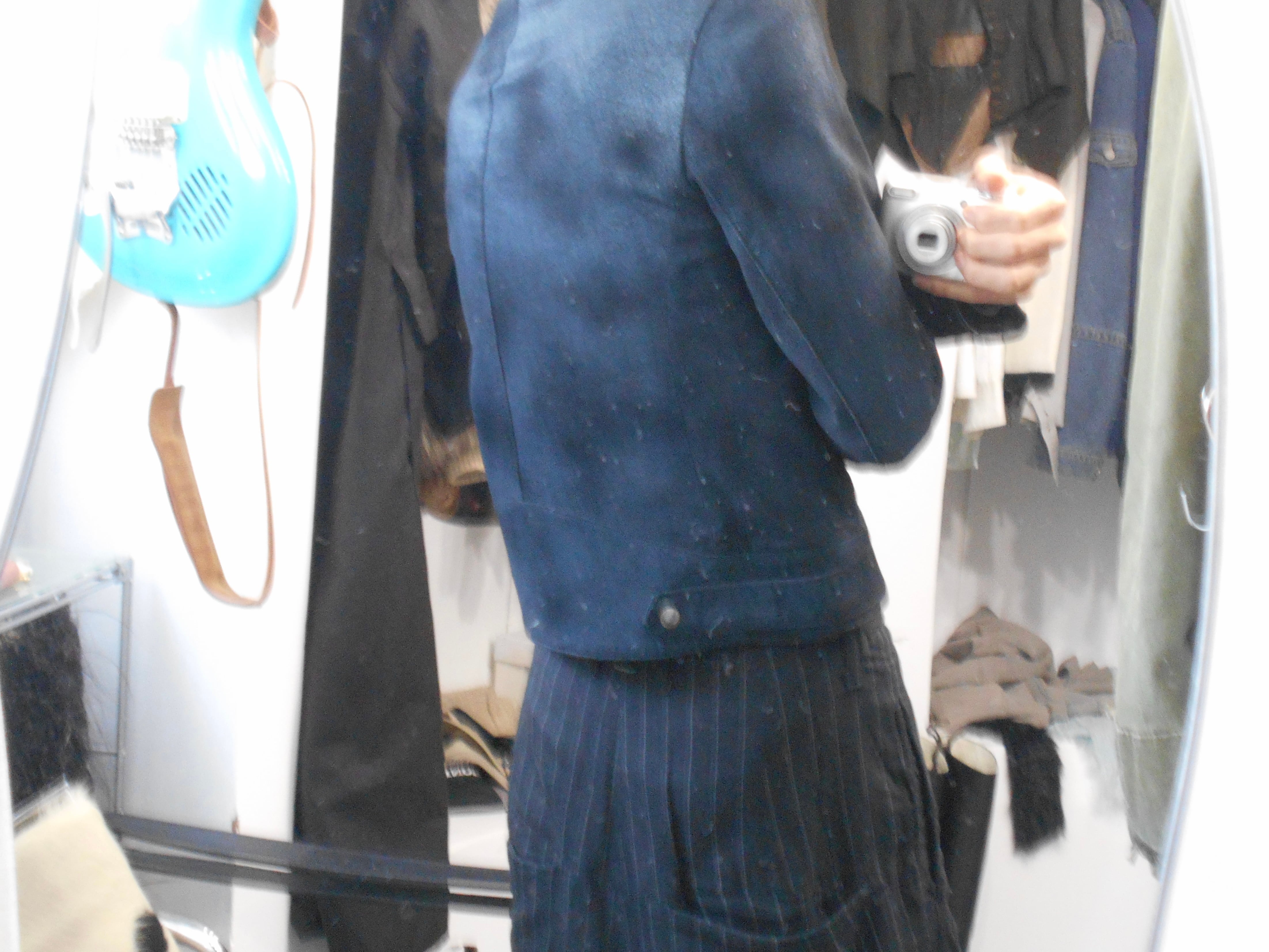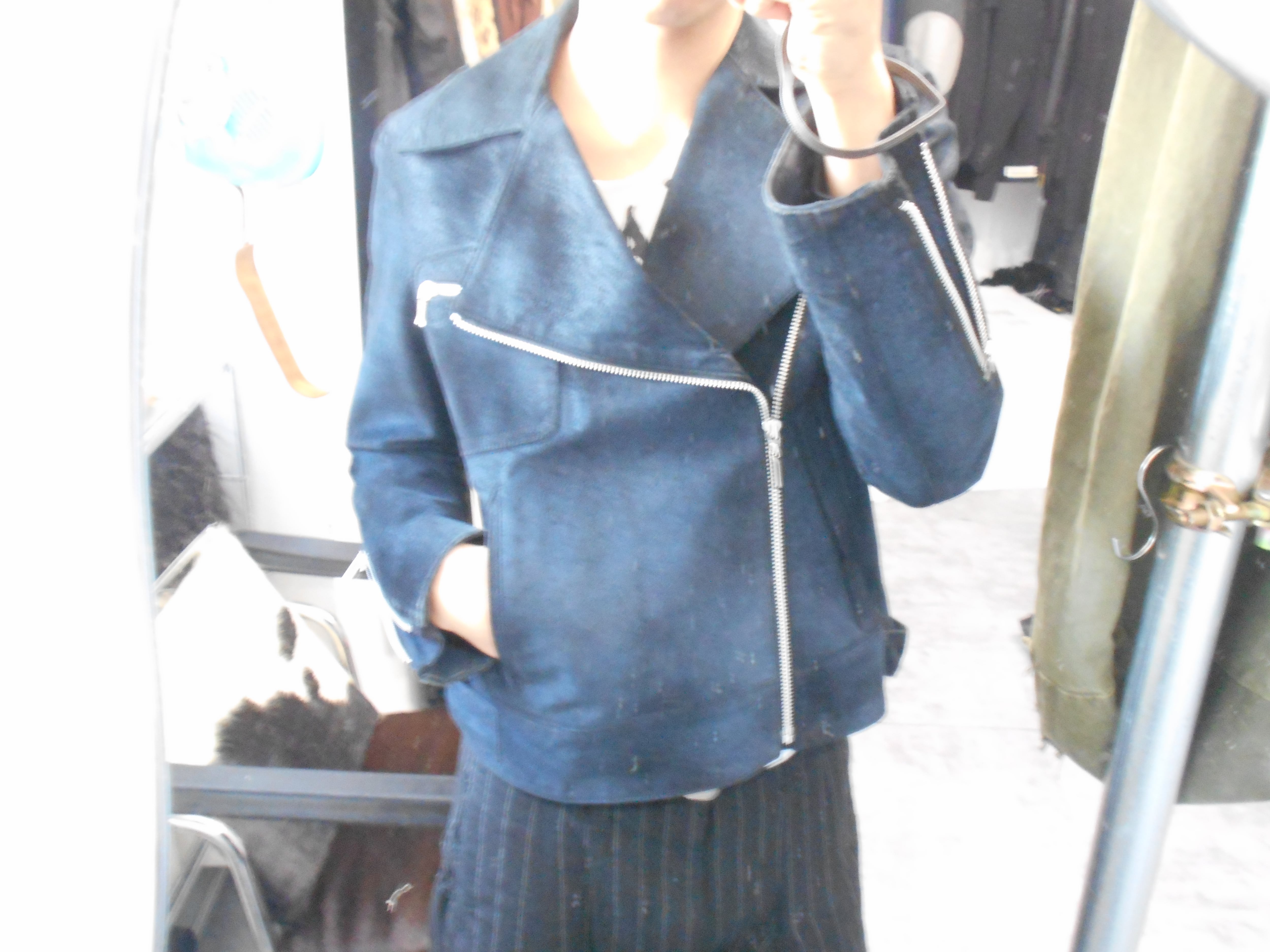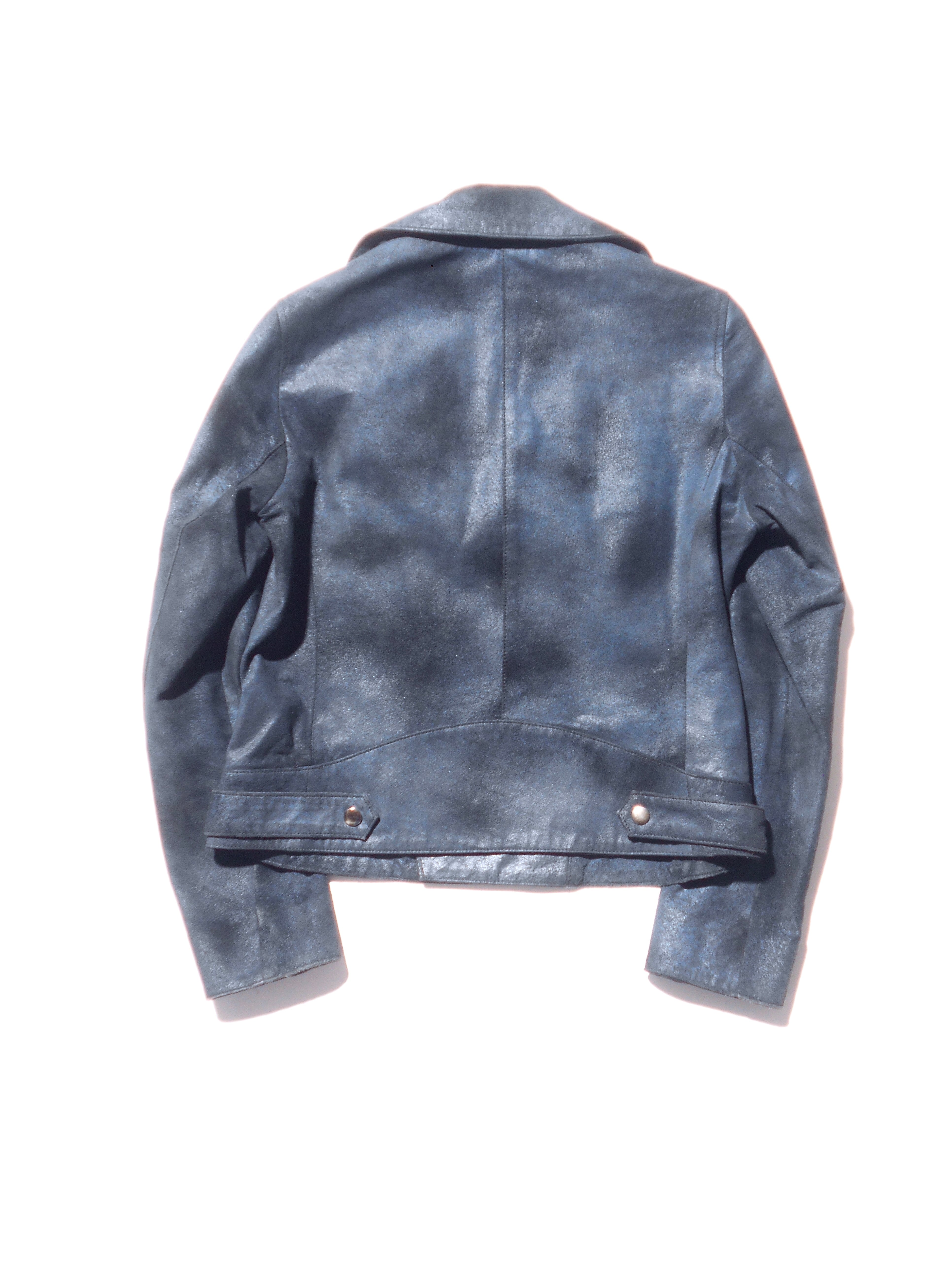 鮮やかなブルーに染められたピッグスキンが特徴的な一着となっています。また、そのディティールに目を配ってみると、襟周りのスナップボタンが排されている点や、小ぶりなジップが使われている点から、当時のミニマルな価値観が伺えるように感じられます。