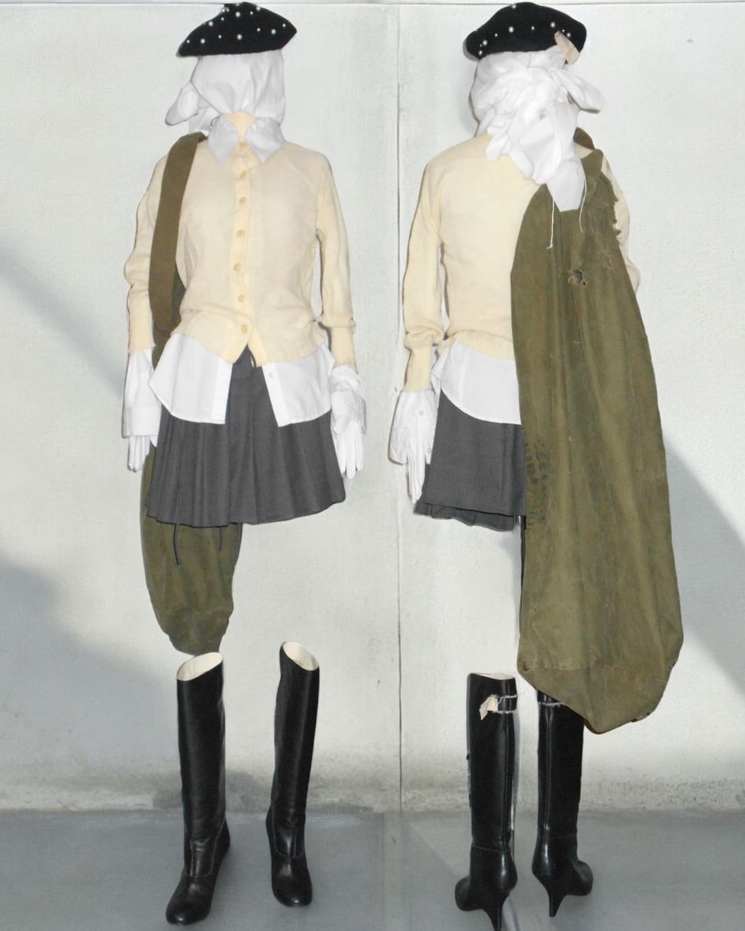 当時ものらしい生成りの色味と、変色やひび割れの見られる異色のボタンが意図せず愛らしいデザインになっているように感じられます。