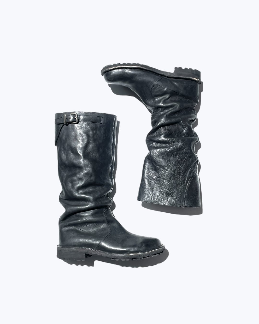 まず、使用感のあるレザーの質感とシワ感は、長年履き込まれたヴィンテージの魅力を放っていますが、同時に、近年のファッションが求める美的感覚に合致しているように見受けられます。また、ゆったりとした筒周りから生まれるルーズなドレープが却ってモダンな印象を与えているように感じられます。