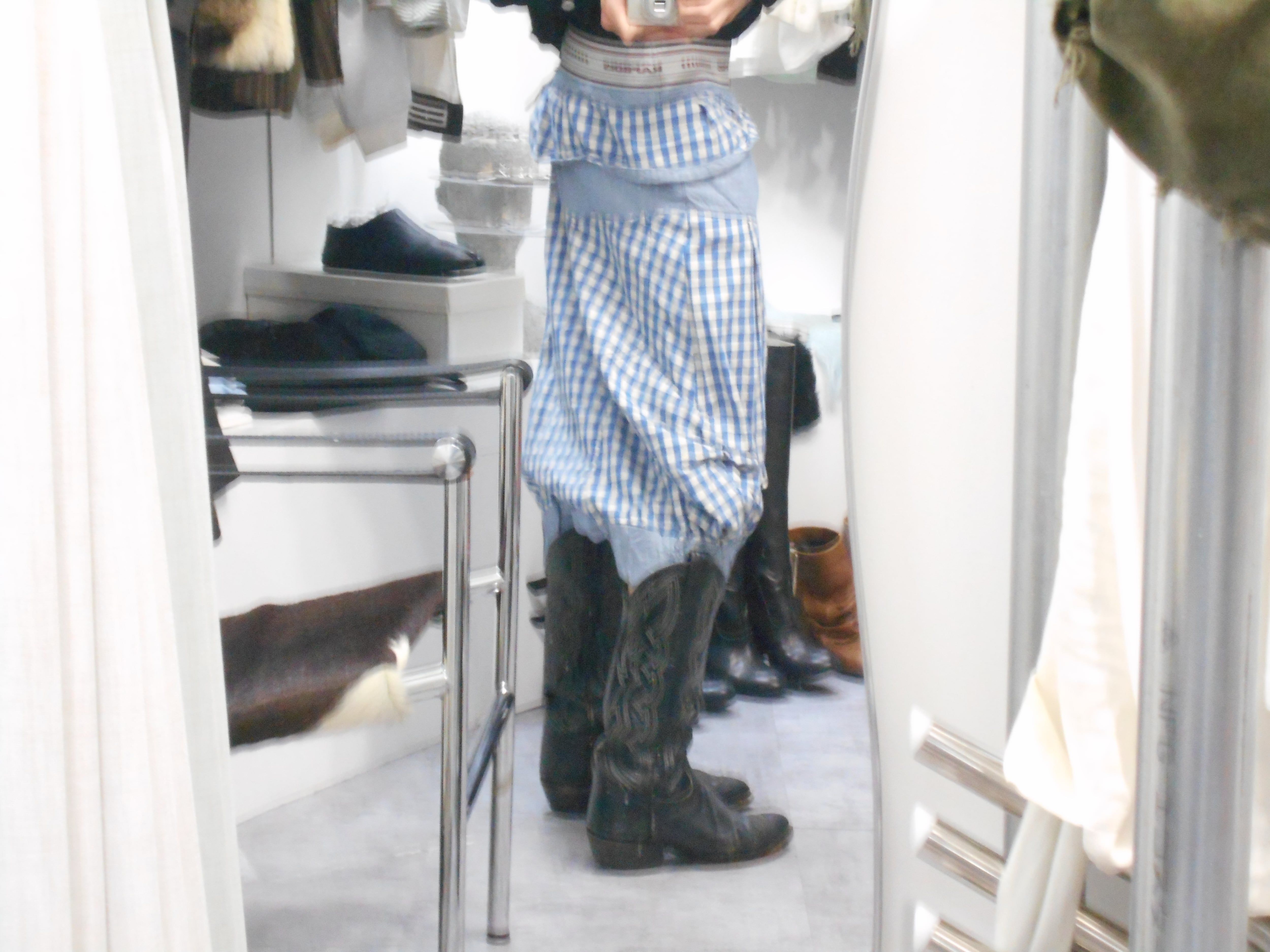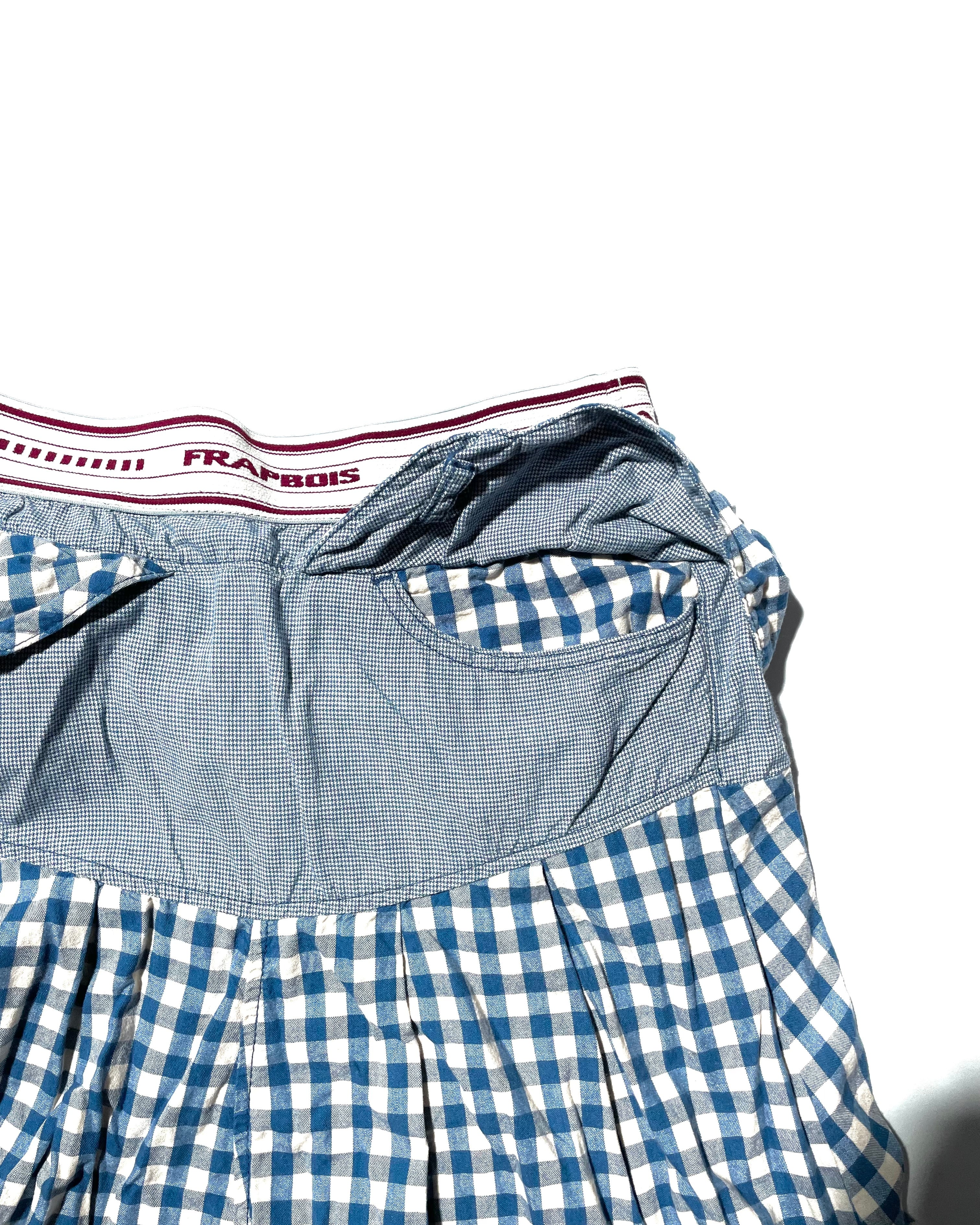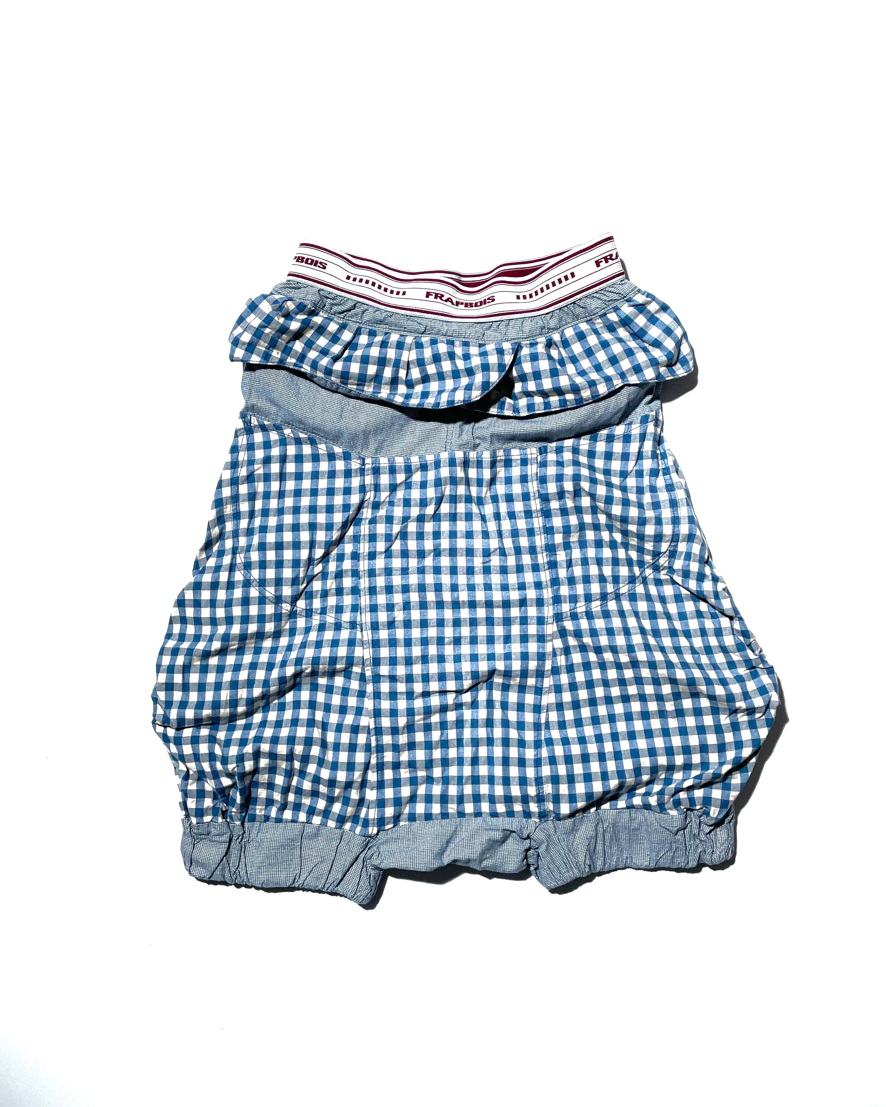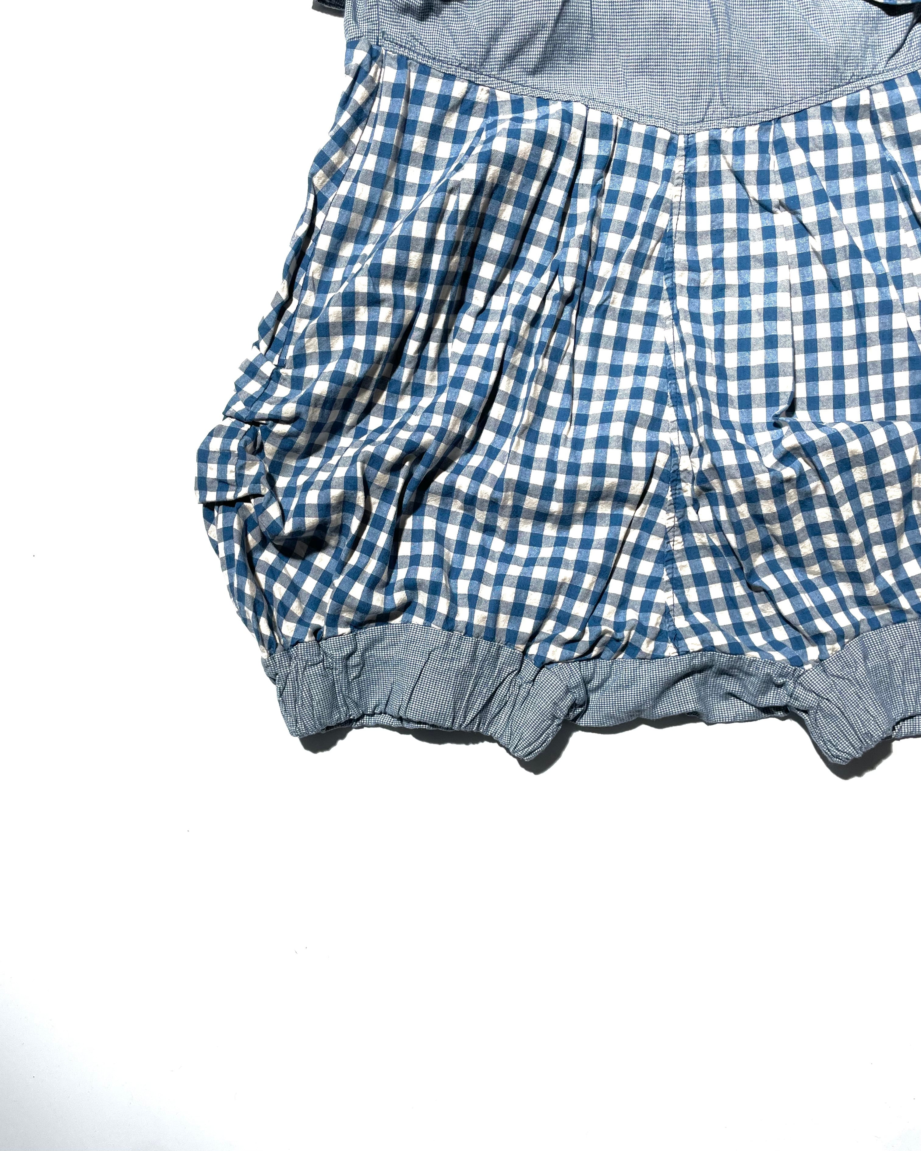 鮮やかなギンガムチェックが特徴的な一着。当時人気を博したサルエルスタイルを、ポップに解釈したアイテムなのですが、この鮮やかなギンガムチェックとバルーンのようなシルエットが、却って都会的・現代的な見え方をするようにも感じられます。