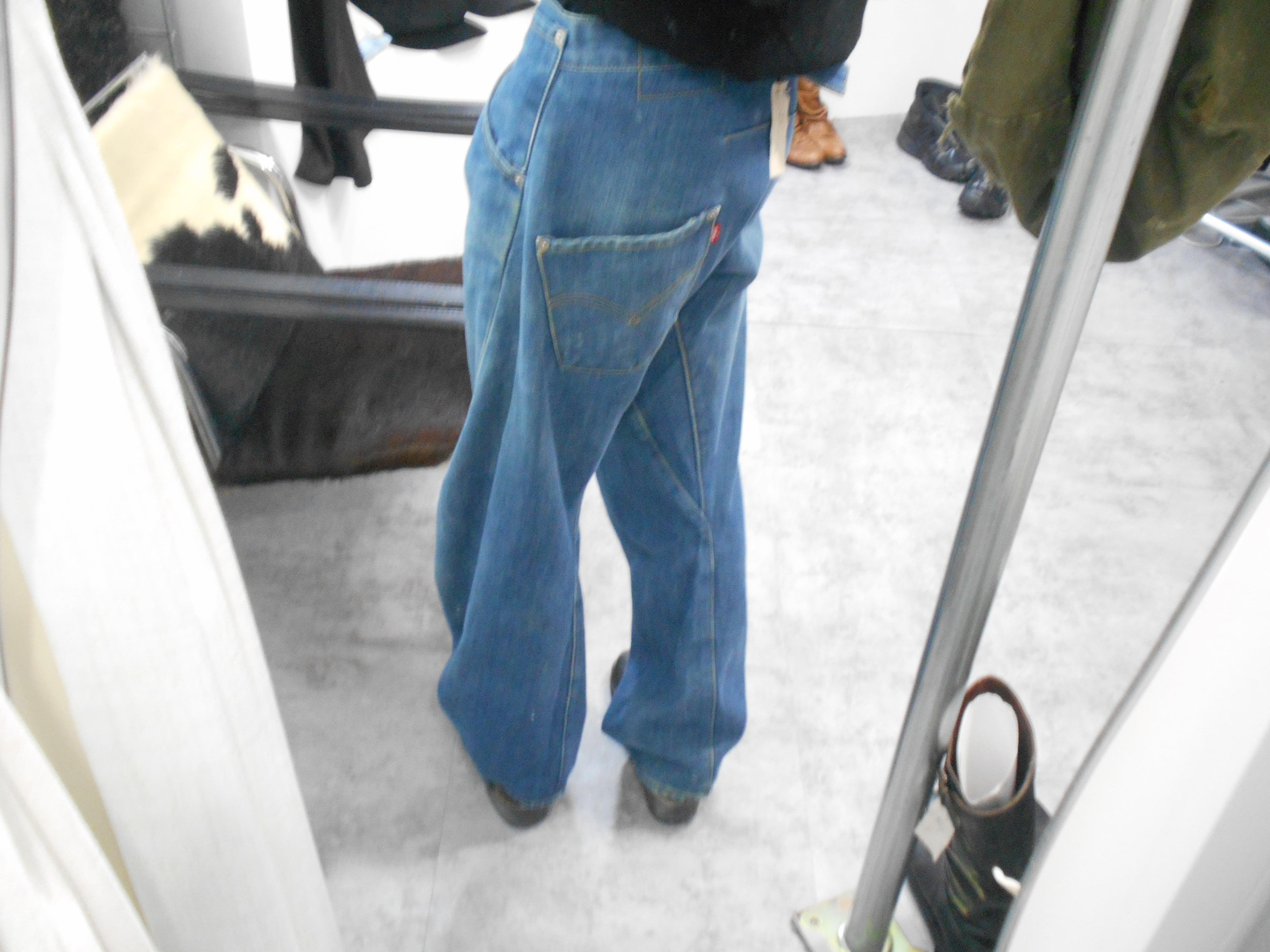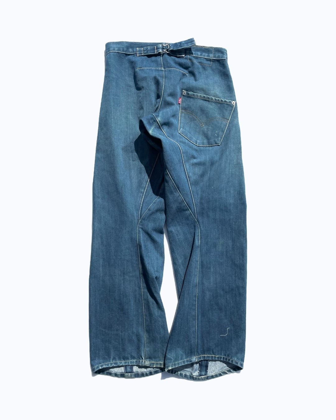 従来のジーンズが直線的なパターンで裁断・縫製されていたのに対し、こちらの型は、ねじれやひずみといった立体的なカッティングを導入しました。この技術は、人間の脚の動きに自然にフィットするように計算されており、ジーンズにこれまでにない履き心地とデザインをもたらしました。
