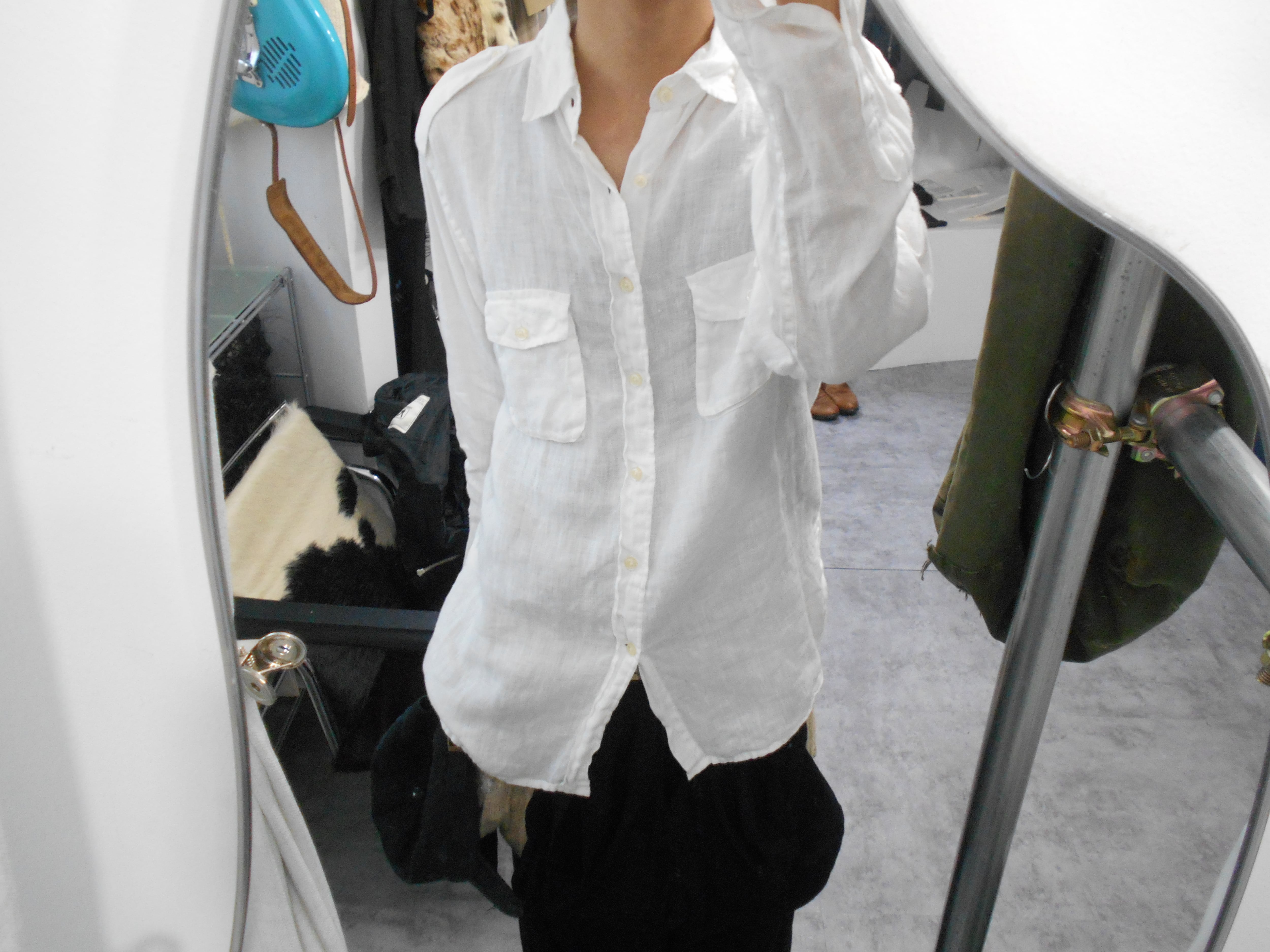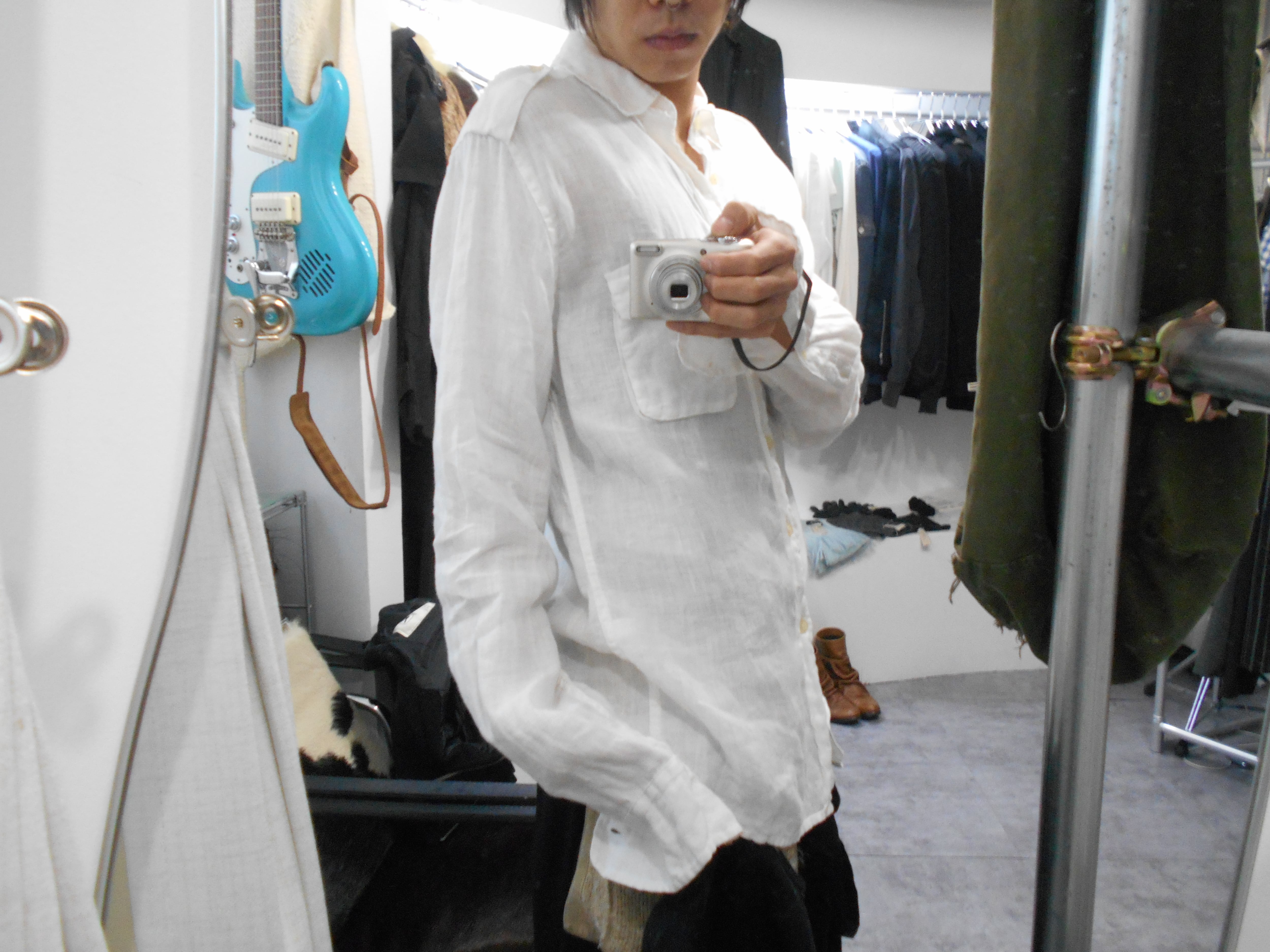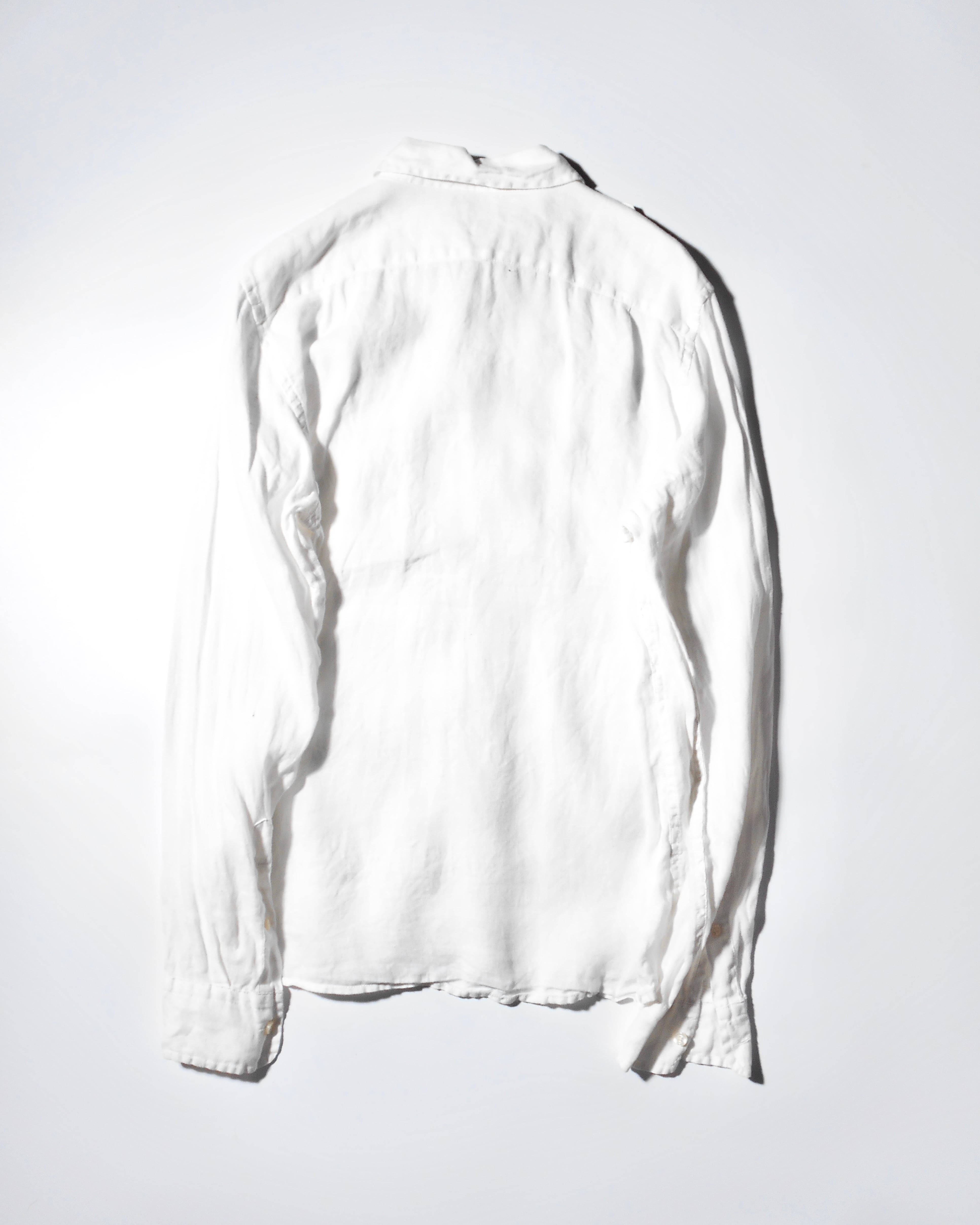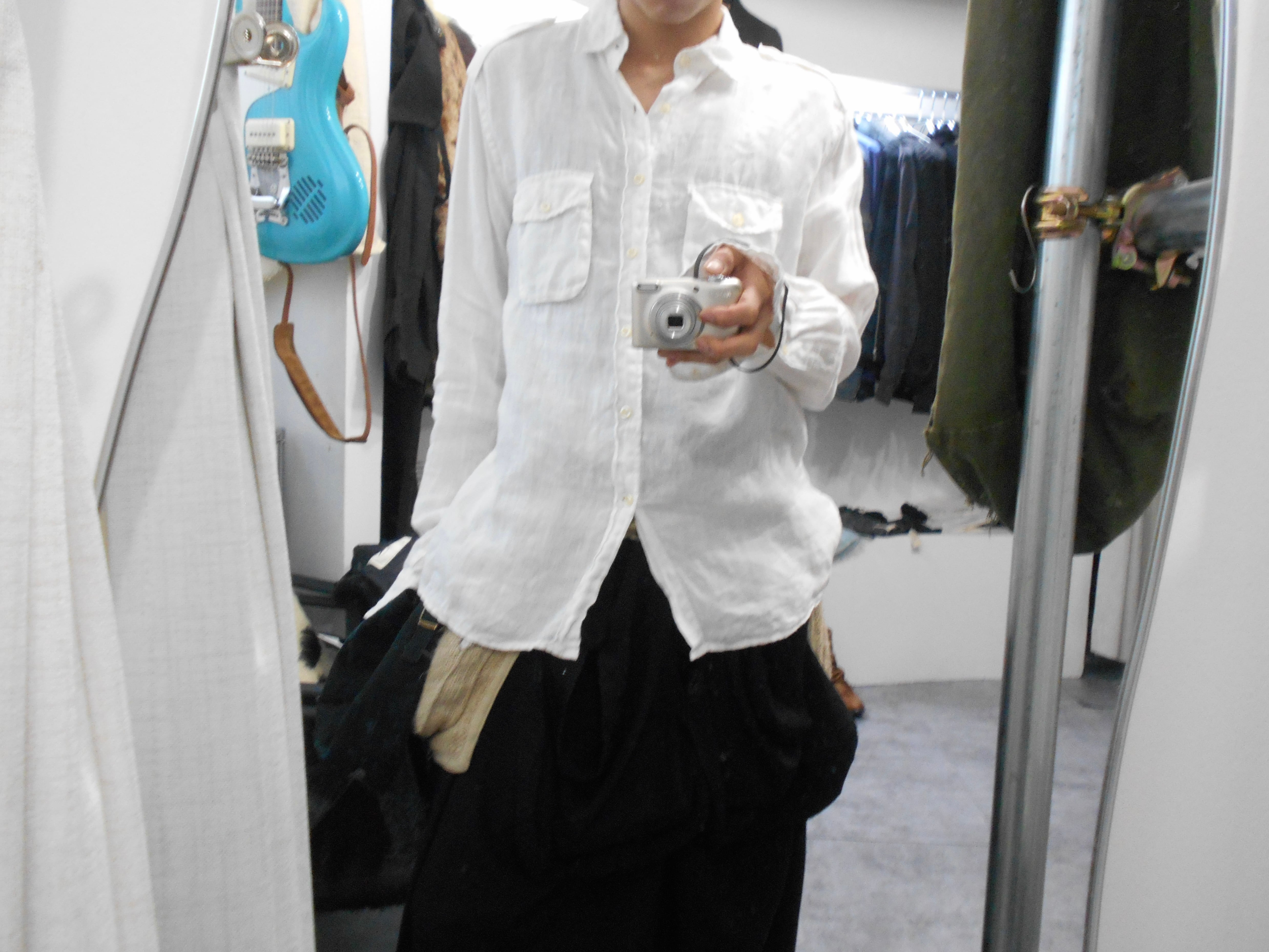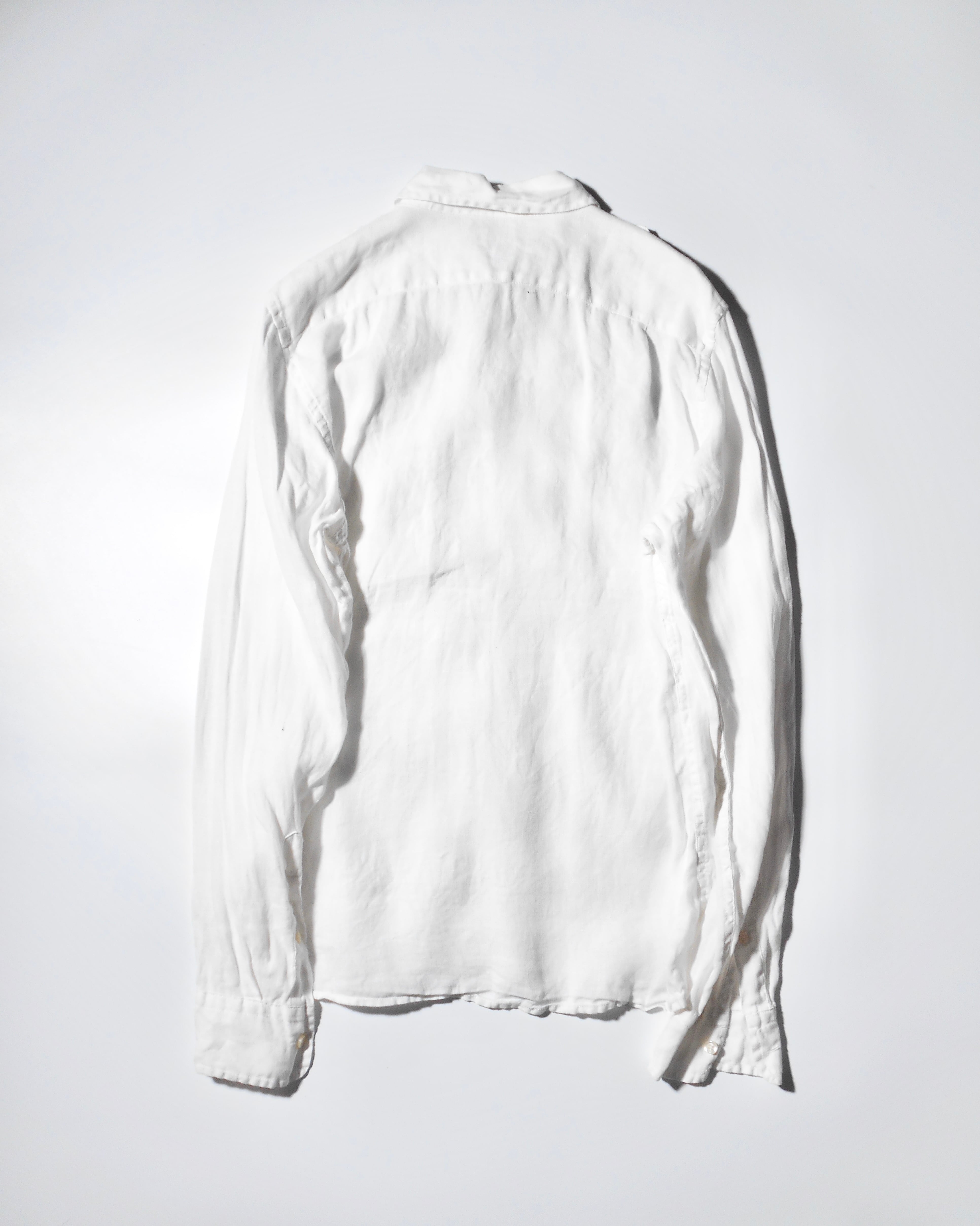 ミリタリーアイテムといえばエポレットがその良い例ですが、こちらのアイテムも同様にエポレットが付き、またフラップ付きのポケットが左右に二つ付くなど、軍の要素を感じさせられるディティールが多く見られます。しかしながら、その軍特有の堅さのようなものを、リネン素材のもつ柔らかさによって、あくまでファションアイテムとして昇華しているように感じられます。