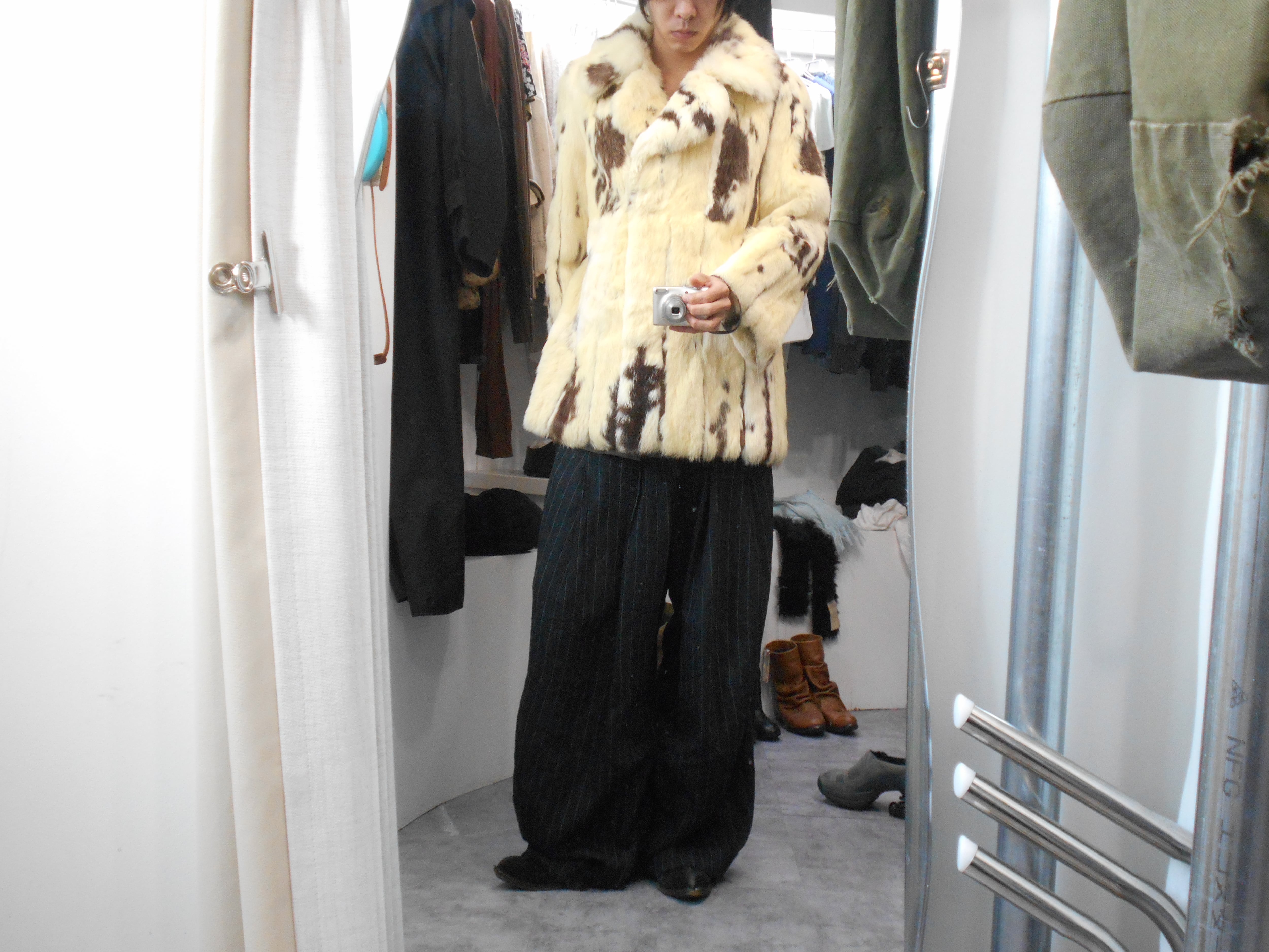 このクリーム色のような色味はおそらくラビットファーによるものだと考えられるのですが、本来面積の小さいラビットファーをここまで大ぶりなミドルコートはどのサイズまで集めるというのは現代ではもう倫理的に不可能なようにも感じられます。