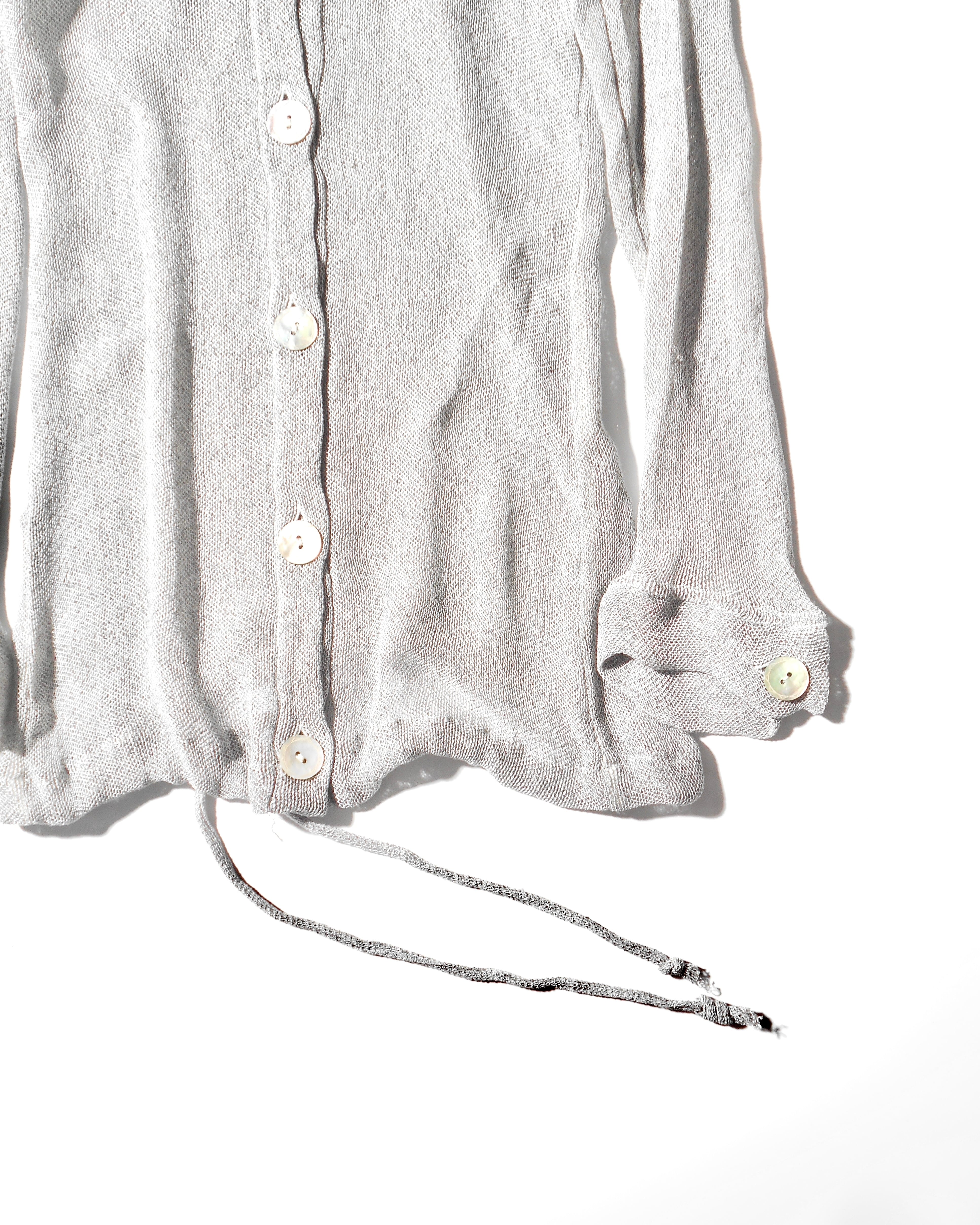 シャツの型を採用しつつ、シアーのニット素材や大きなシェルボタンなど普通のシャツには見られない作りが見られます。