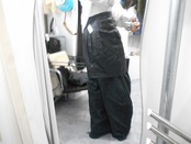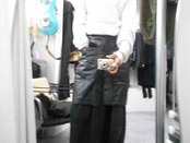 前面のボタンにより開閉のできるラップスカートのような形になっているため、パンツの上から履くことで現代のファッションシーンとの親和性のあるスタイリングが可能になるのではないかと思います。