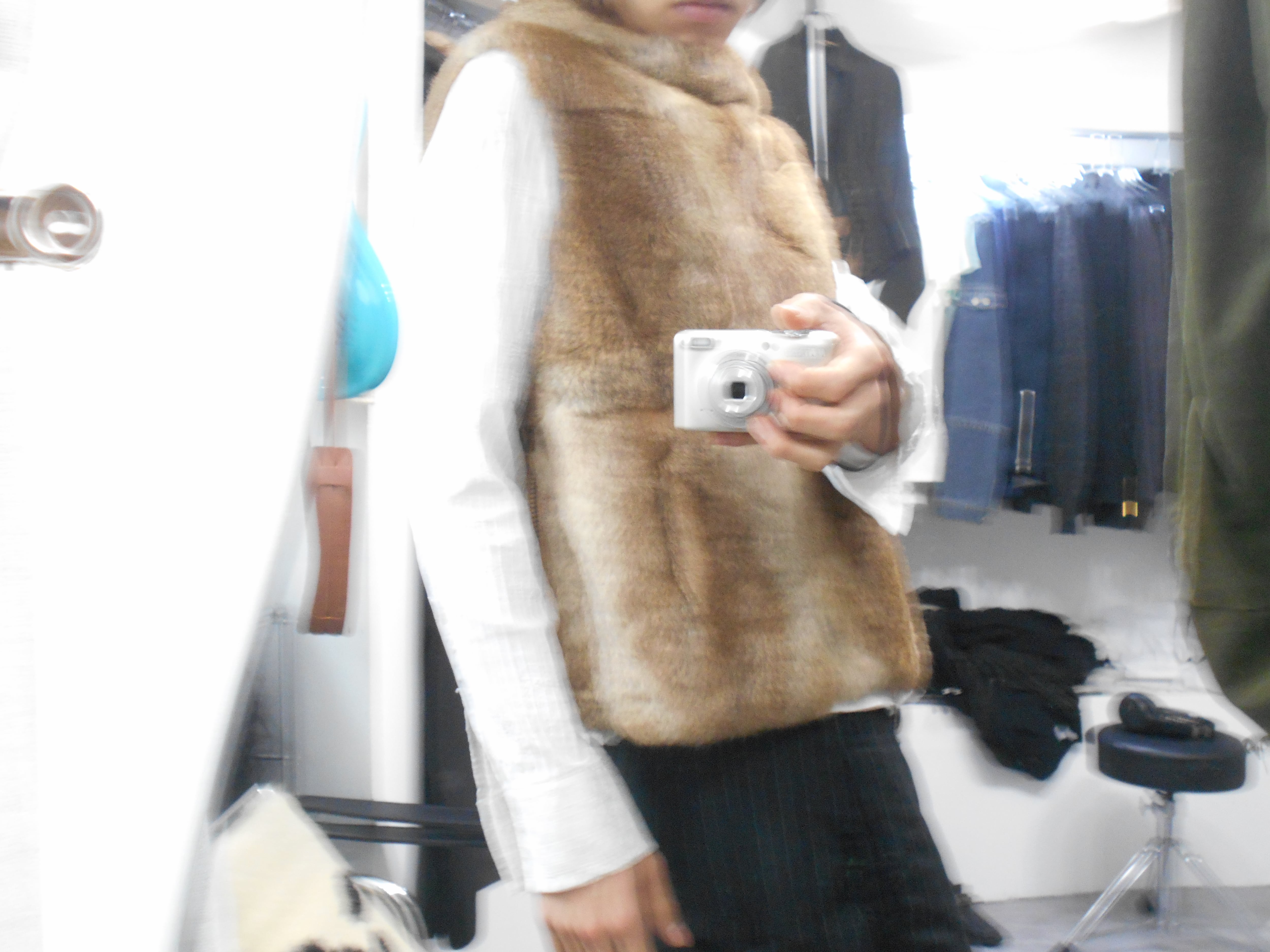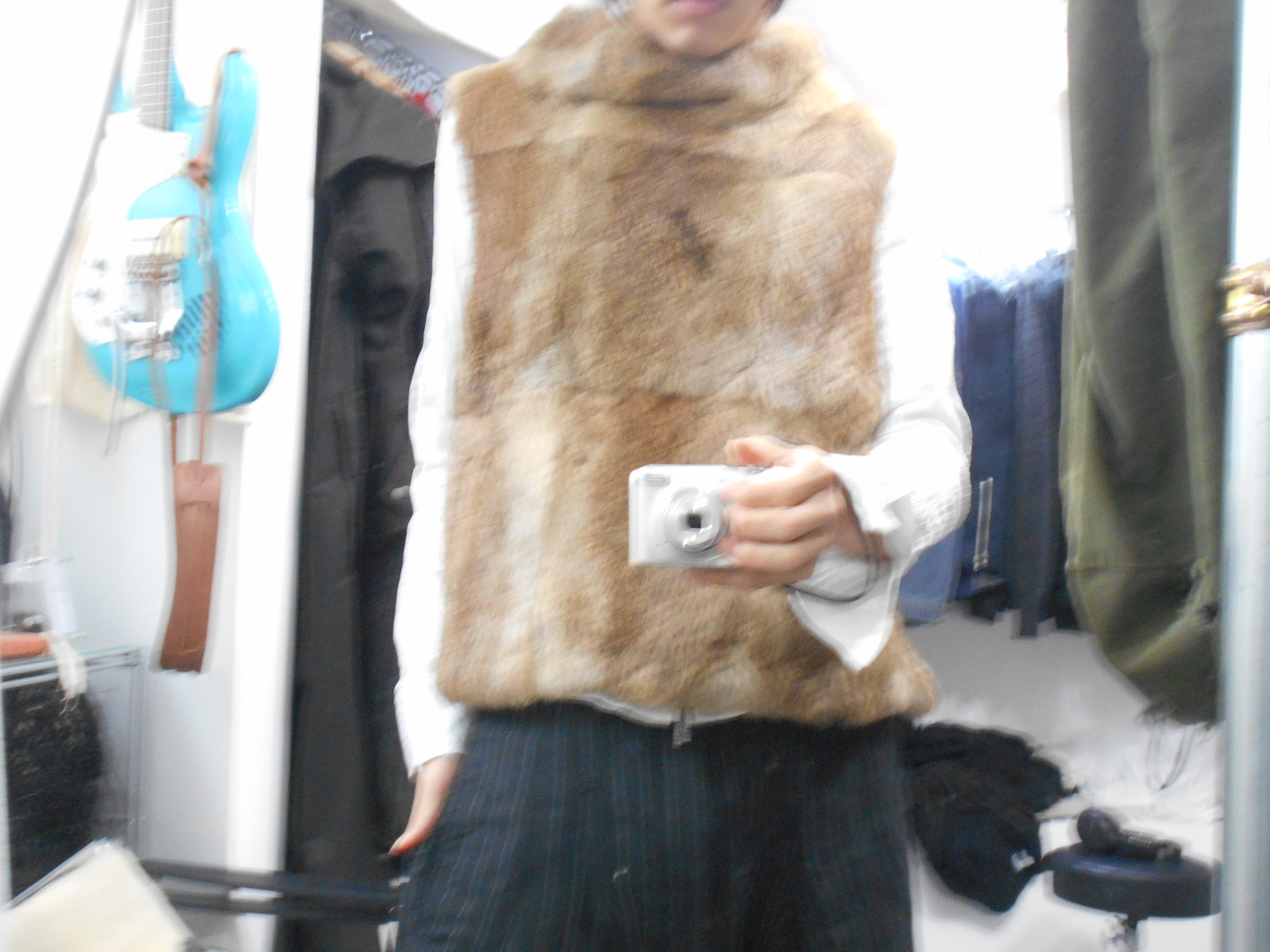 ファーのベストでこれまで見てきた物では一般にジップアップやボタンなど開閉式の物が多くあった一方、こちらはハイネックのプルオーバーという仕様になっています。