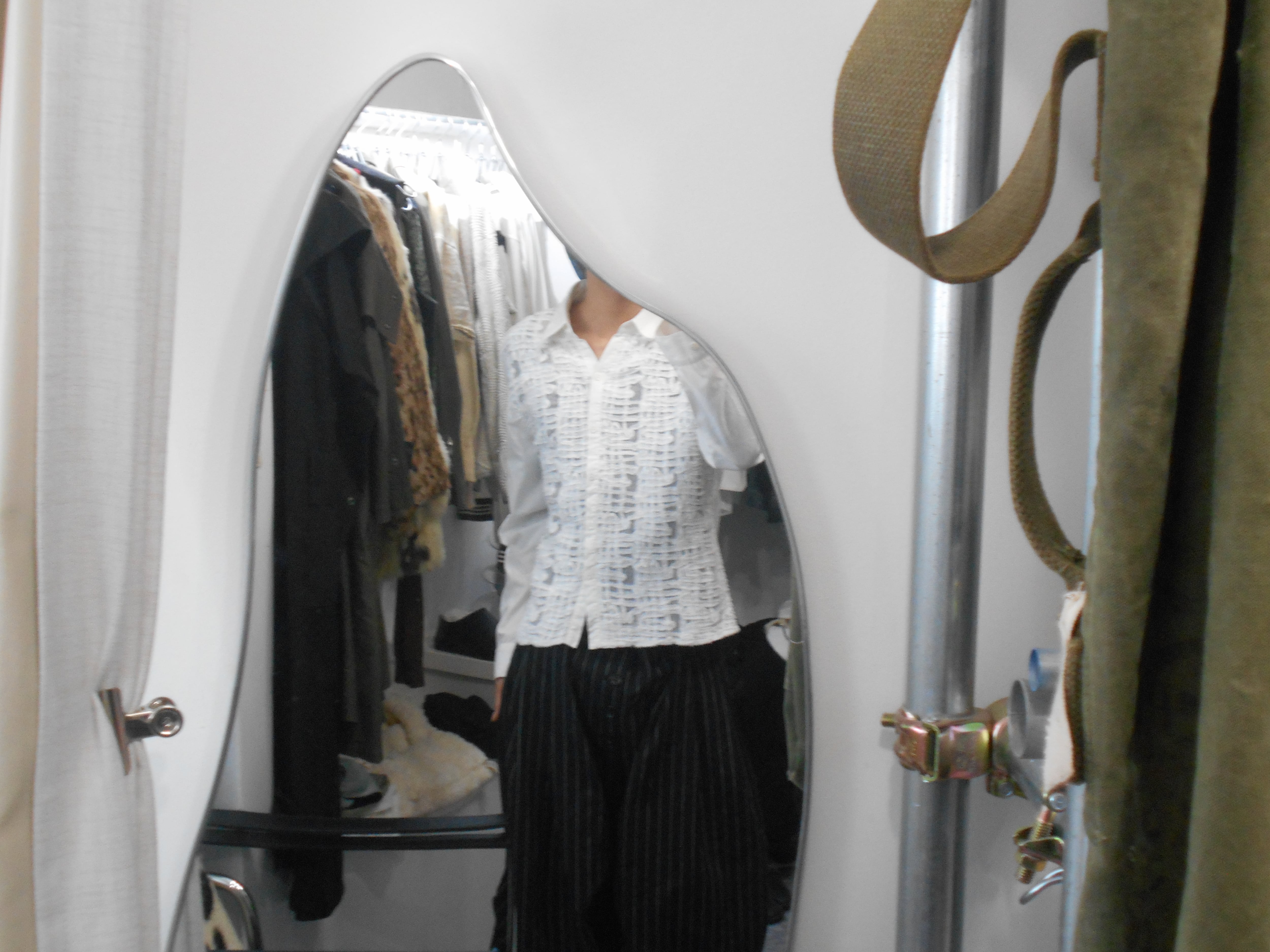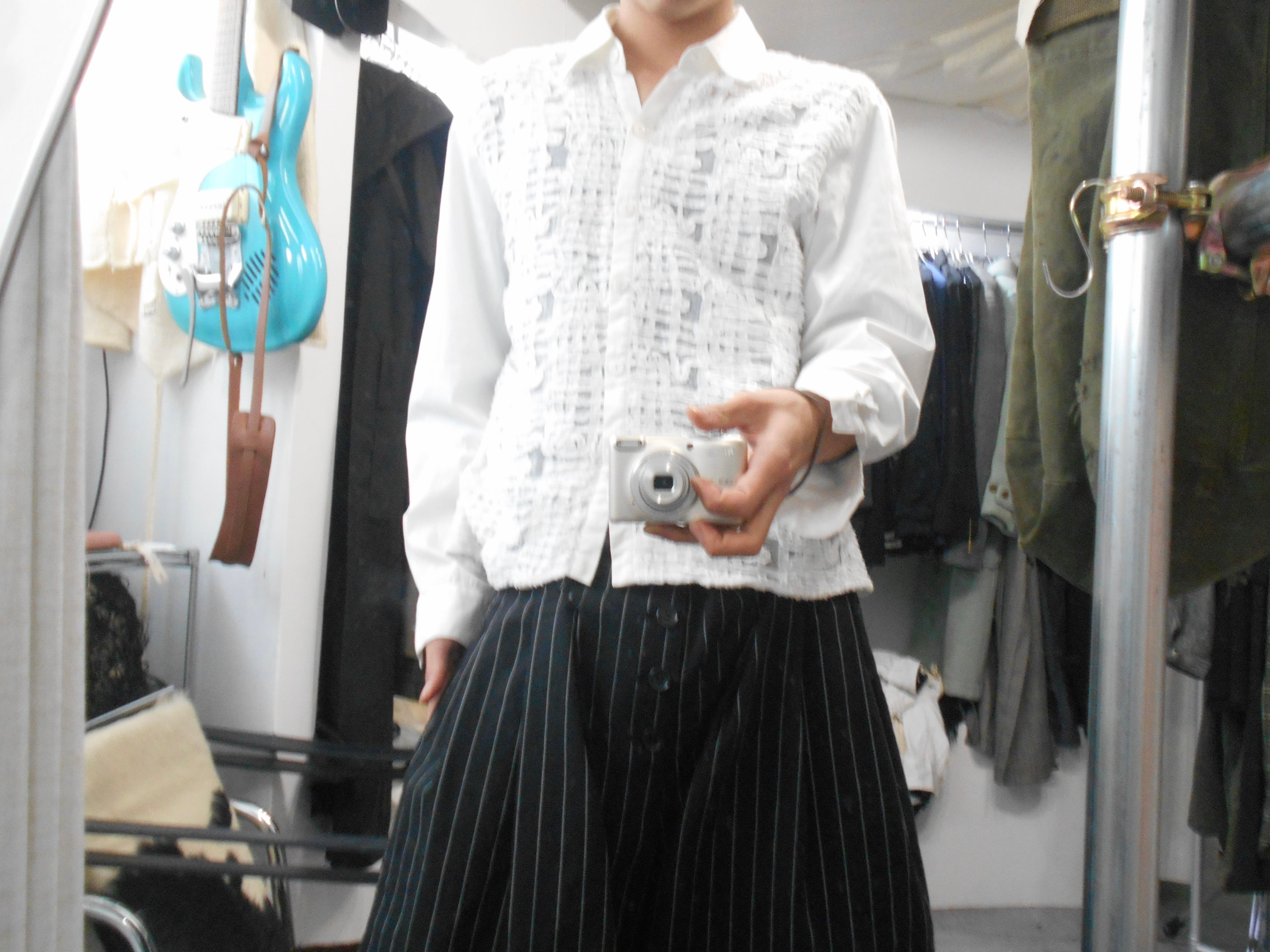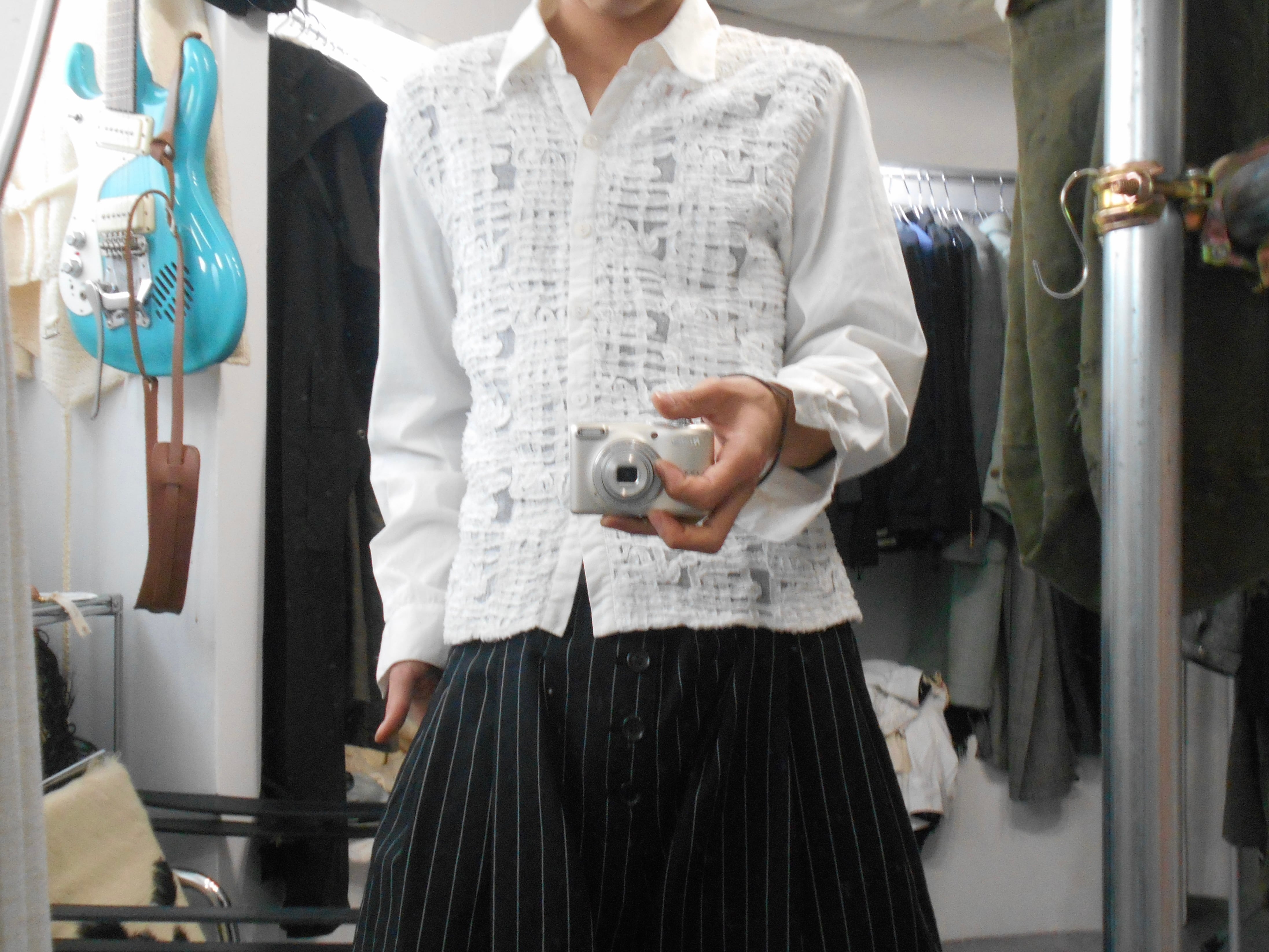 また前面のデザインも特徴的で、シアーの素材の上から線のように荒く切り出された布を縦や横に張り巡らせるように縫い付けられており、トラッドな権威的な印象を保ちながらアートのような脆さや儚さを同時に持ち合わせているように感じられます。