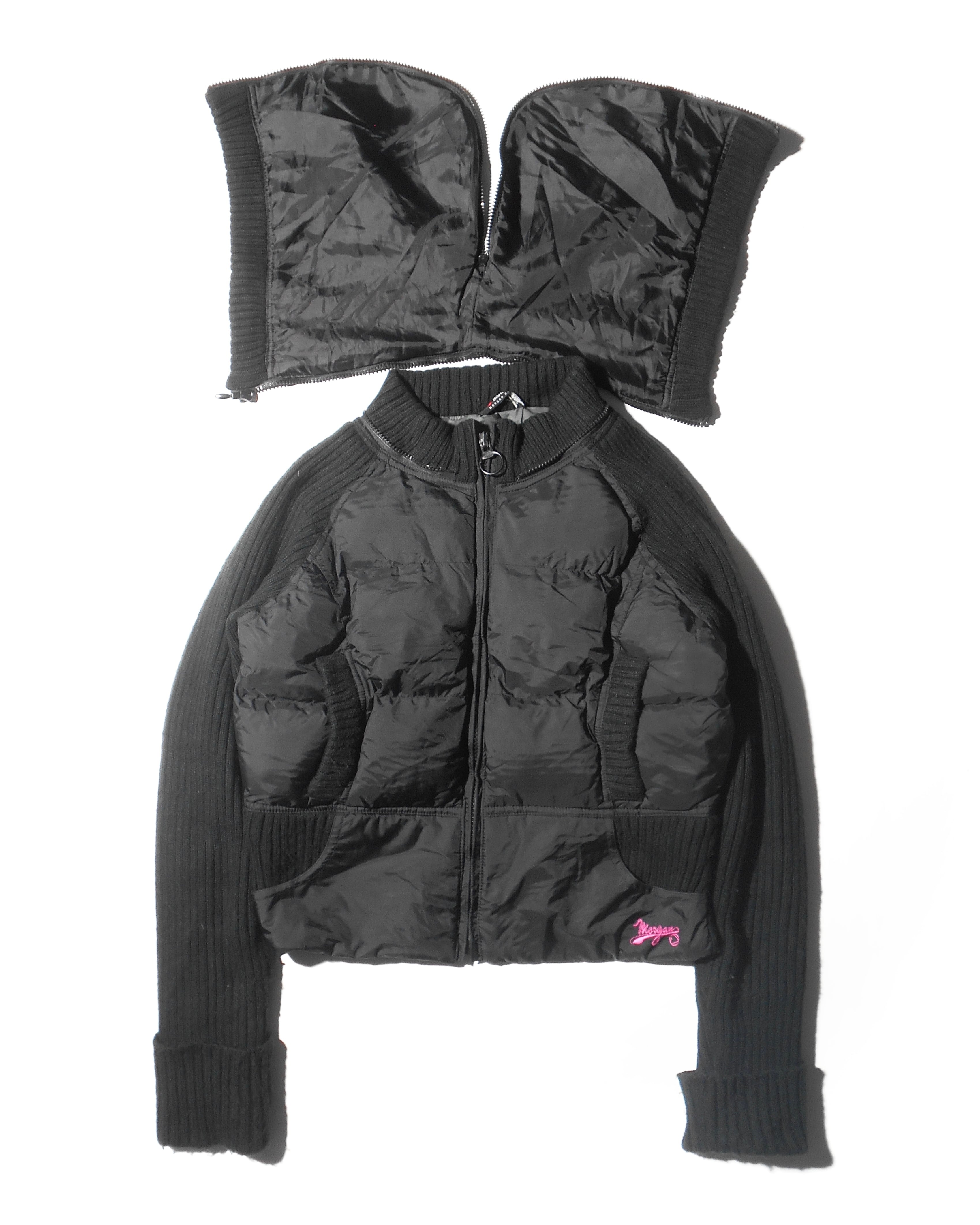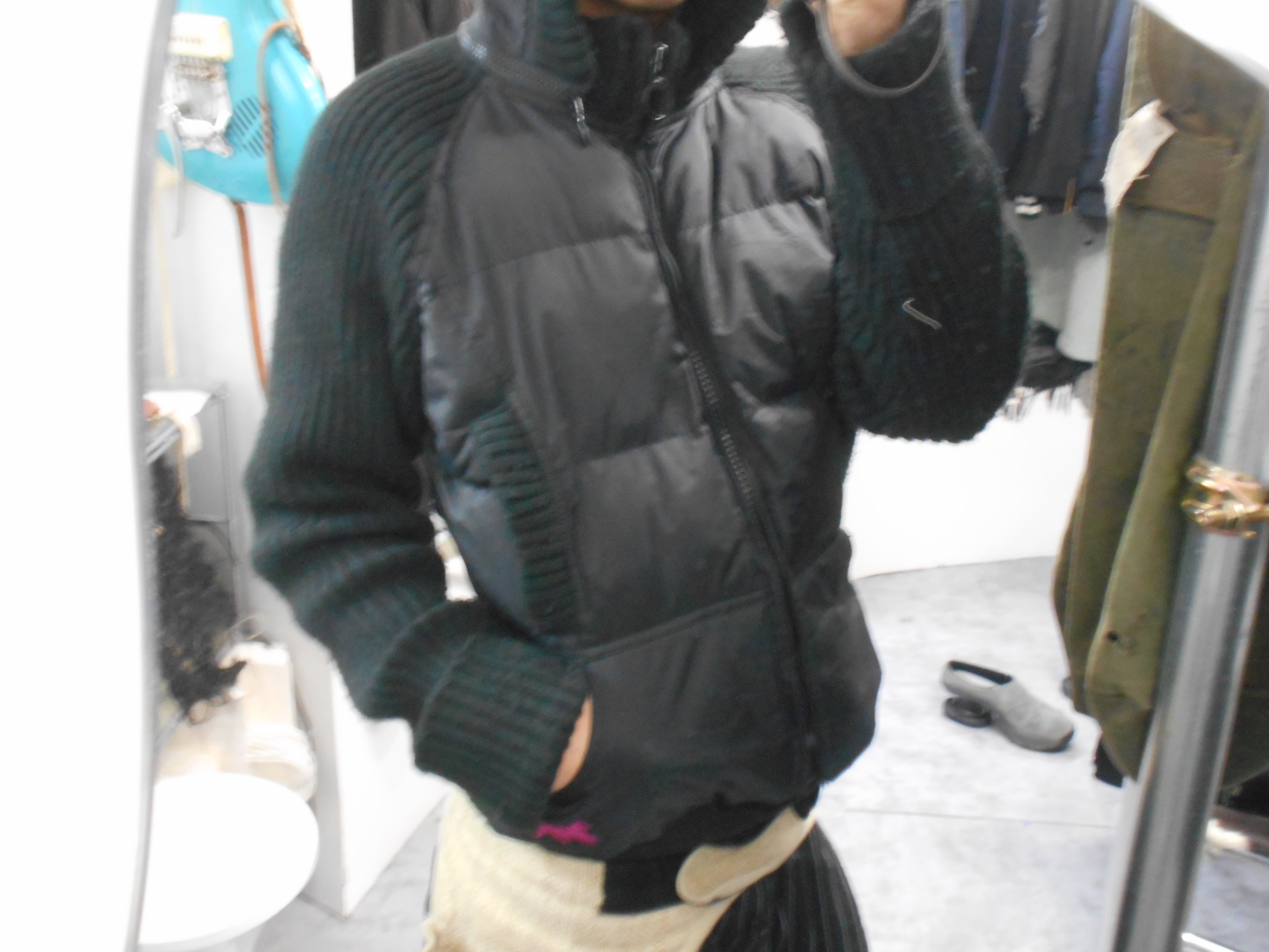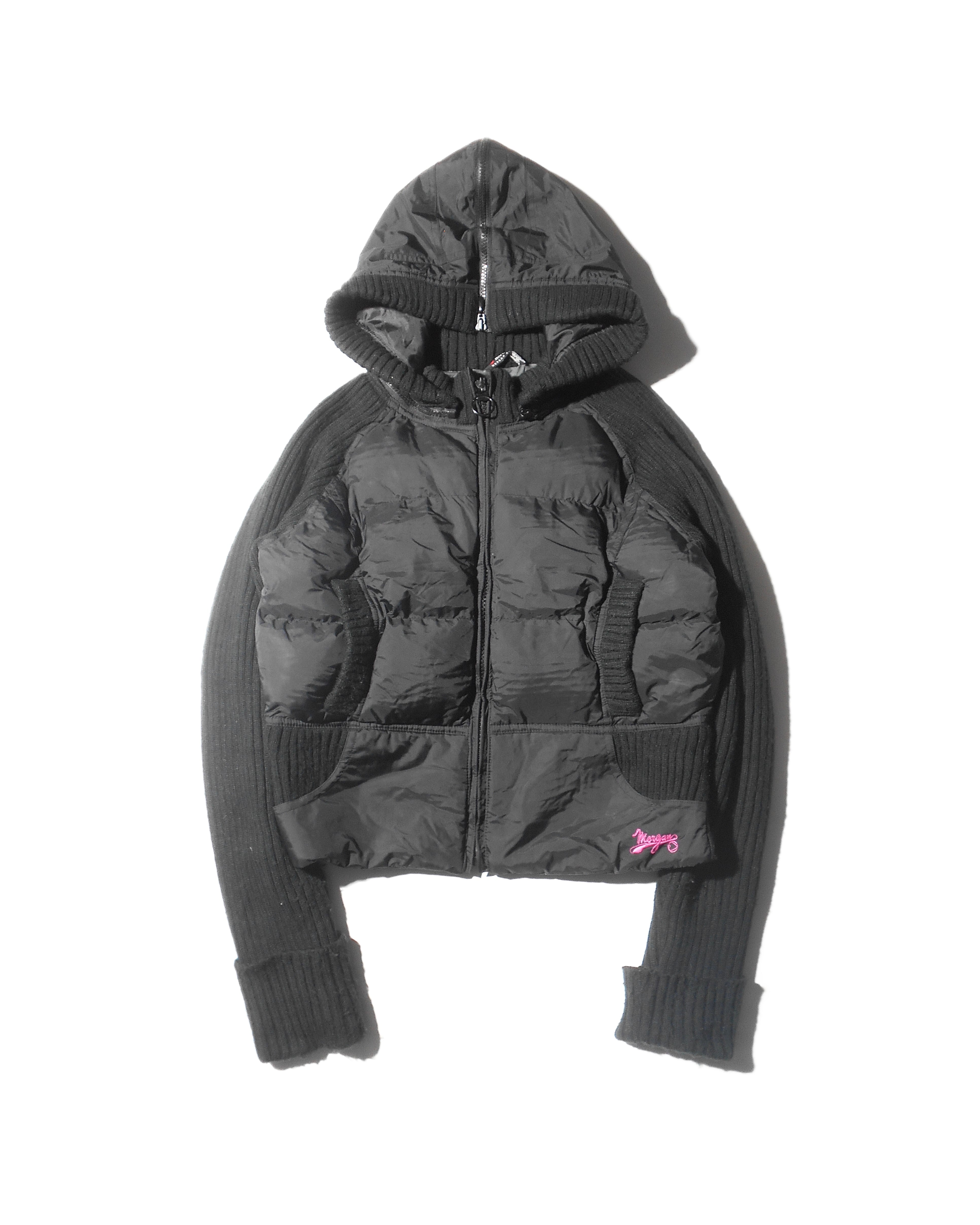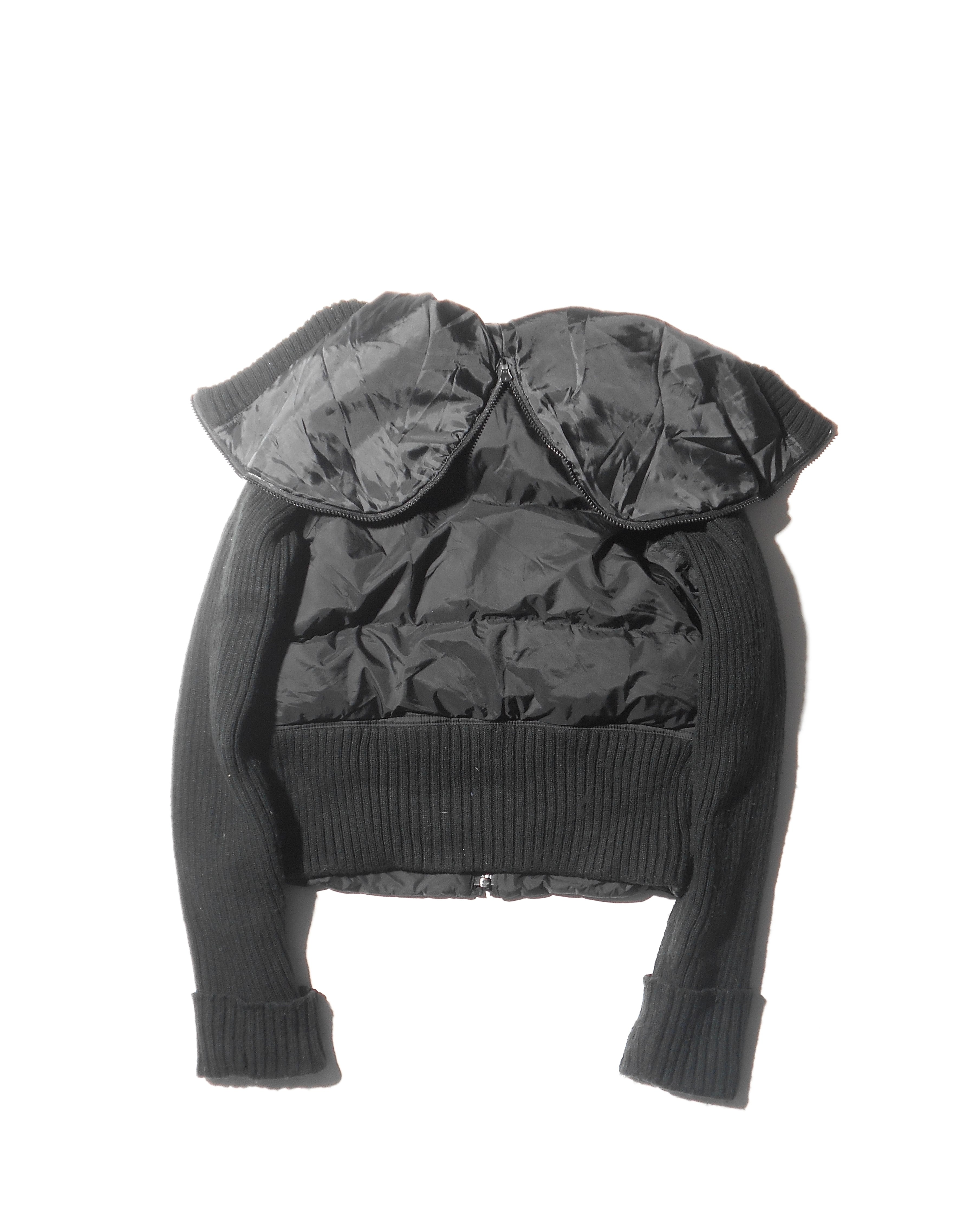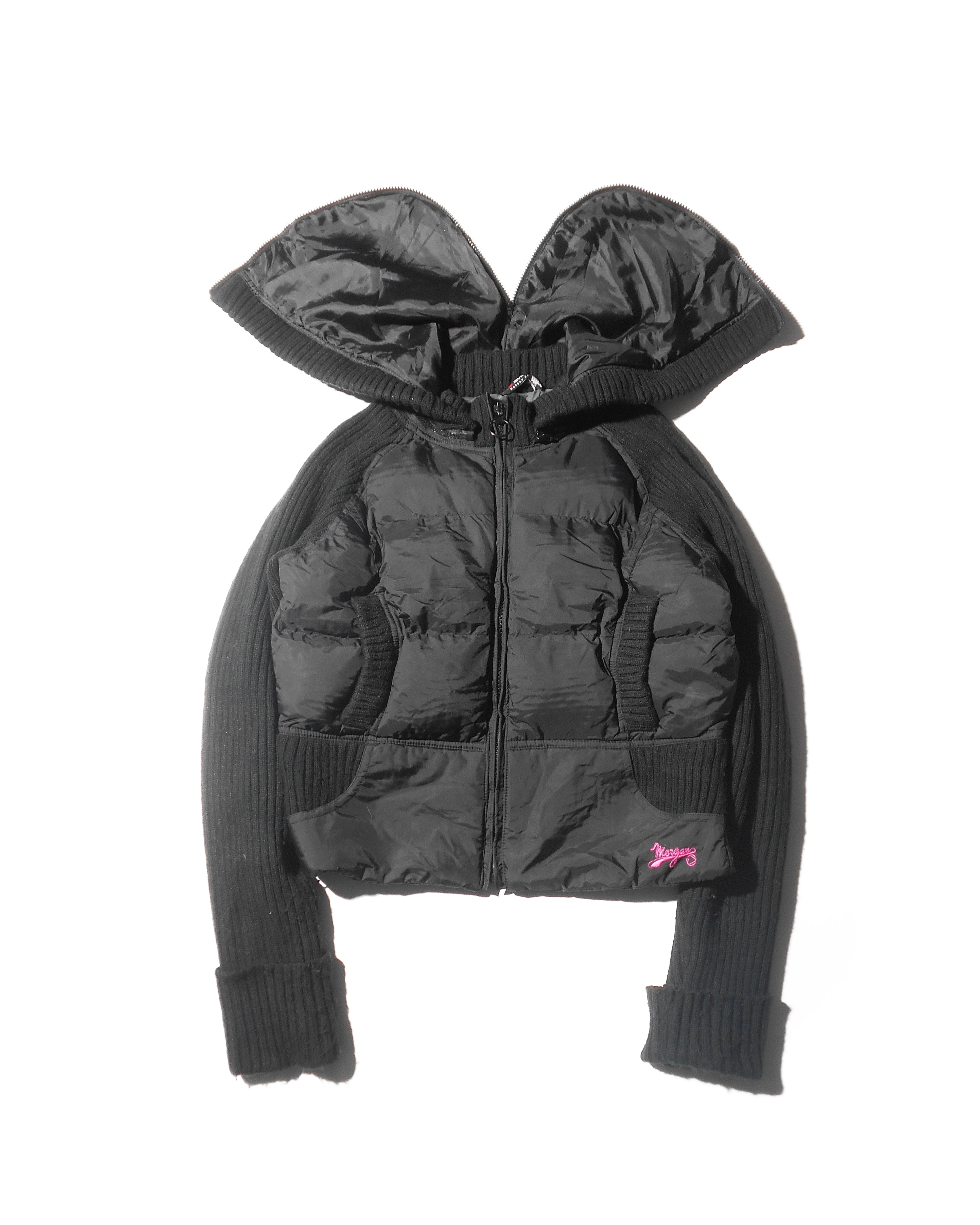 一般的にダウンというと、ファッションに落とし込みにくいような全体的に膨らみのあるシルエットが印象的ですが、こちらはその野暮ったさを払拭するように、袖のニット切り替えや短い丈、またスプリットフードがつくことでファッションとして楽しめるダウンとして仕上がっているように感じられます。