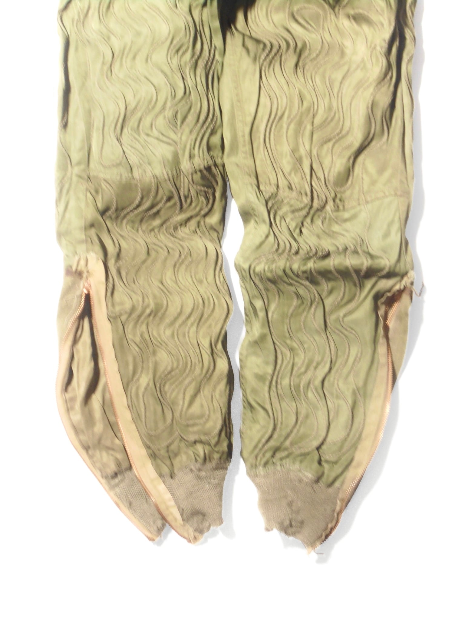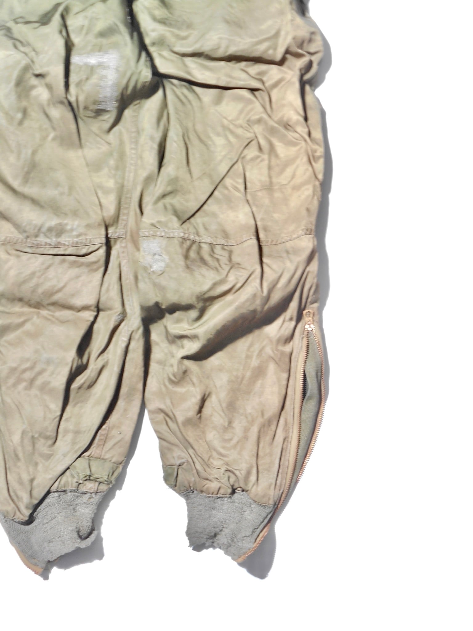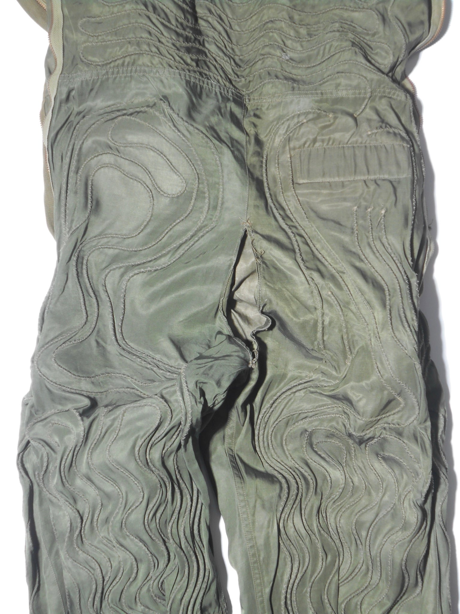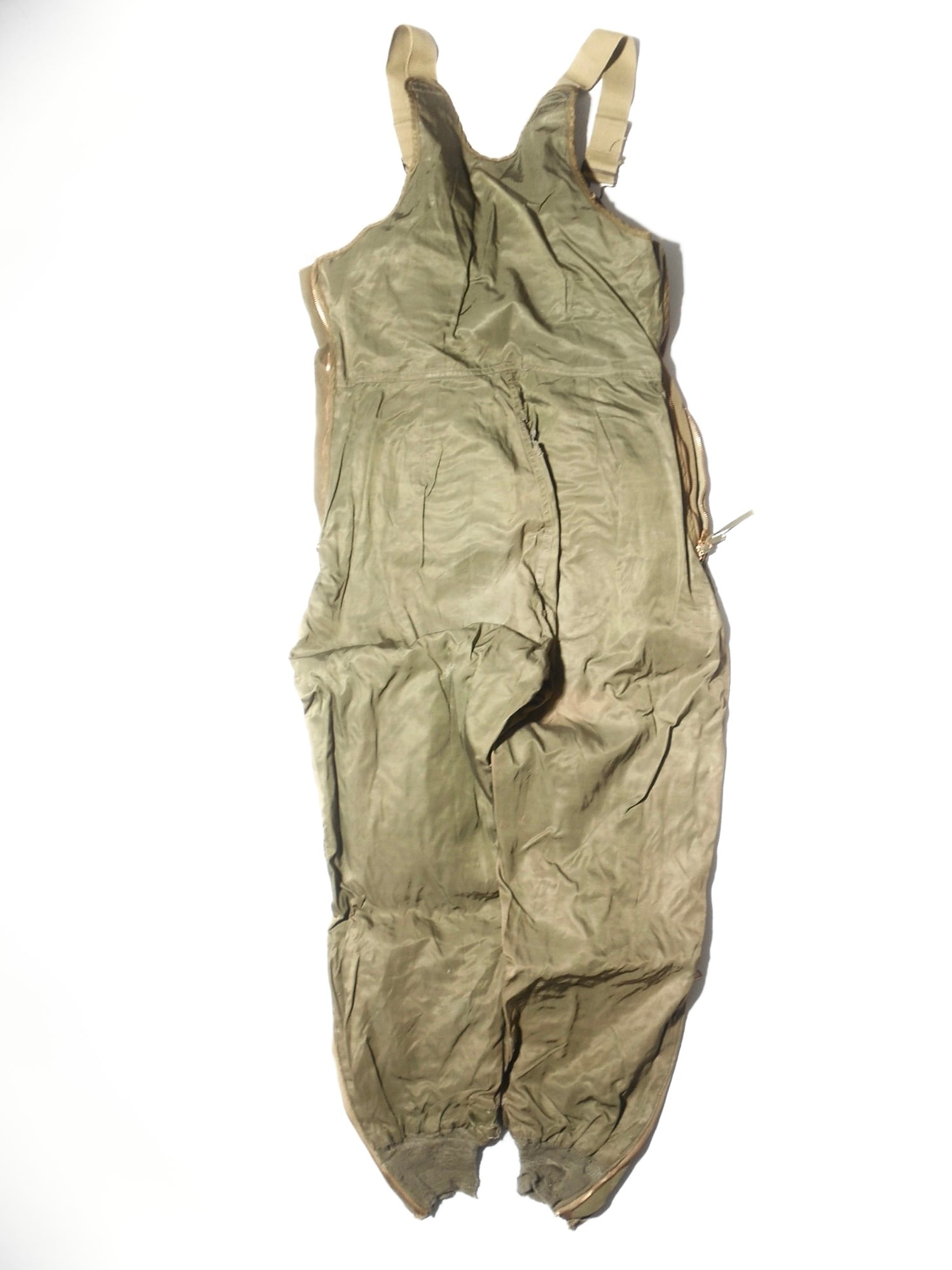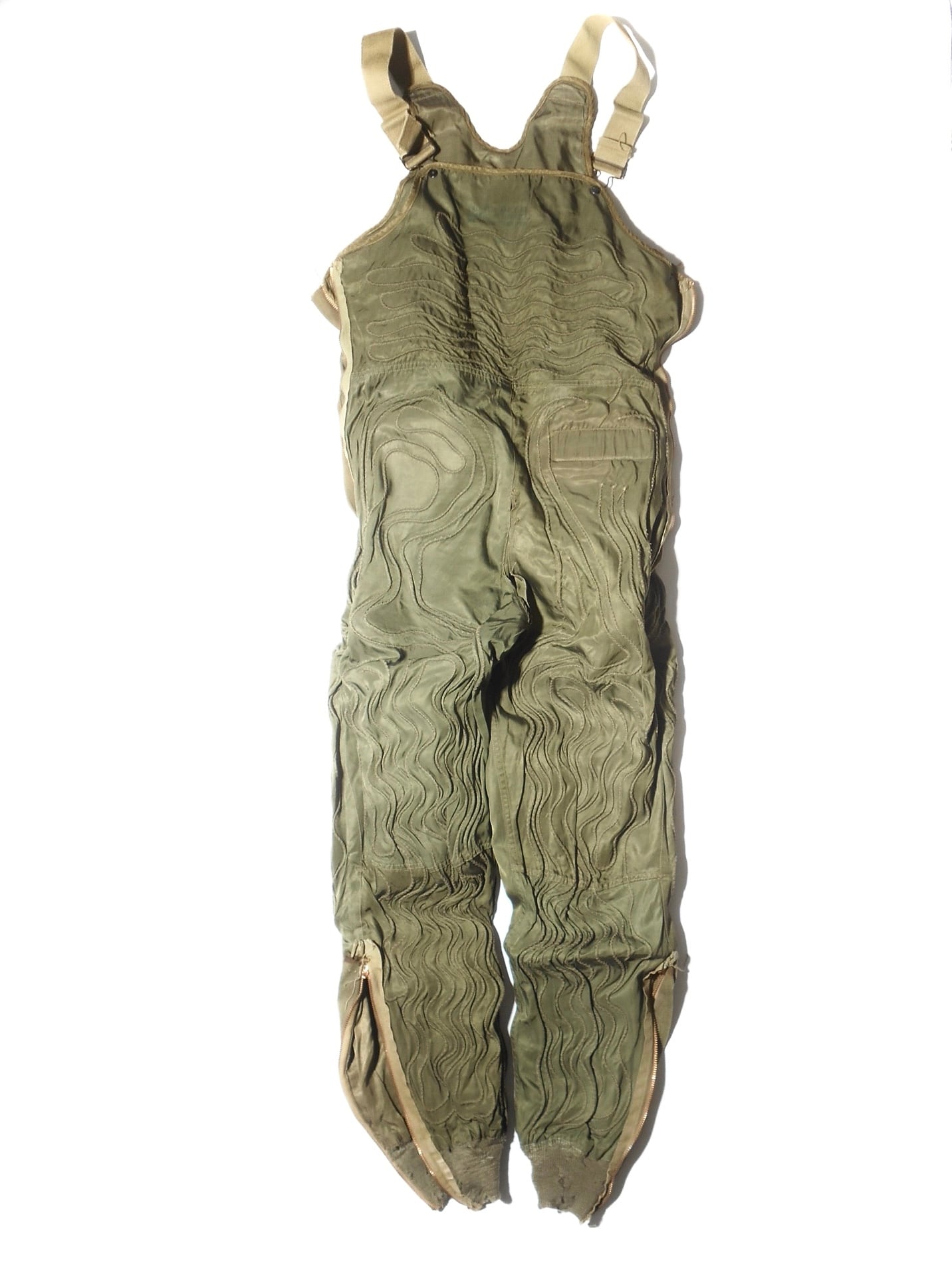1944年頃に標準化されたF-3は、先行モデルの欠点を改良し、高い信頼性を実現しました。オリーブドラブのウール混紡生地には細い電熱線が張り巡らされ、機体の24V電源に接続することで発熱し、兵士の体温を維持します。ワンピース型からセパレートタイプへ進化したことで、機内での機動性も大幅に向上しました。