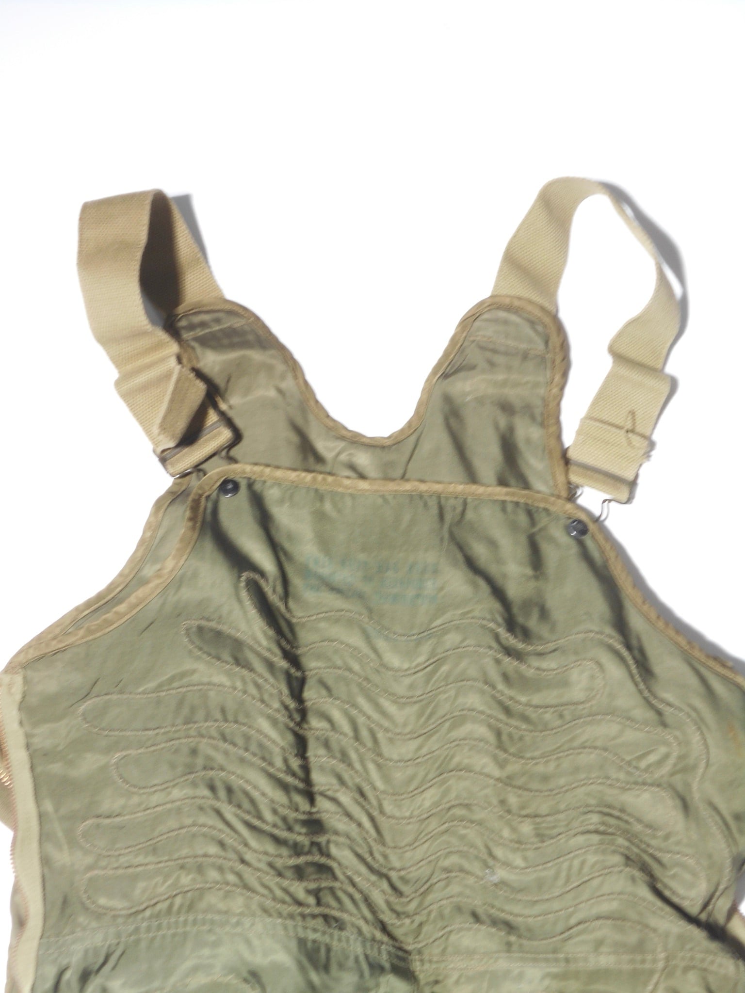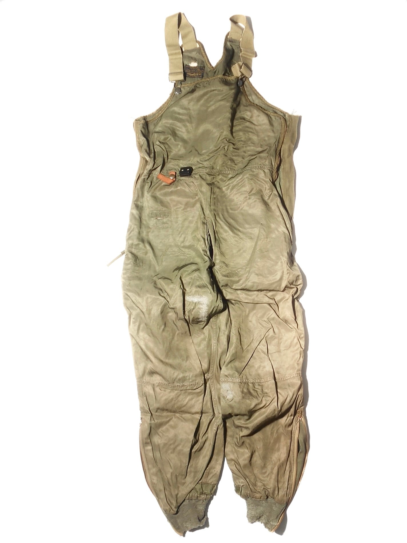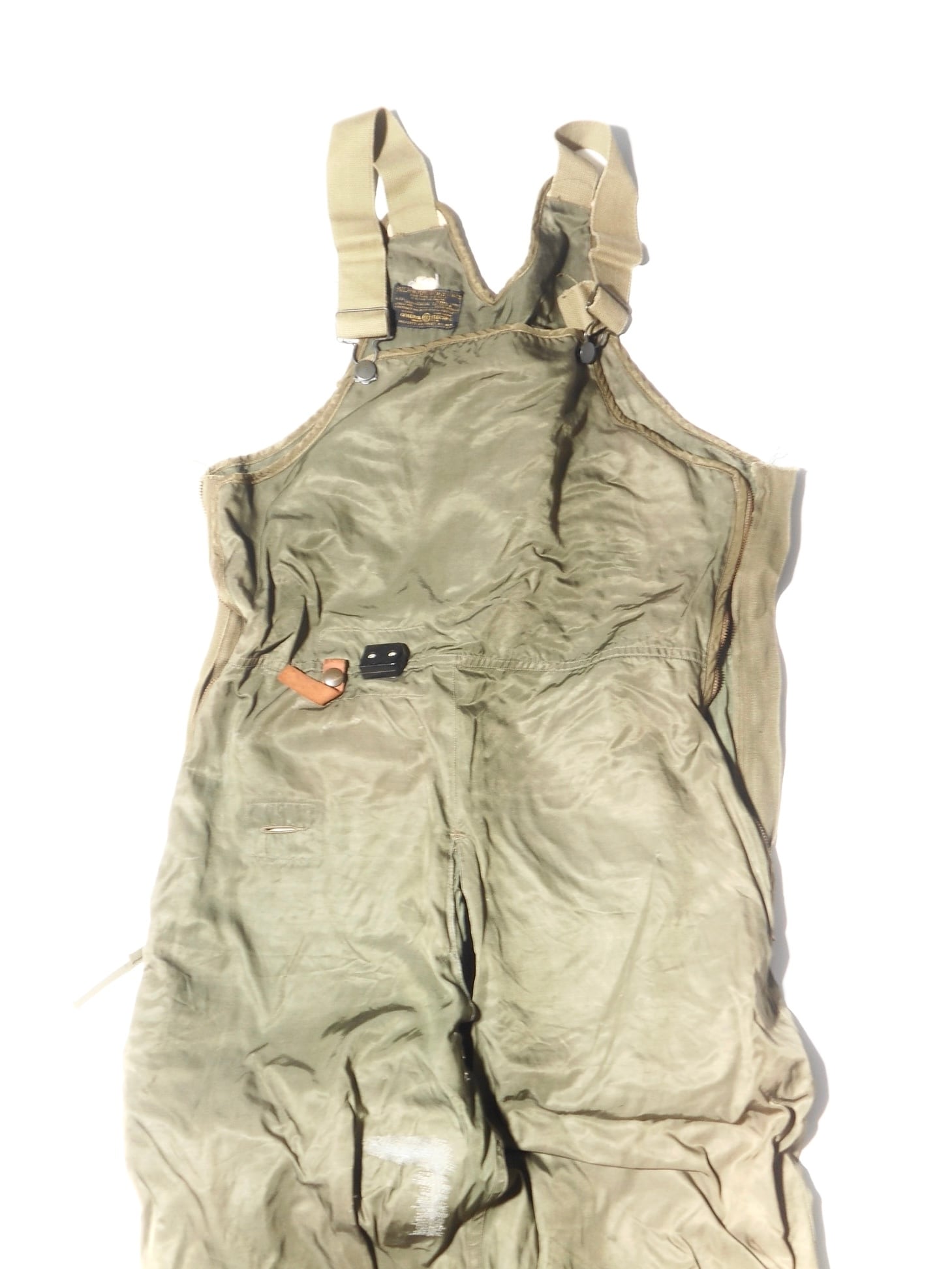 電熱グローブ等との接続プラグや配線用タブといった精密な設計は、General Electricの技術力の象徴です。インナー用の無駄のないシルエットは現代でも高く評価されています。安全のために電熱線が抜かれた個体であっても、そのステッチ跡や素材感からは、当時の最先端技術で空の戦いに挑んだ歴史の断片を感じ取ることができます。