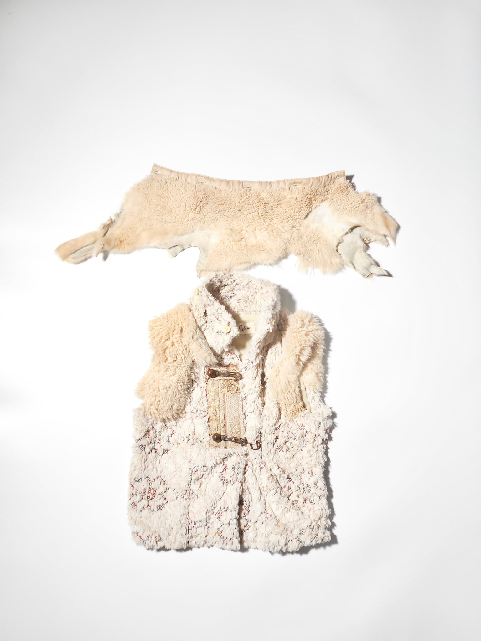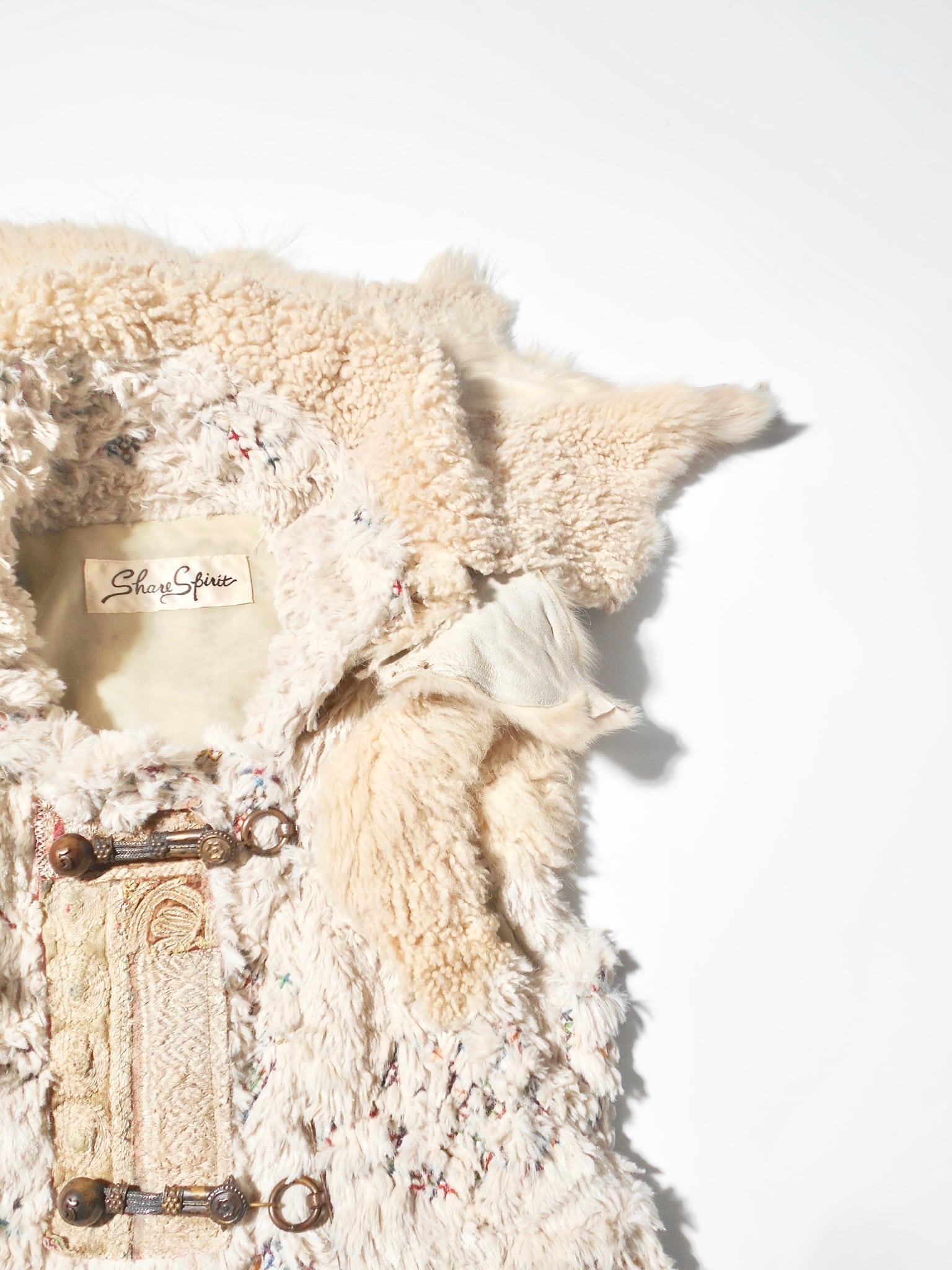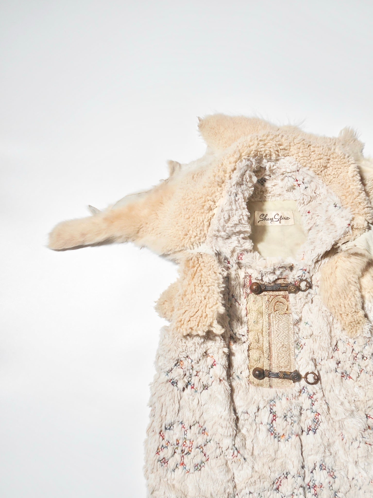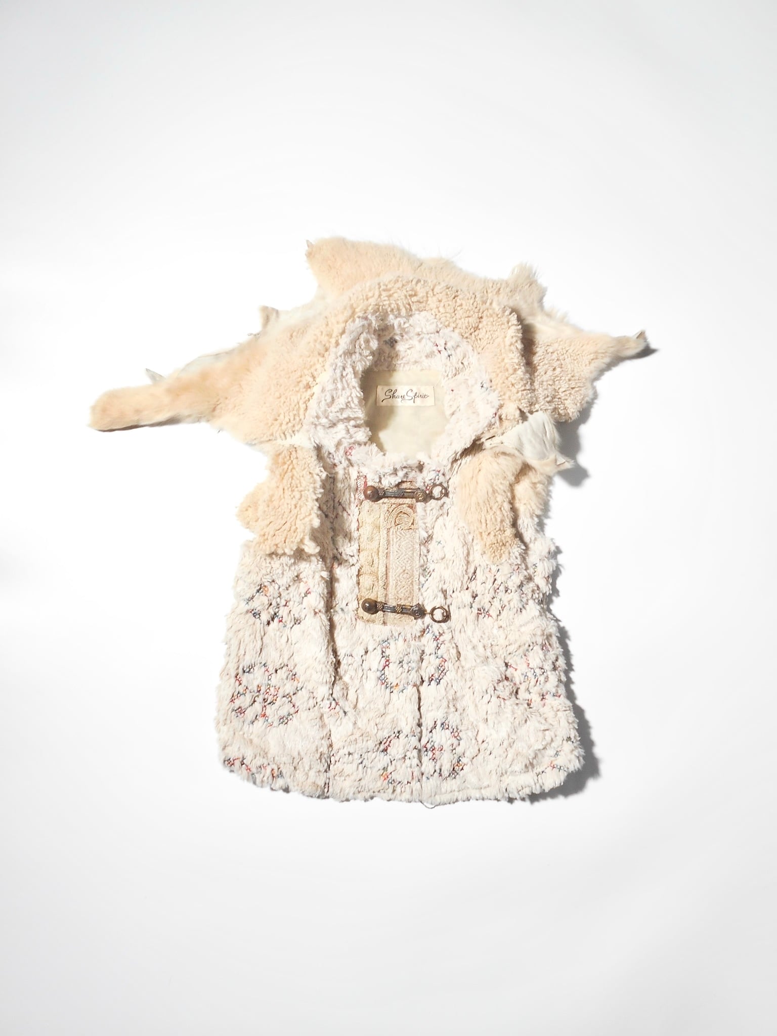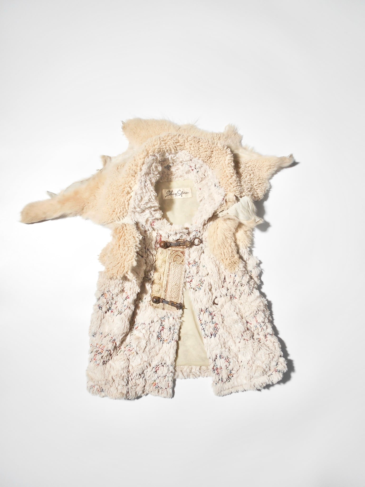 Share Spiritは、デザイナーの片野光氏が1990年代後半に立ち上げた日本のファッションブランドです。その最大の特徴は、デザイナー自身が世界中を旅して巡り合ったアンティークの資材や、ヴィンテージのテキスタイル、異国の文化からインスピレーションを得た独特の世界観にあります。退廃的でありながら高貴な美しさを漂わせるミリタリー要素や、民族的なディテールを融合させたデザインは、唯一無二の存在感を放っています。