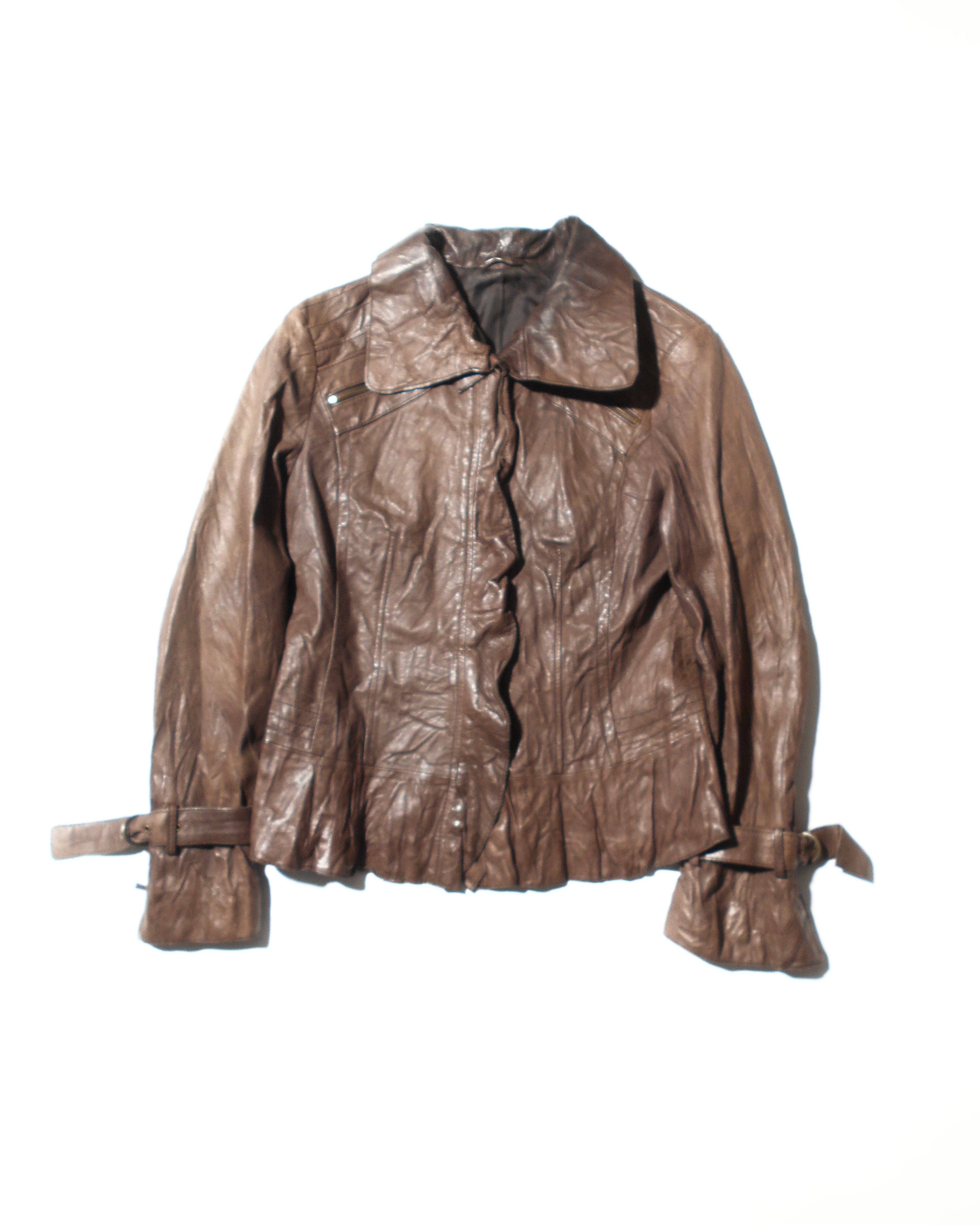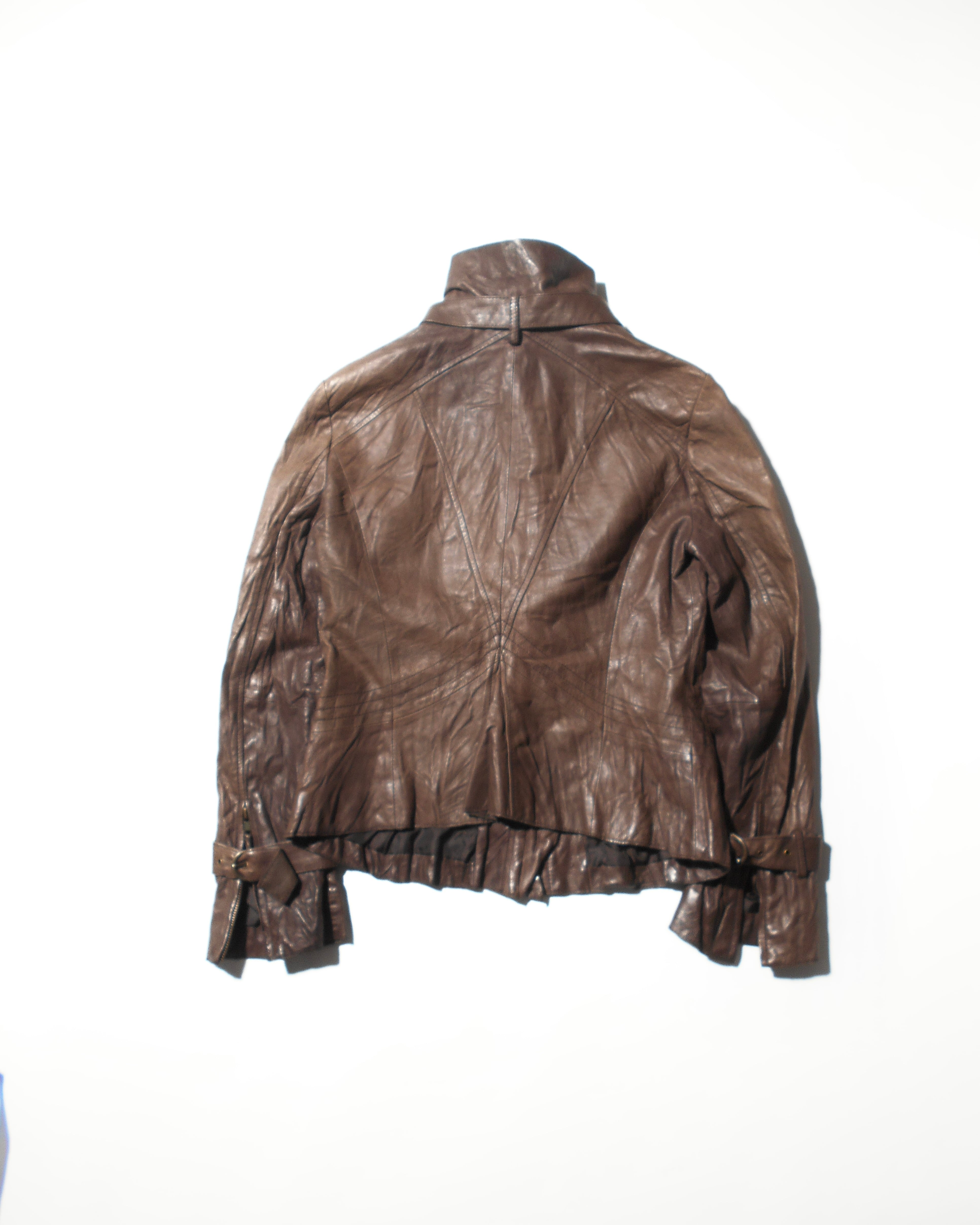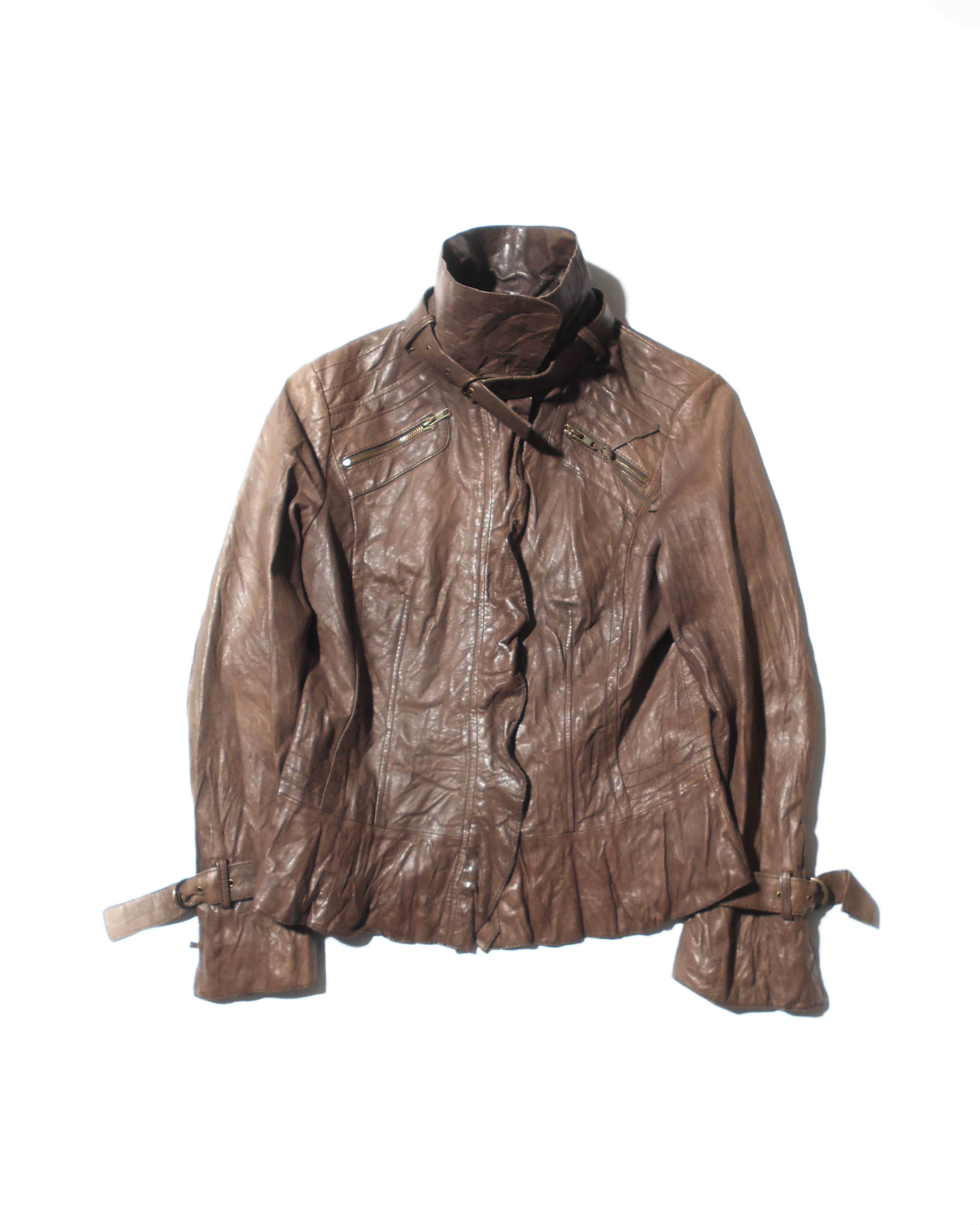 1990s Italian Vintage Faded Dark Brown Wrinkled Leather Jacket w/Chin Strap&Belts