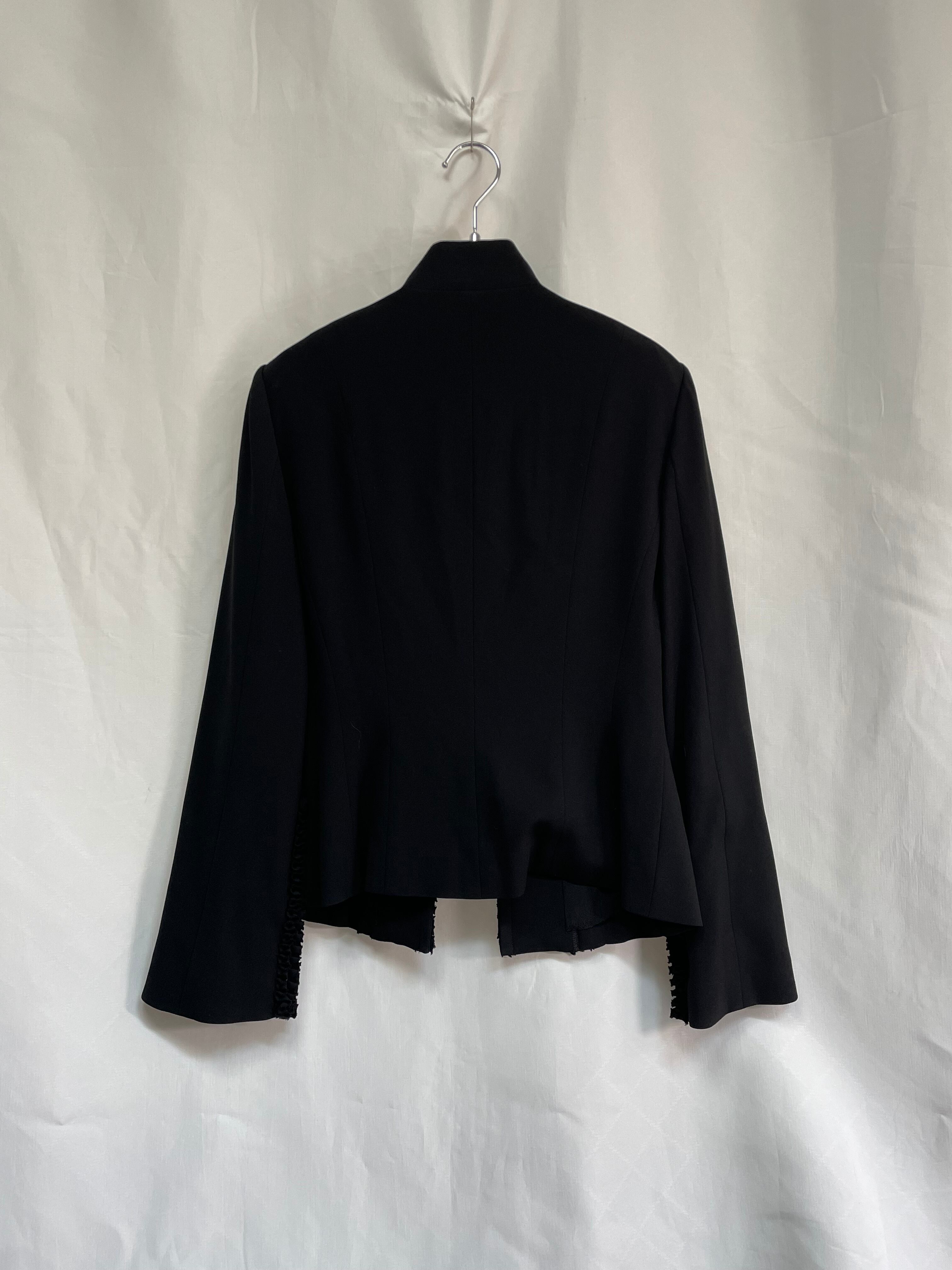この一着にもその精神性がよく現れ、胸元から袖にかけたフリルや背面のシェイプのかかったカッティング、前下がりのパターン等からも見受けられるかと。