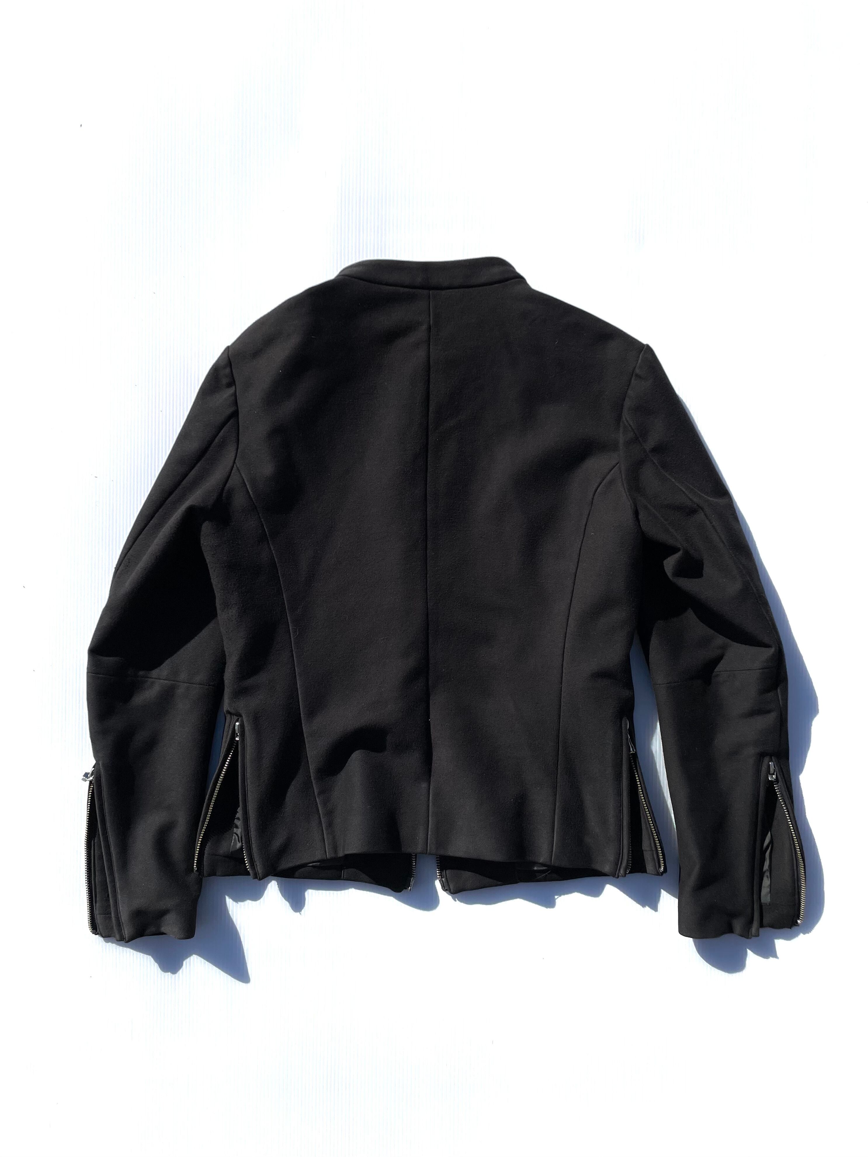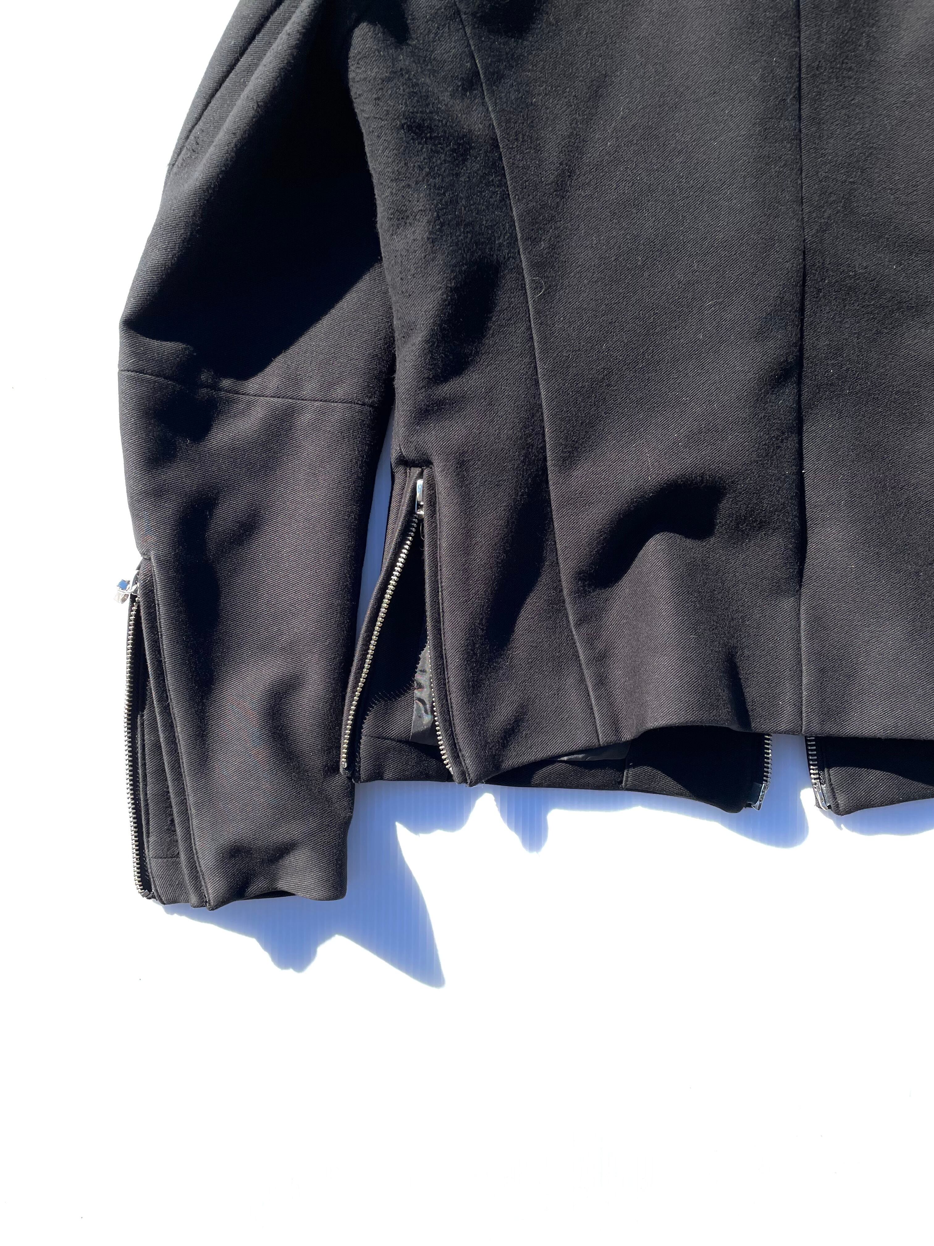このジャケットをそのコンセプトから見てみると、サイドのジップの開閉によって作られるシルエットは骨格に沿ったシルエットを作っているようにも感じられ、そのダブルジップも身体の動きや骨格を表現するために用いられているように見えるかと。装飾を極限まで削ぎ落とし、カッティングやパターン、細部のディティールのみでデザインを行なっているという点も飾らないマスキュリンさの表現でもあるように見えます。